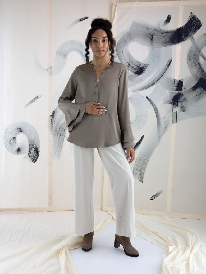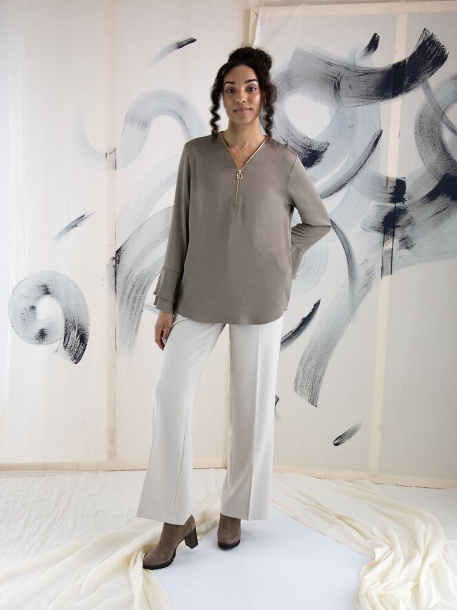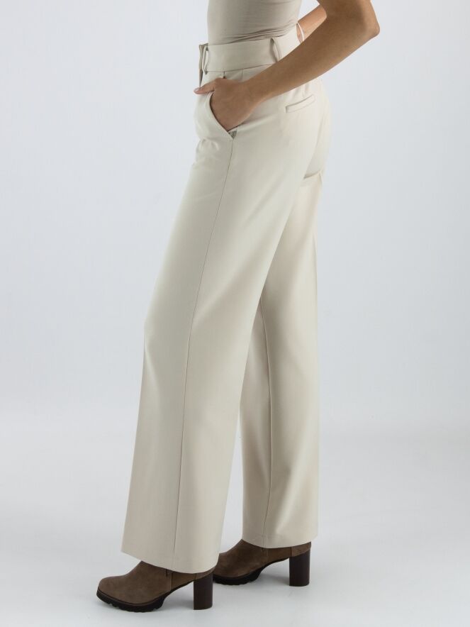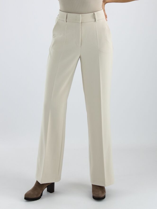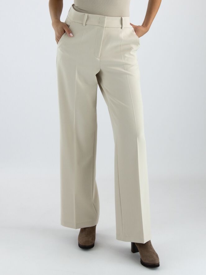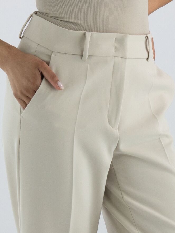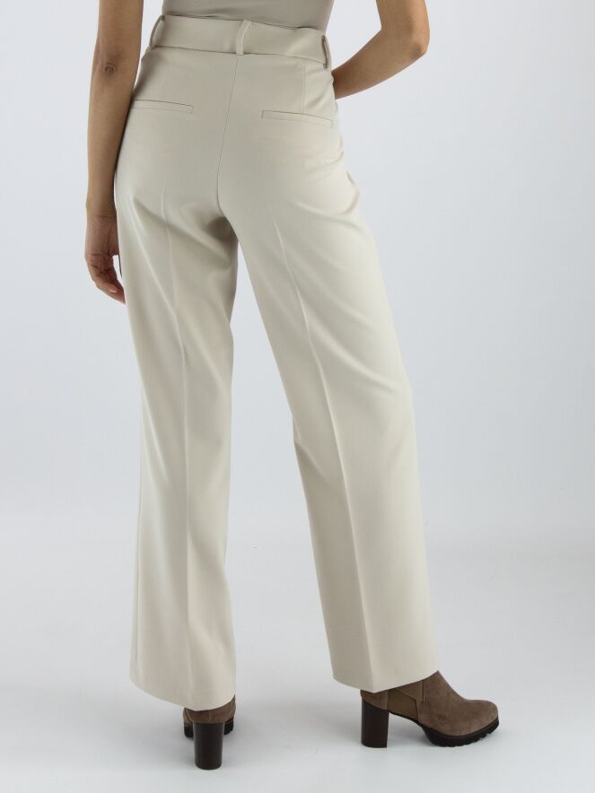 A luxurious straight-cut trouser from Cambio in a sand color. There is a creased pleat down the center of the legs. The trousers have slash pockets and can be hand washed.