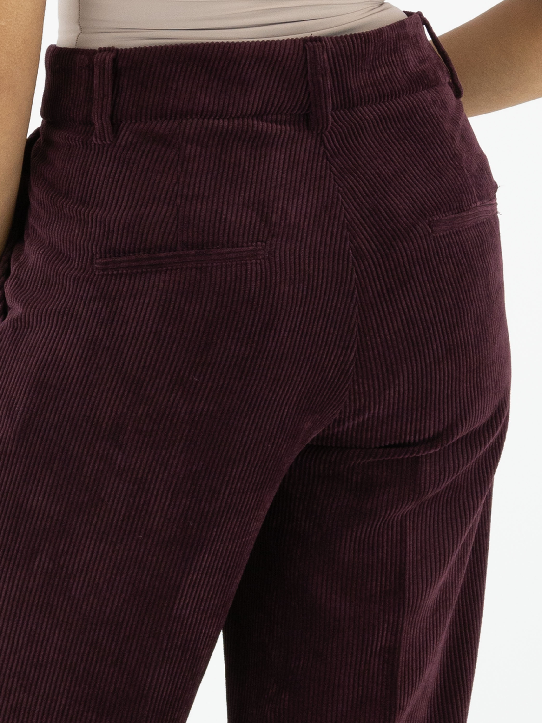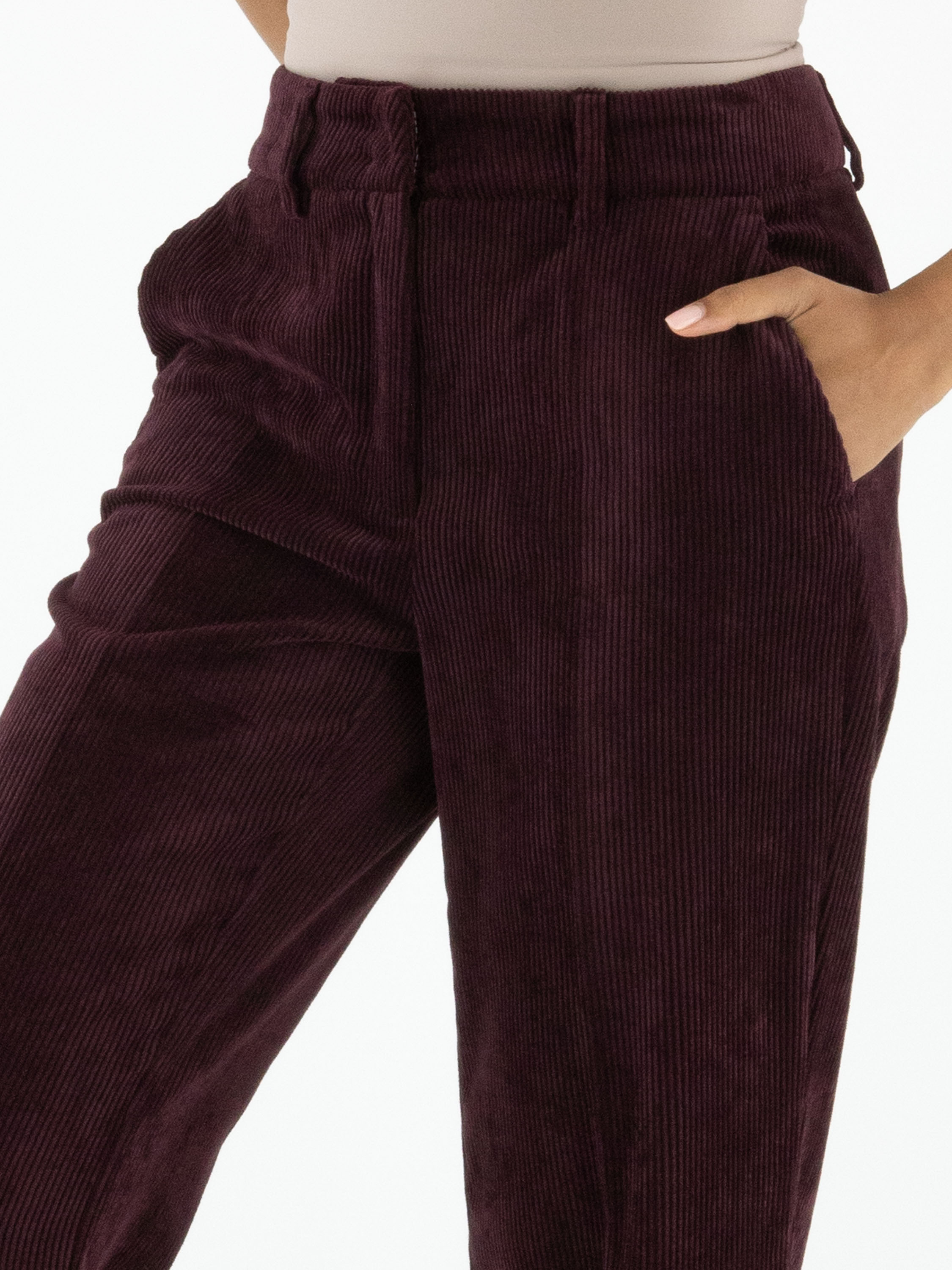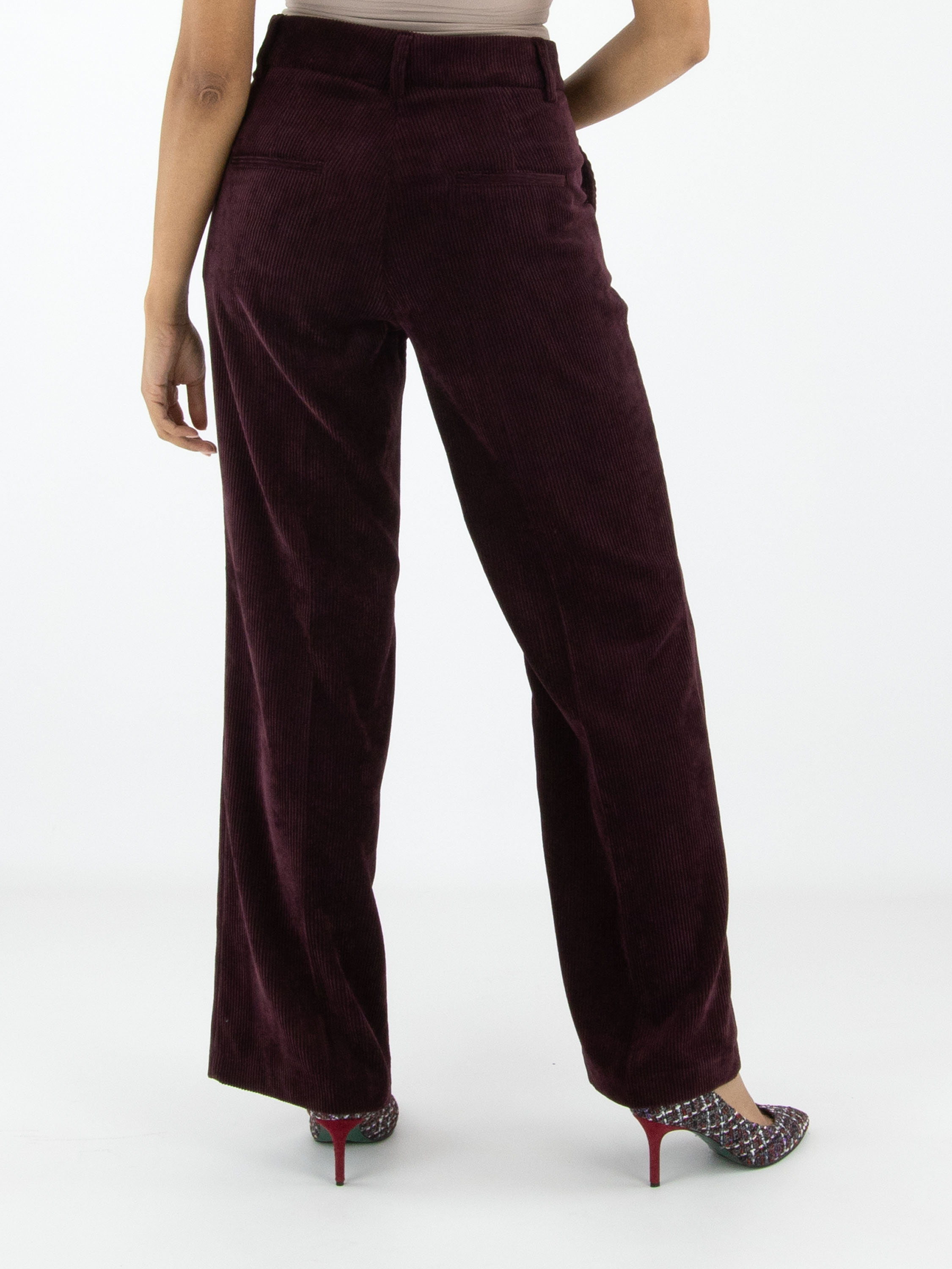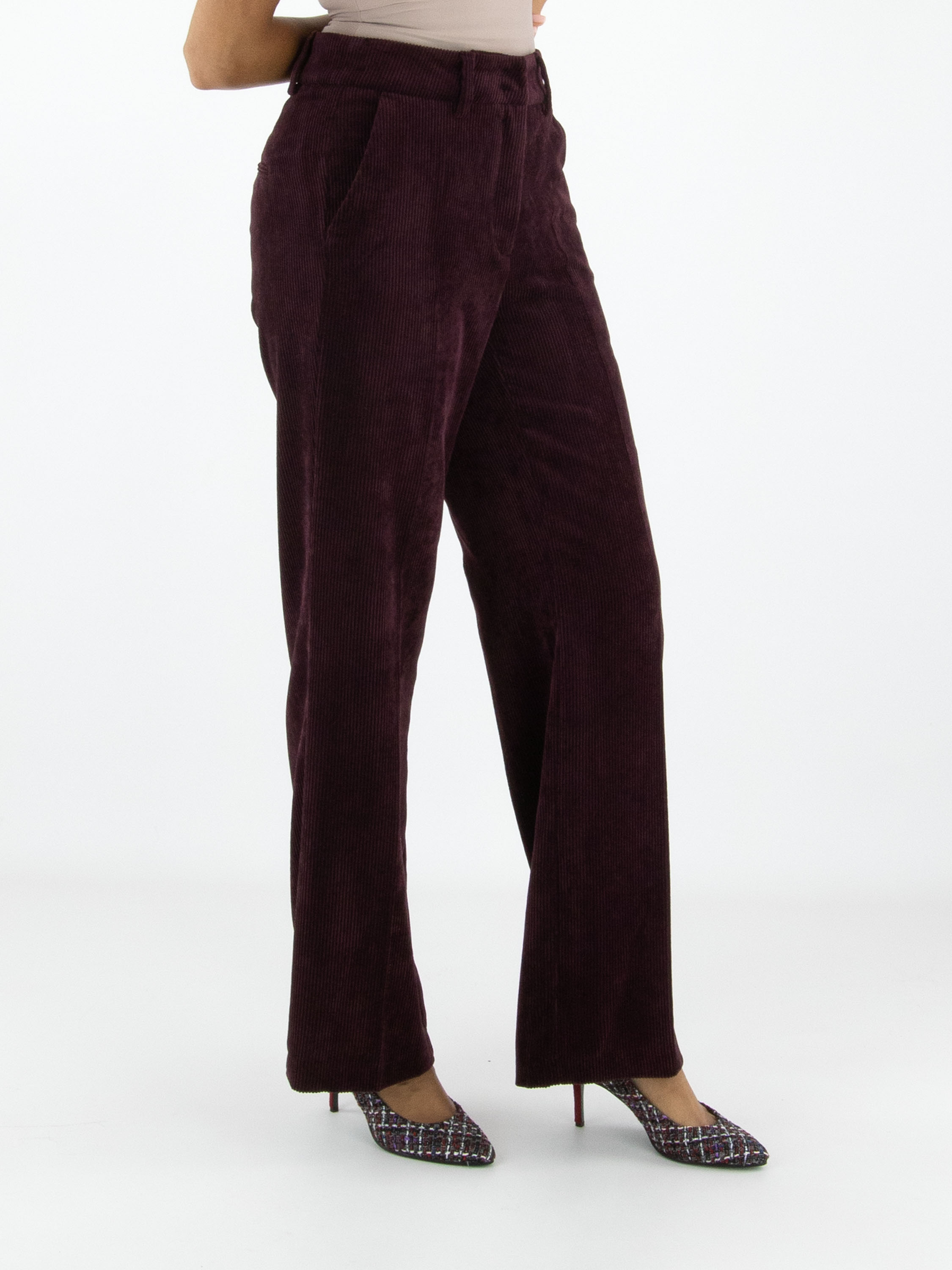 Luxury straight-leg corduroy trousers by Cambio in an aubergine-red shade. A pressed crease runs down the centre of the legs. The trousers feature side pockets and should be hand-washed.