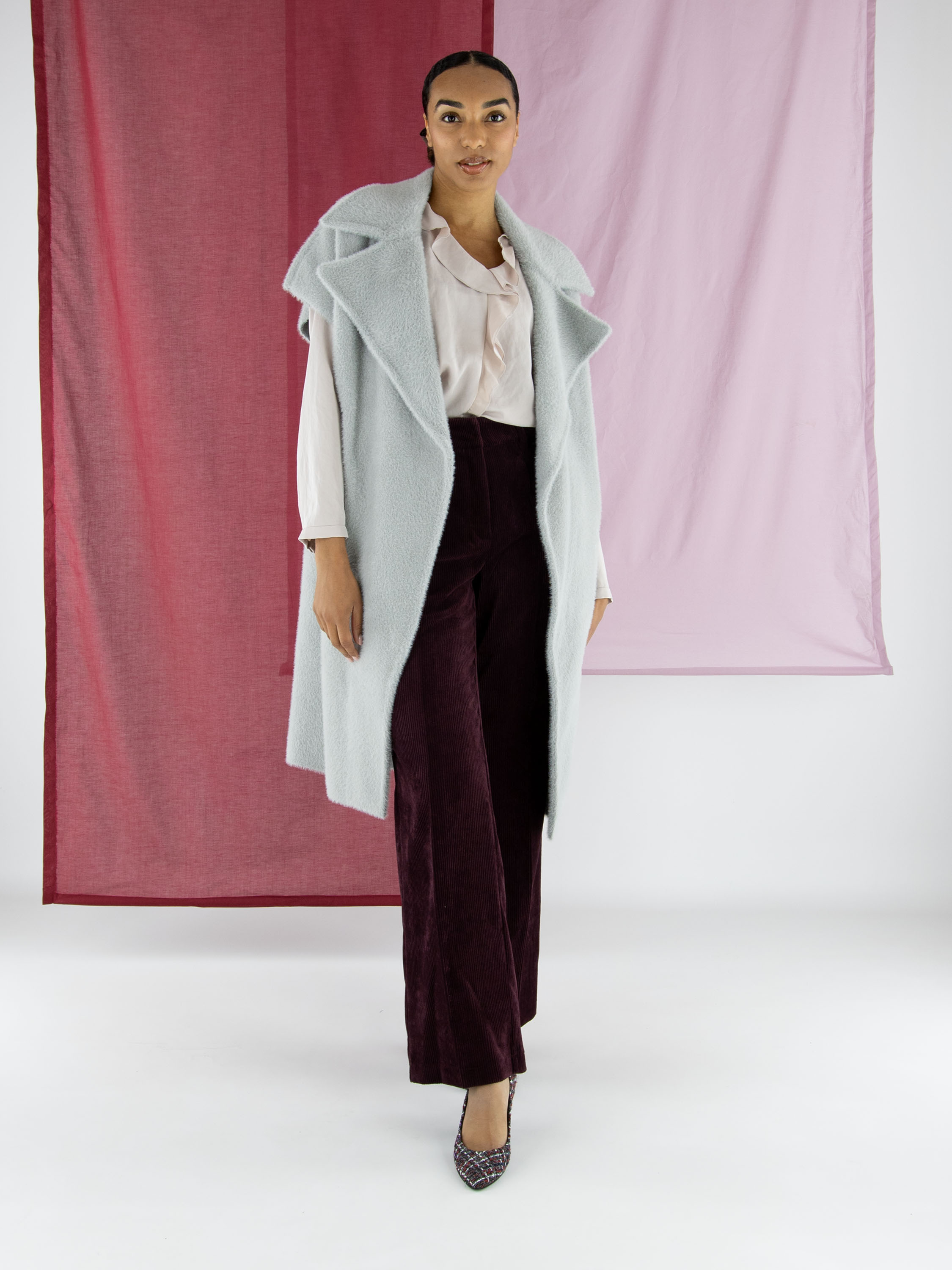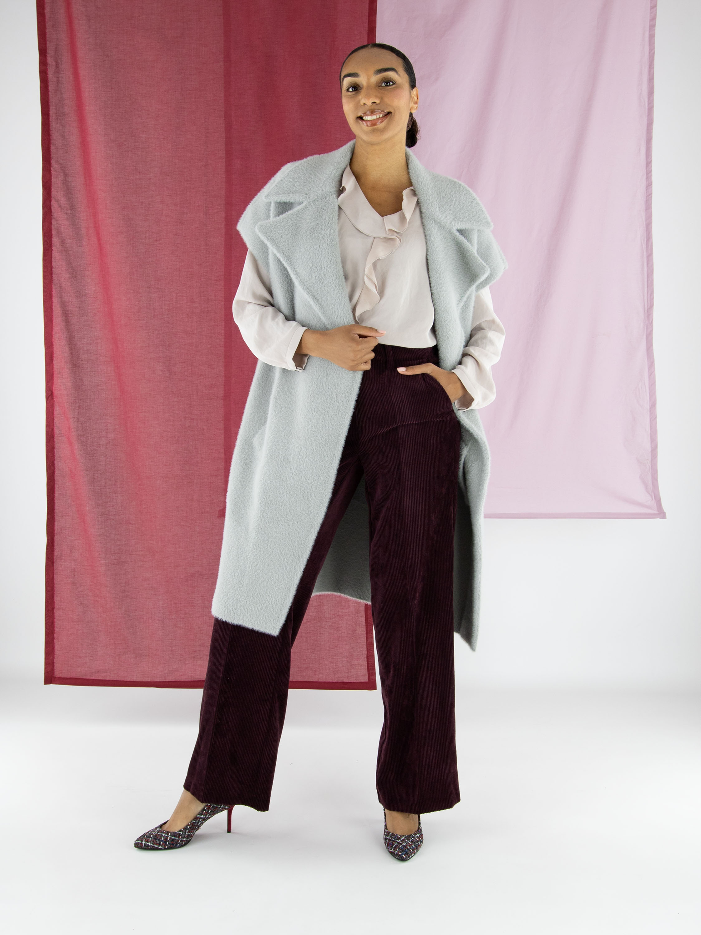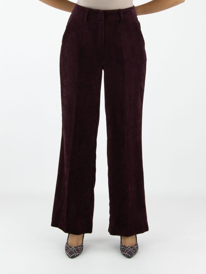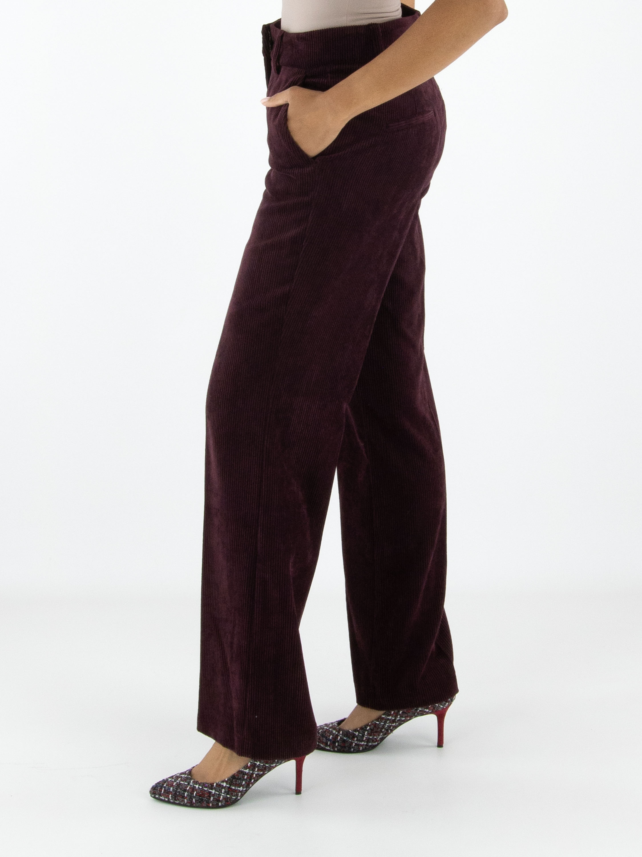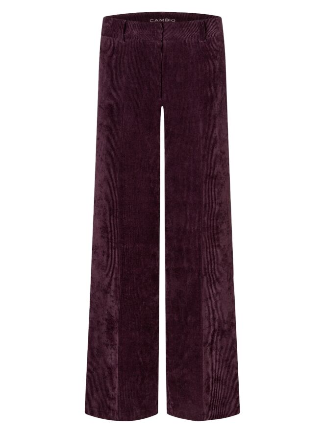 Luxury straight-leg corduroy trousers by Cambio in an aubergine-red shade. A pressed crease runs down the centre of the legs. The trousers feature side pockets and should be hand-washed.