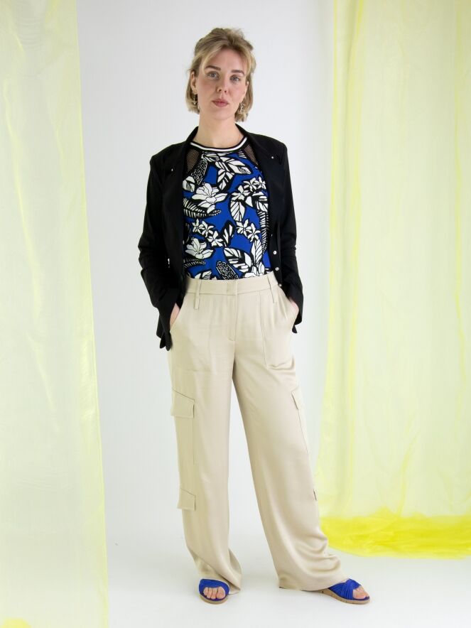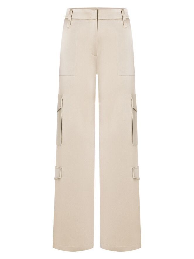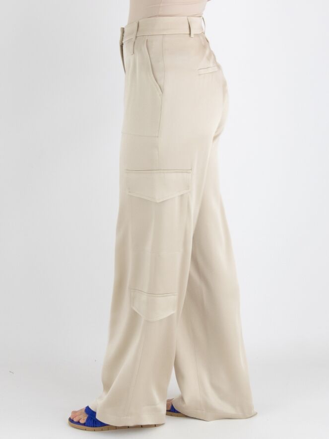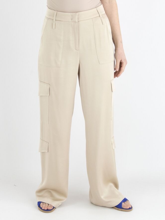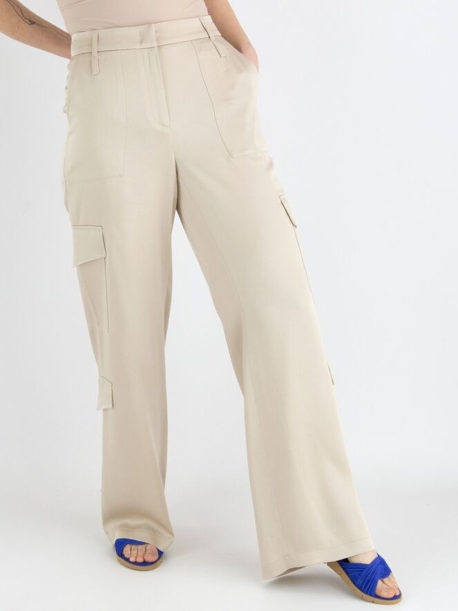 A wide cargo pants made of matte satin from Cambio in beige. The pants feature pocket flaps on both the upper and lower legs. There are also side pockets below the waist, and this pants can be hand washed.