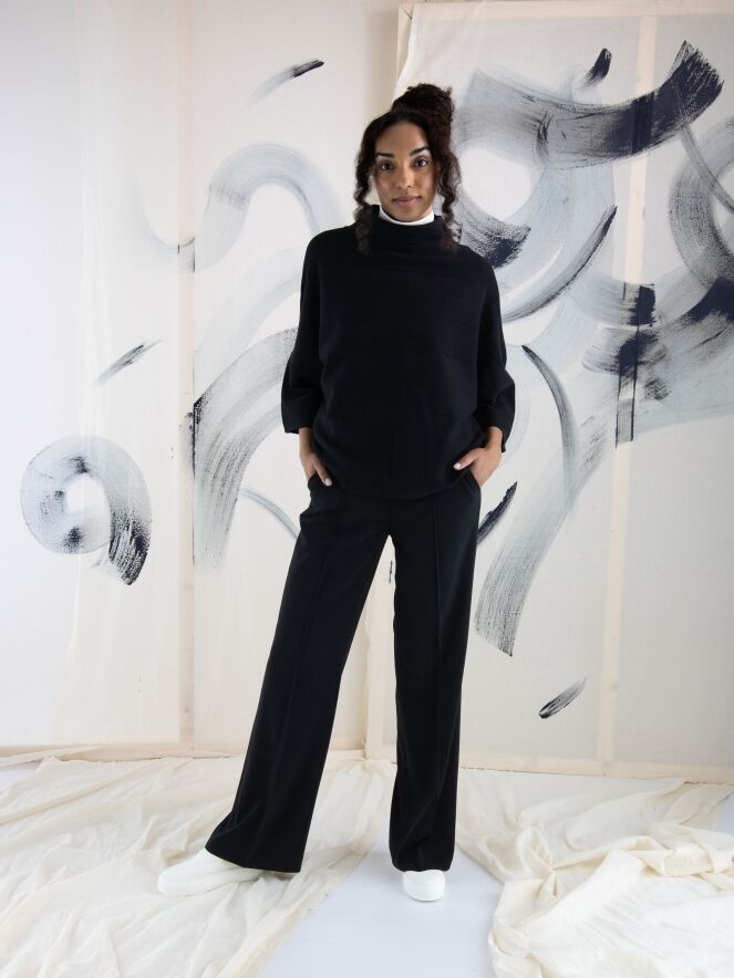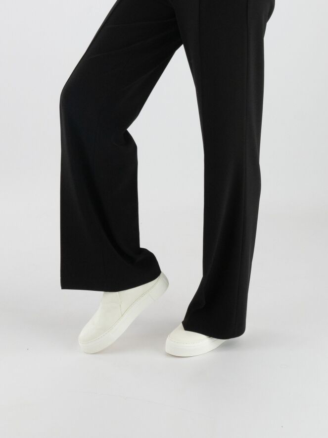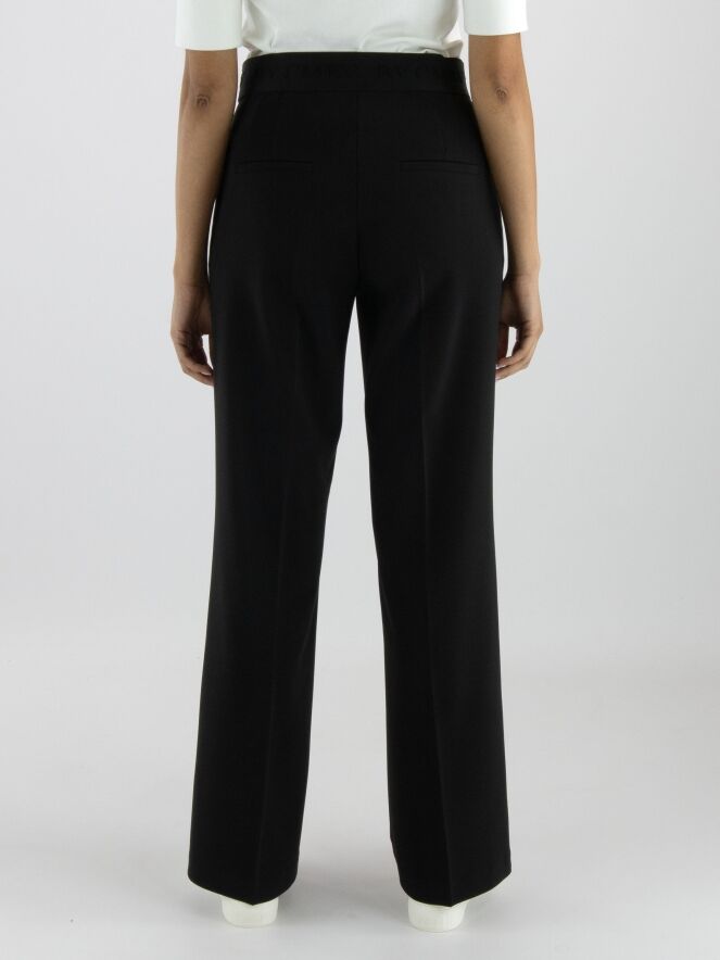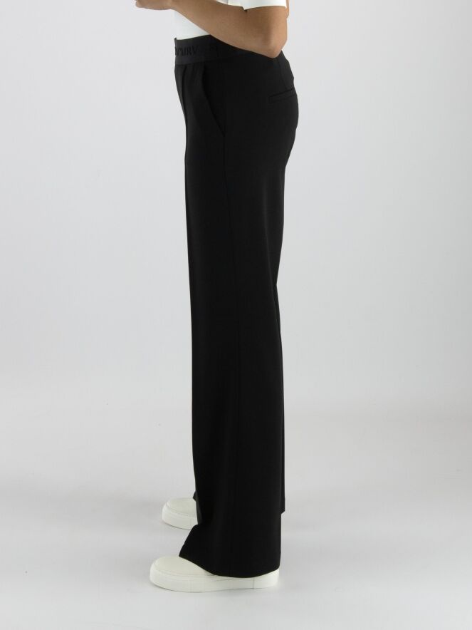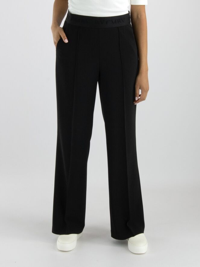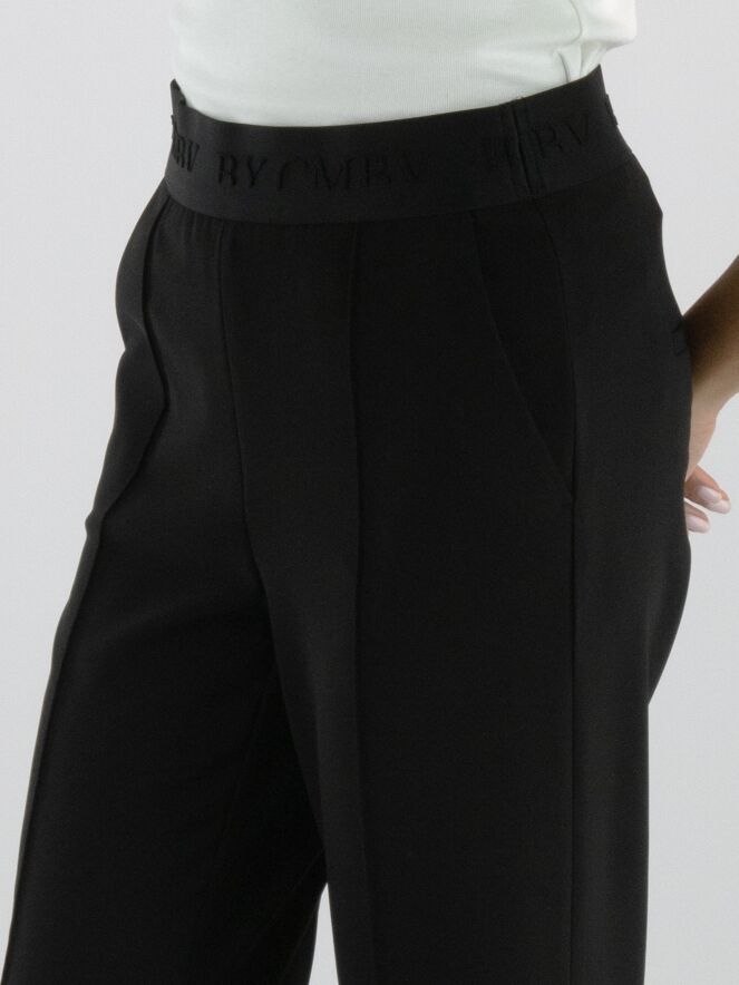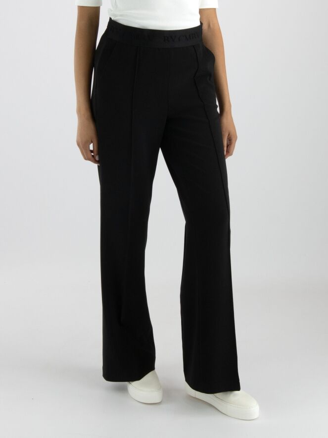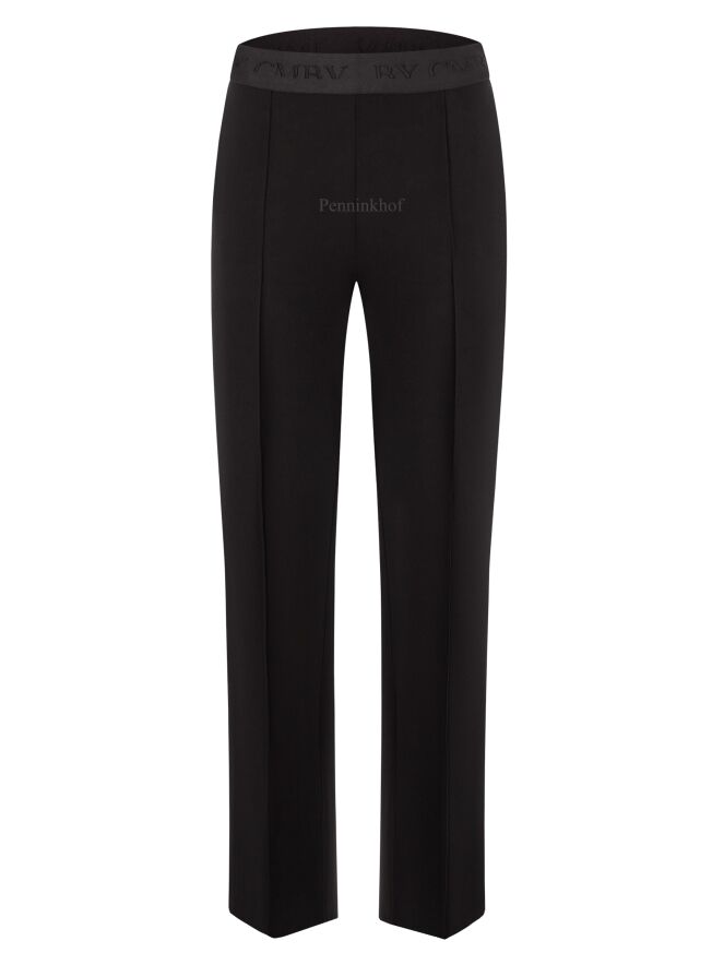 Pants from Cambio in the color black. At the waist is an elastic band. The pants have a straight-cut leg and in the middle of the legs is a stitched seam. The pants have side pockets and can be washed at 30 degrees.