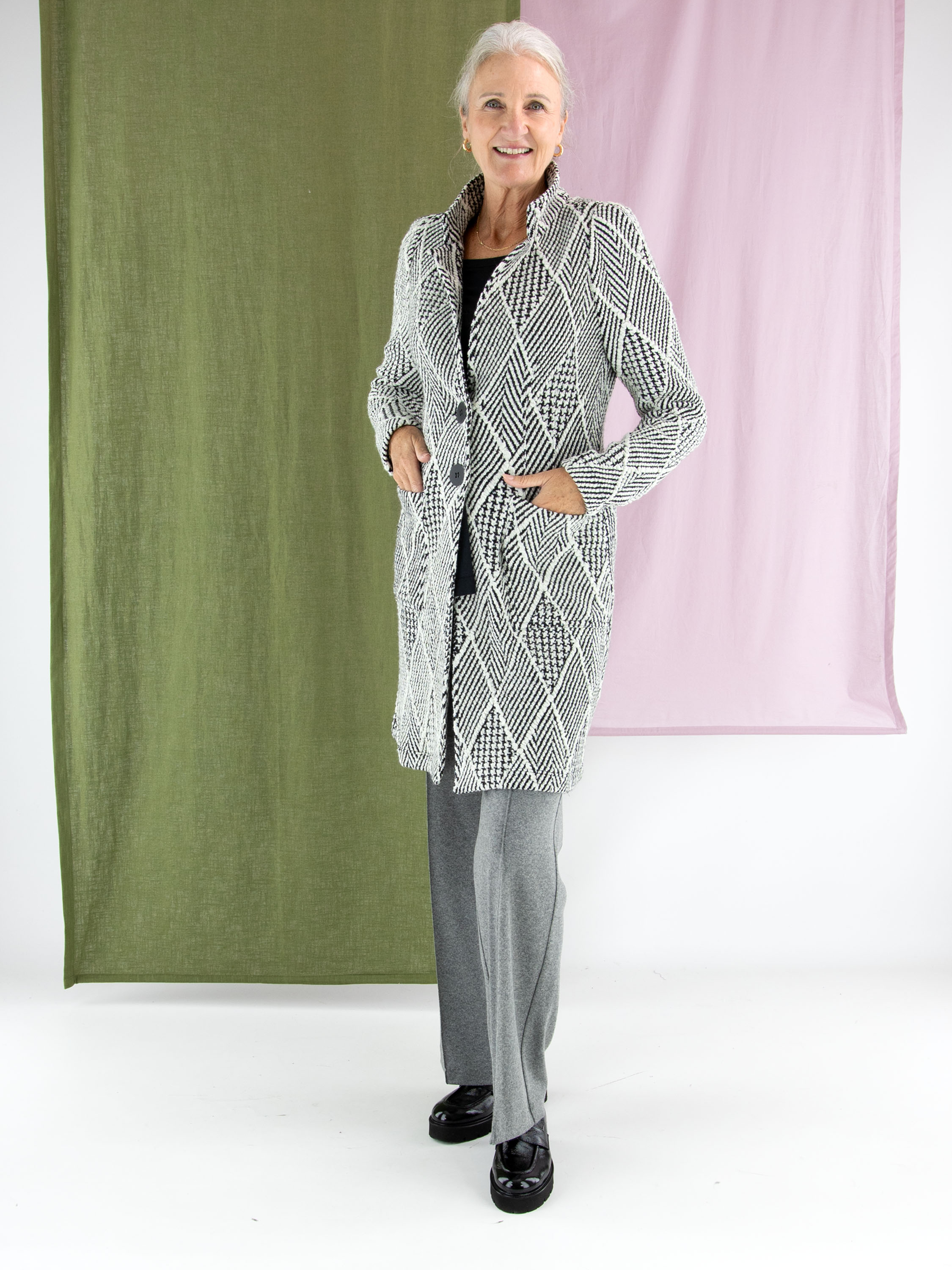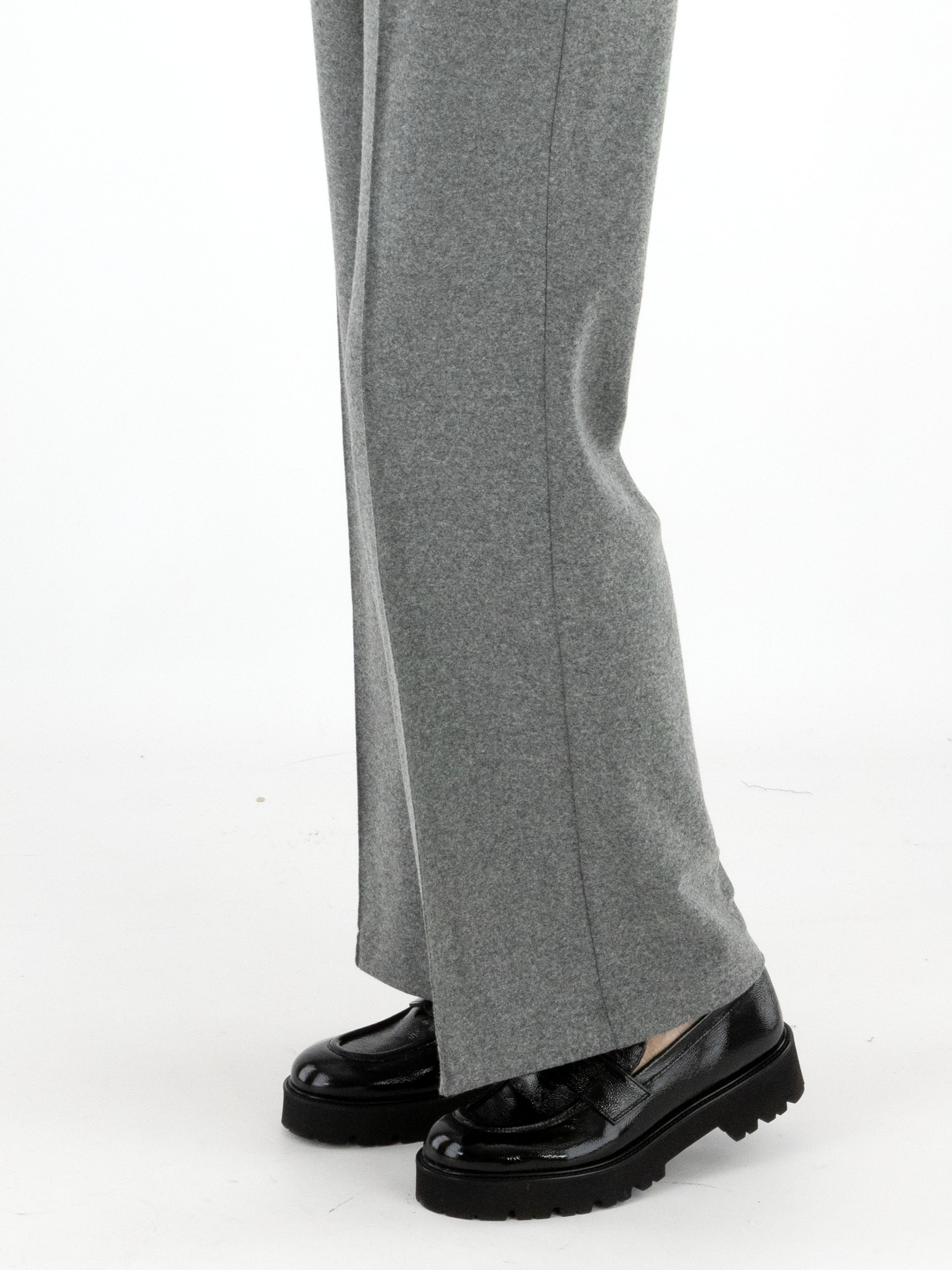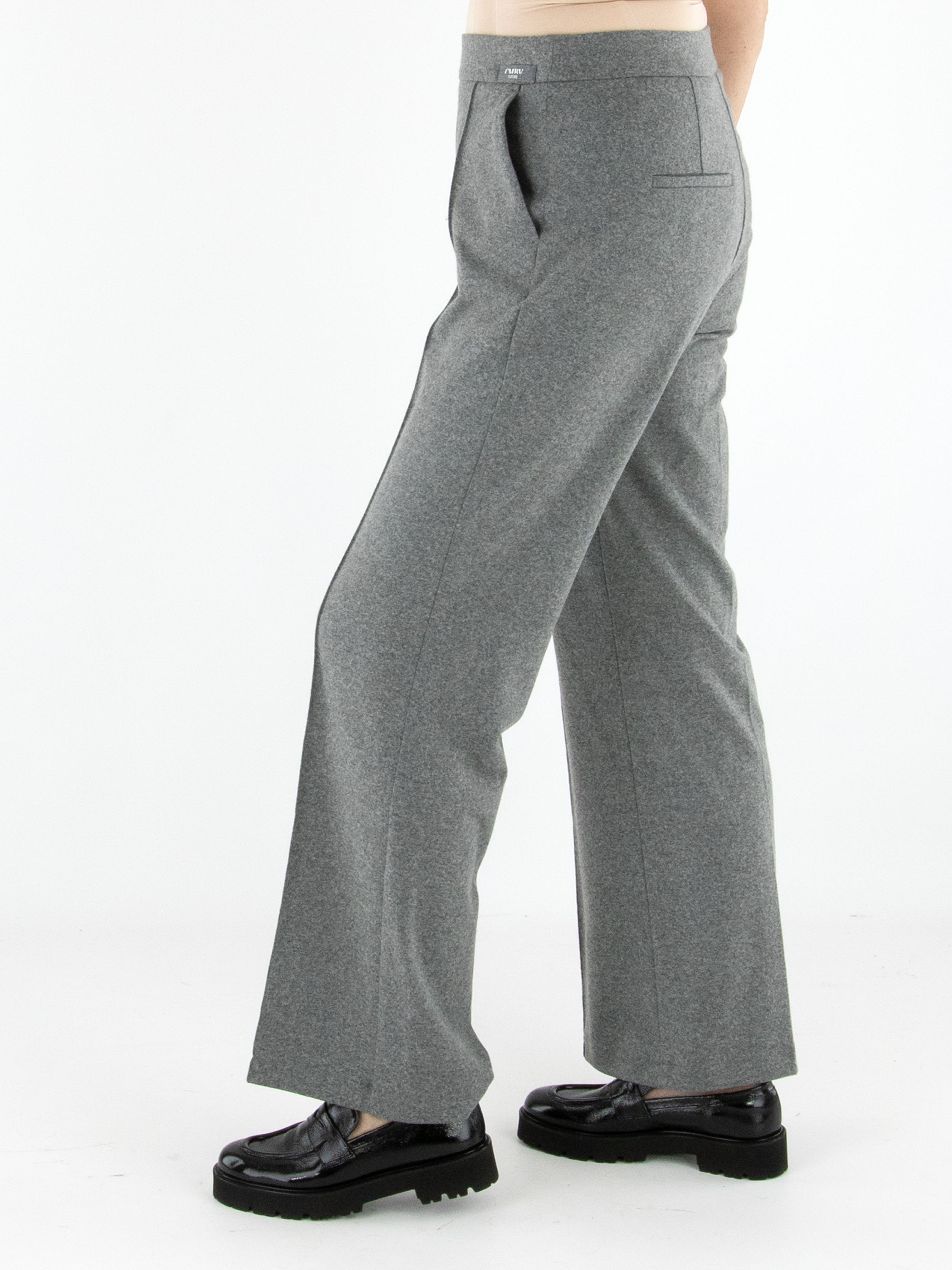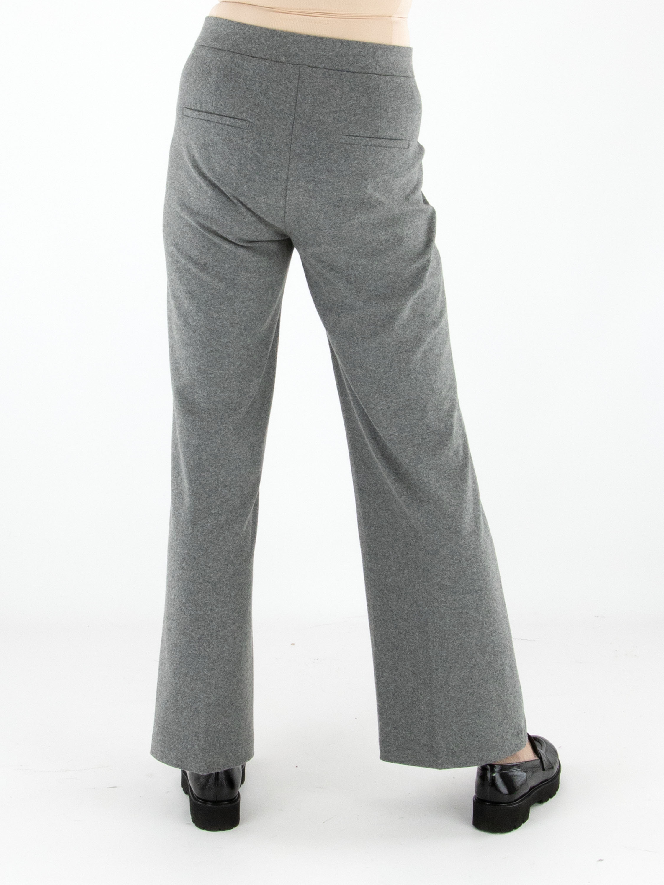 A luxurious flannel trouser from Cambio in grey. The waistband features a comfortable elastic band. An inverted seam runs along the center of the legs, giving the trousers a modern look. The design is completed with practical slit pockets. These trousers can be hand-washed.
