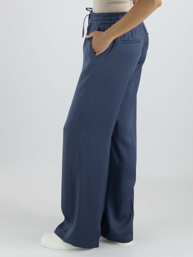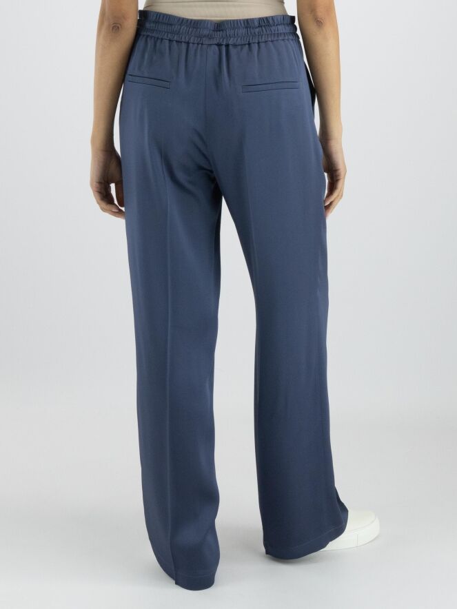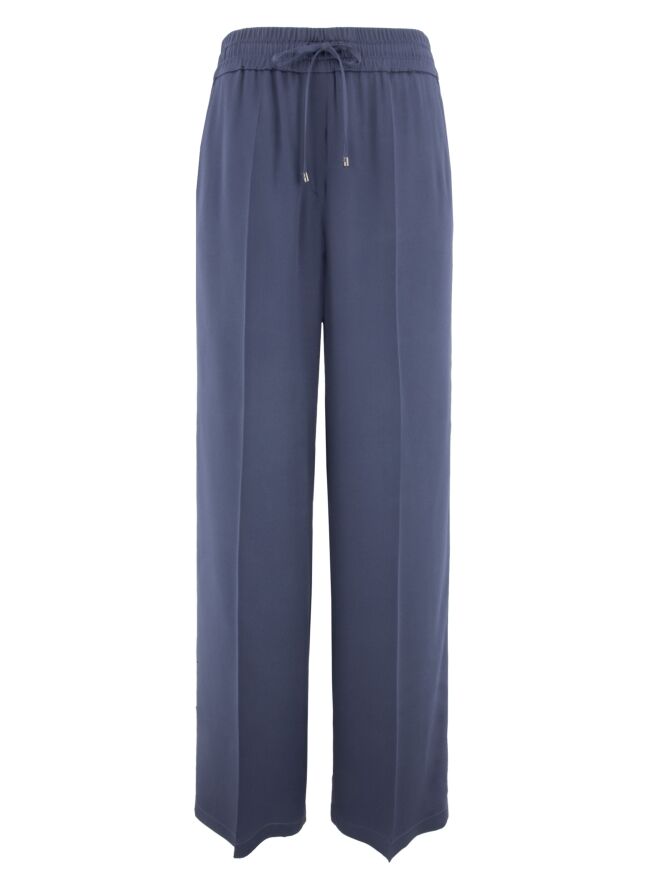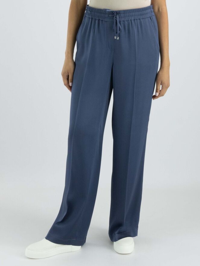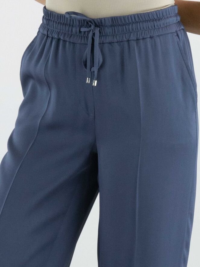 A luxurious matte satin trouser from Cambio in petrol blue. The waist features a finely ribbed elastic band with a drawstring in a tunnel casing. The trousers have slash pockets and a creased pleat down the center of the legs. These trousers can be hand washed.