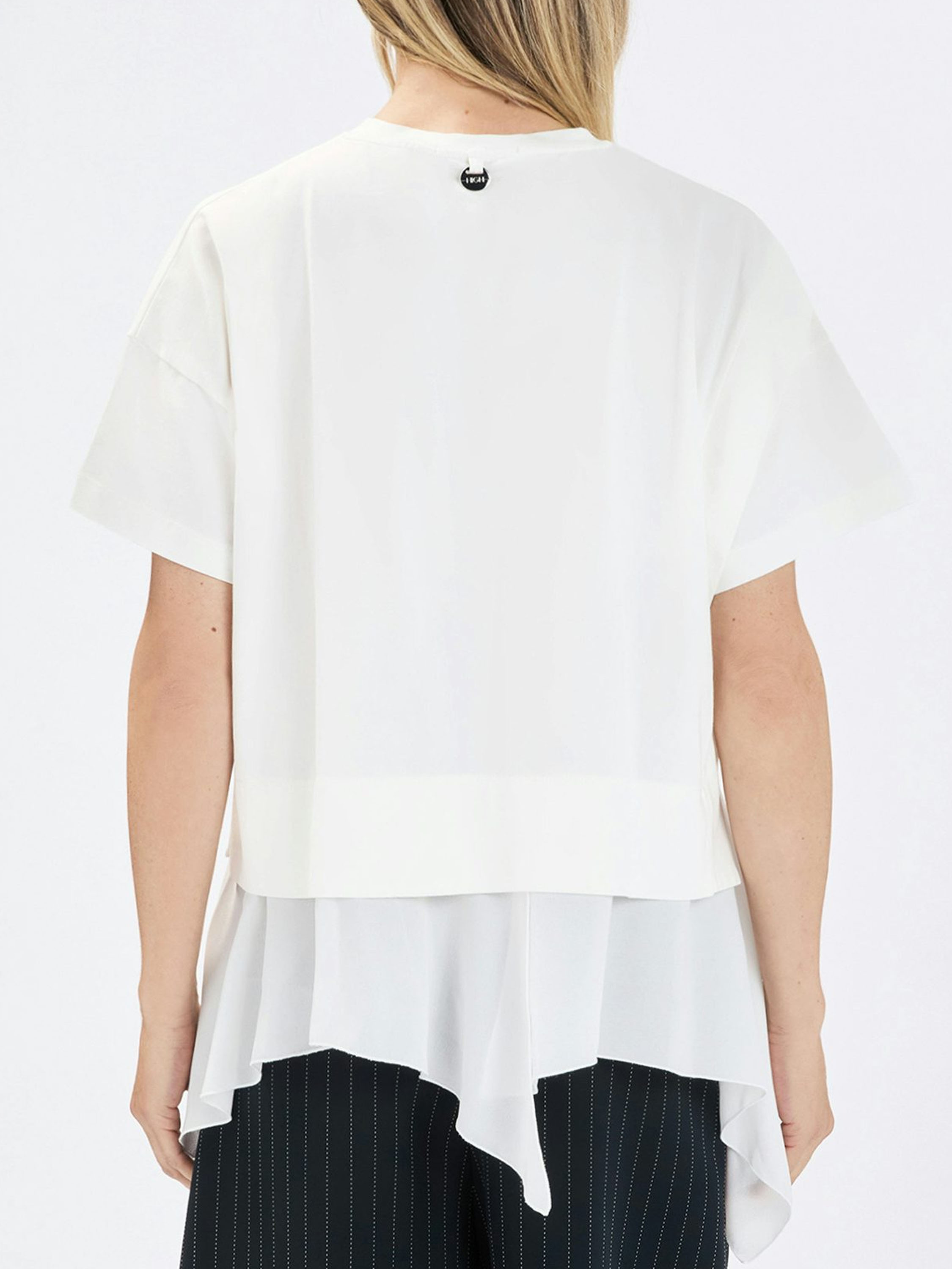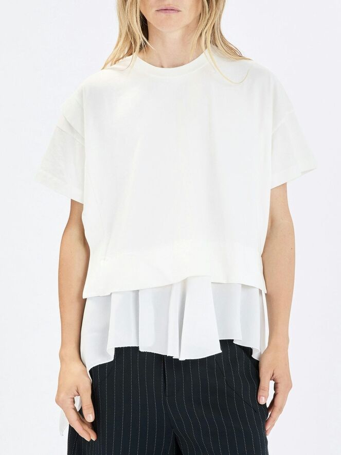 Shirt by High in off-white. Designed with a round neckline and short sleeves, it features a seam along the right side from which the fabric subtly extends, creating a playful and contemporary effect. At the hem, a rounded, pleated voile layer emerges, adding a refined and layered finish. This exclusive designer shirt should be hand-washed.