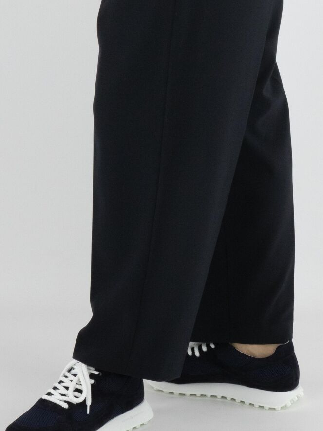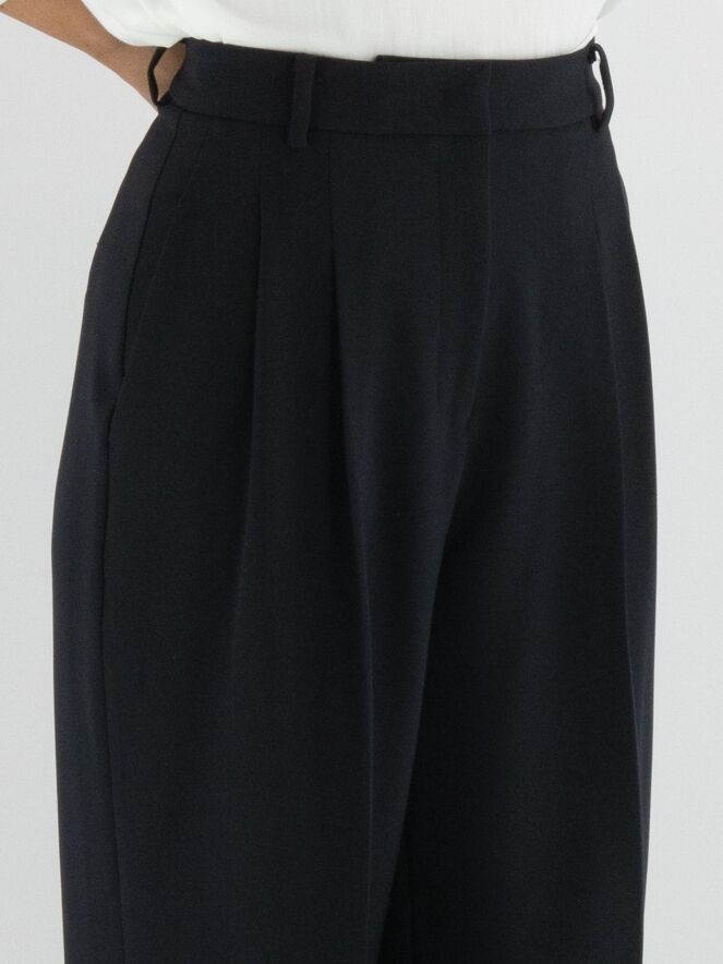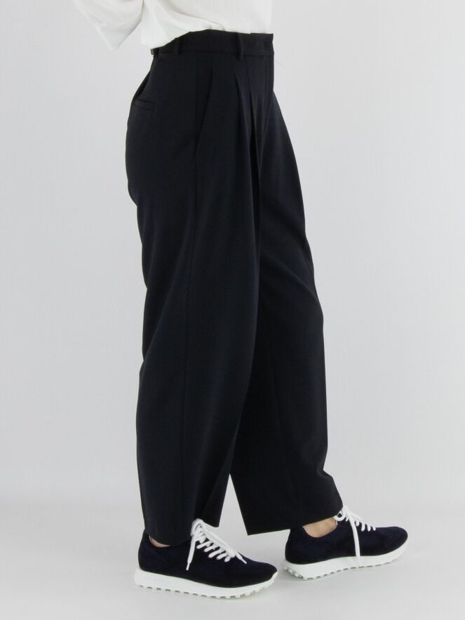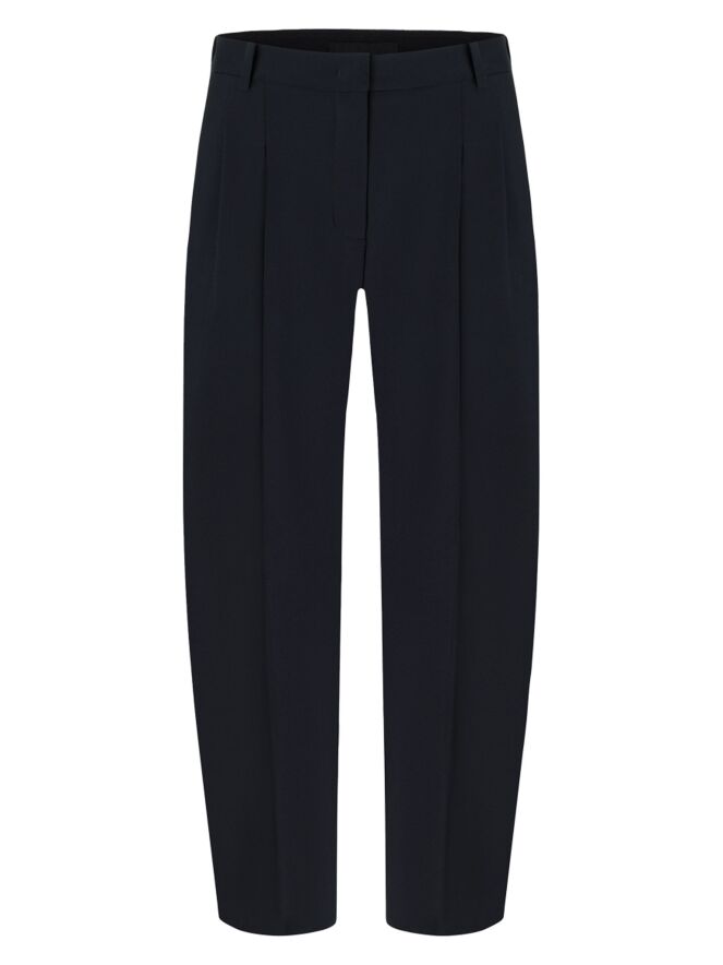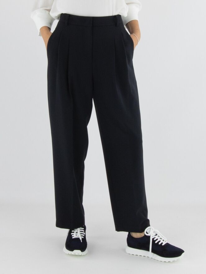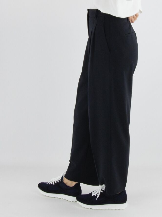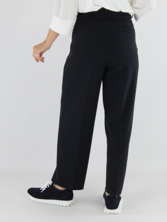 Trousers by Cambio in navy blue. A pressed crease runs down the center of the legs. The trousers feature pleats from the waistband and side pockets. These trousers should be hand washed.