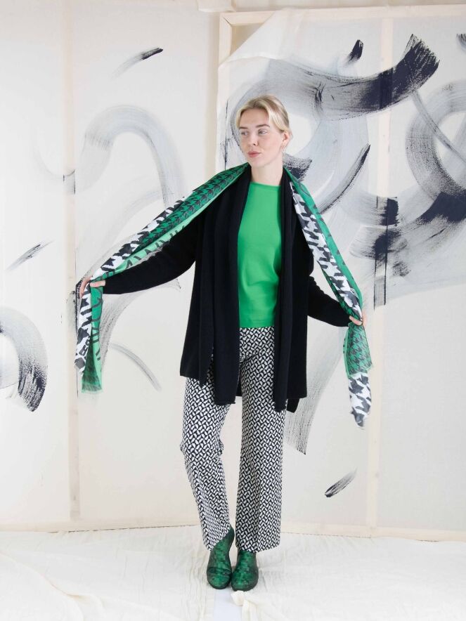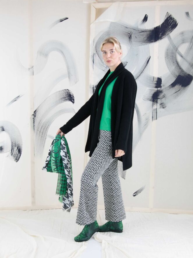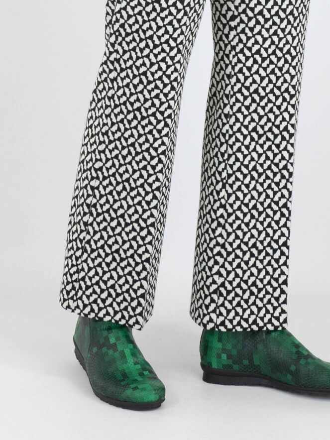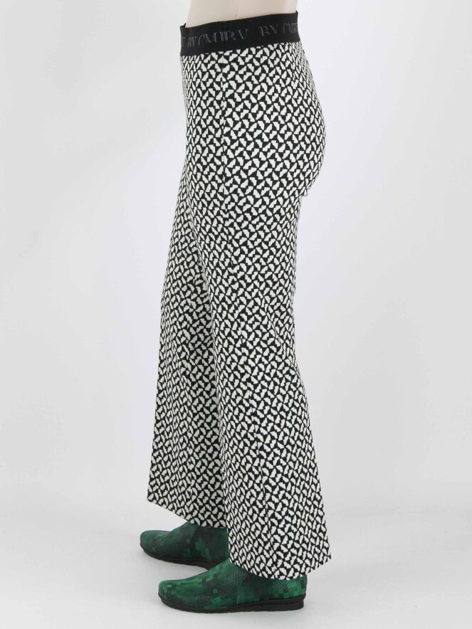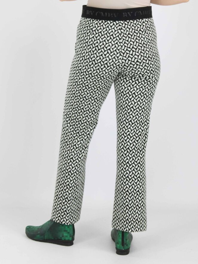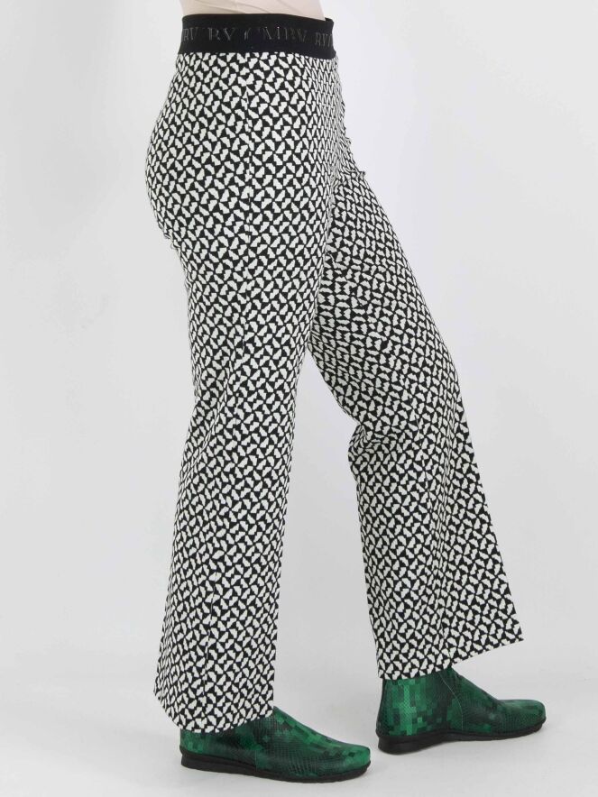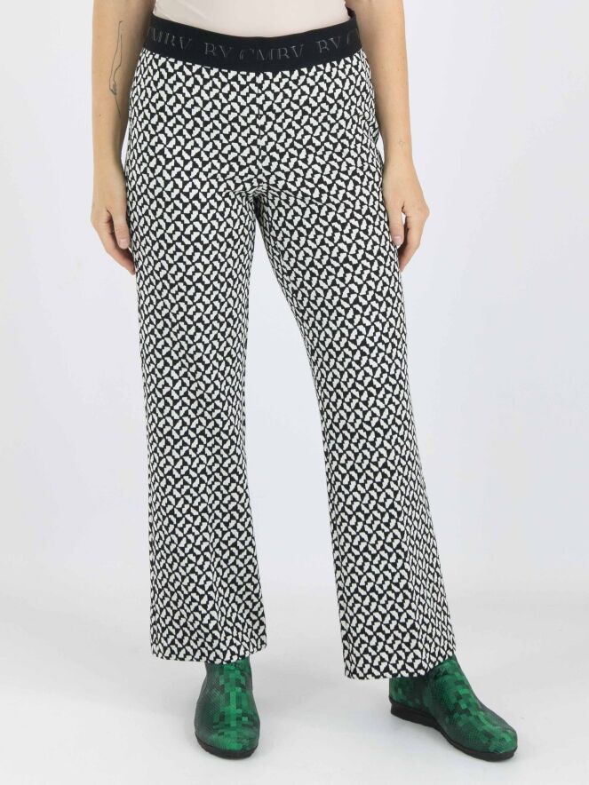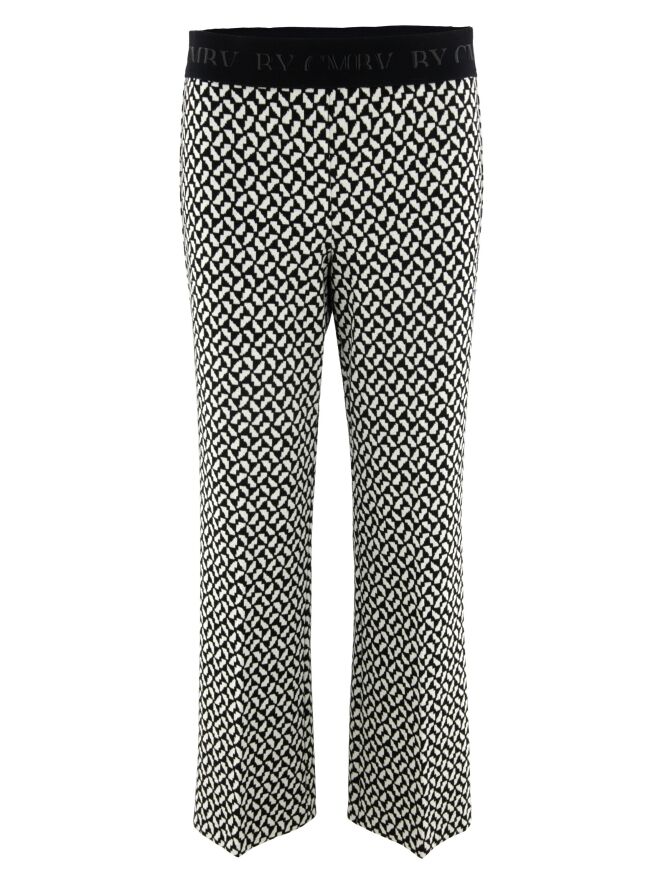 Flared pants by Cambio in a graphic print with black and white colors. The waistband has a black elastic band. These pants can be hand-washed.