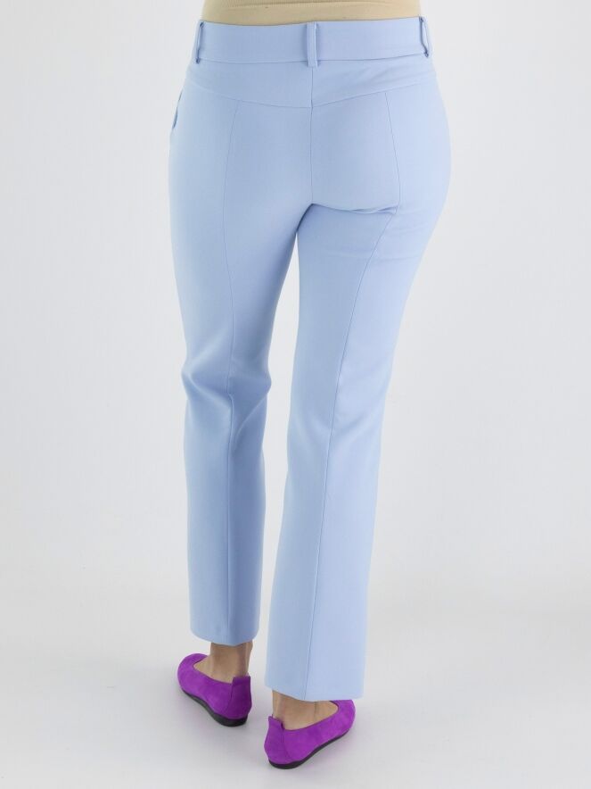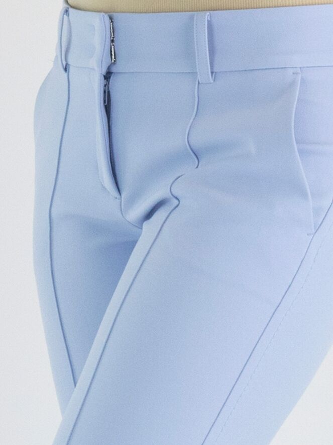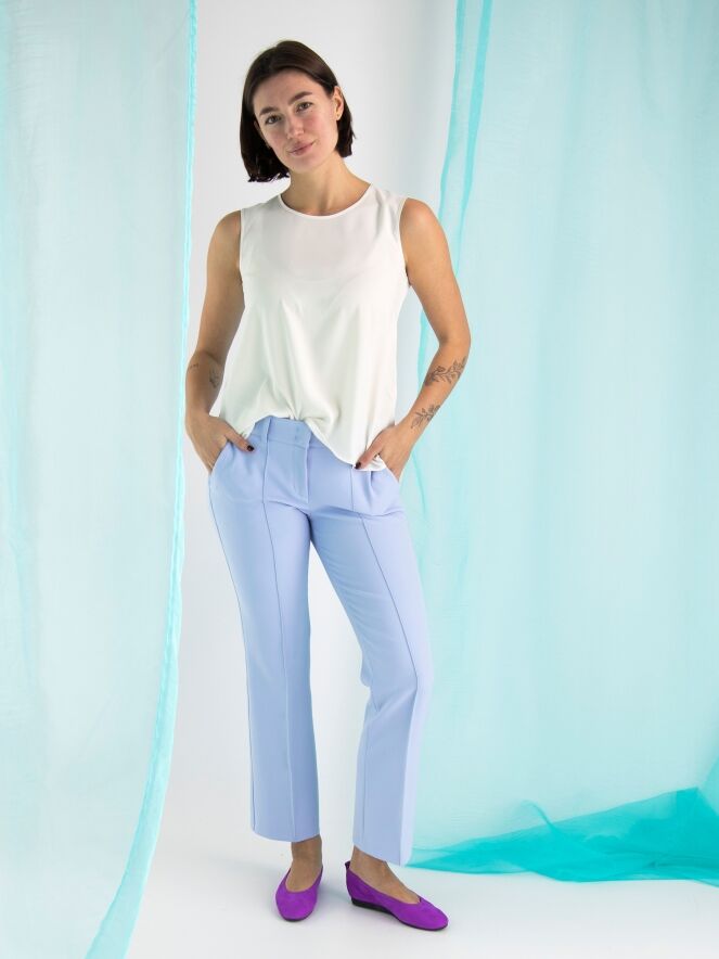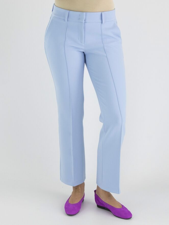 A pair of trousers by Cambio in lavender color. Along the sides, there is a decorative seam. There is also a seam down the middle of the legs. The trousers have side pockets and can be washed at 30 degrees.