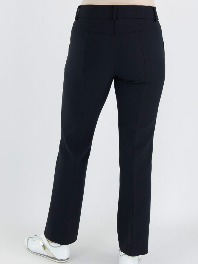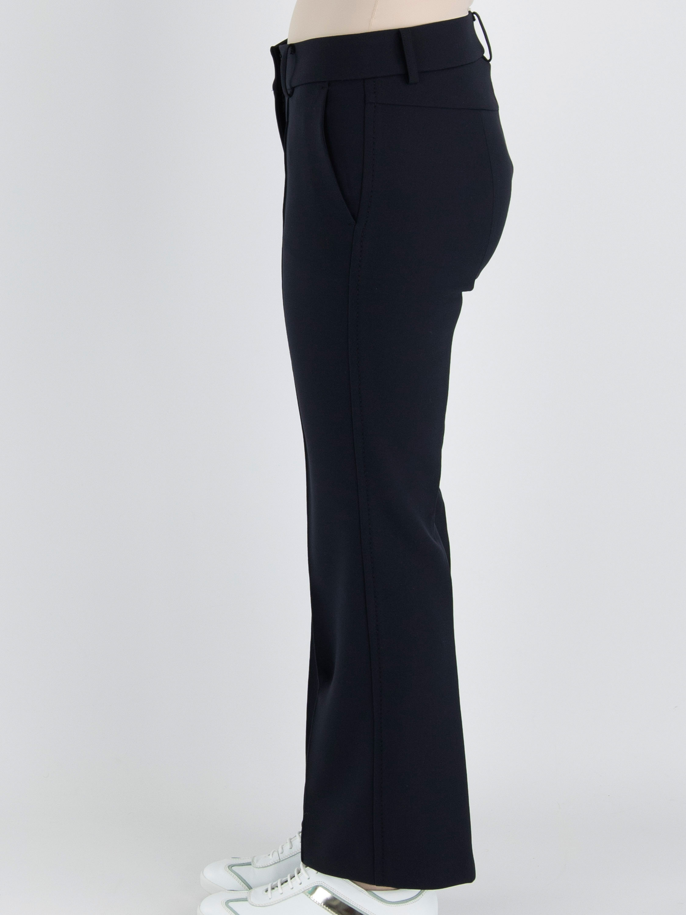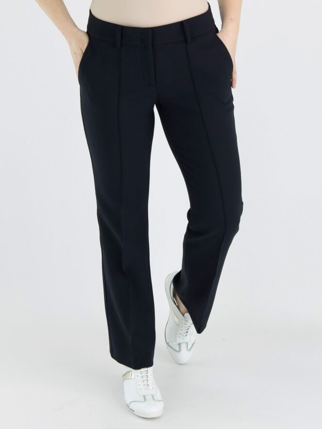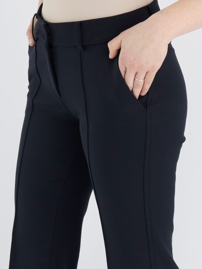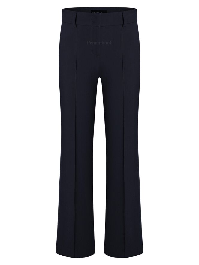 A pair of trousers by Cambio in navy blue. Along the sides, there is a decorative seam. There is also a seam down the middle of the legs. The trousers have side pockets and can be washed at 30 degrees.