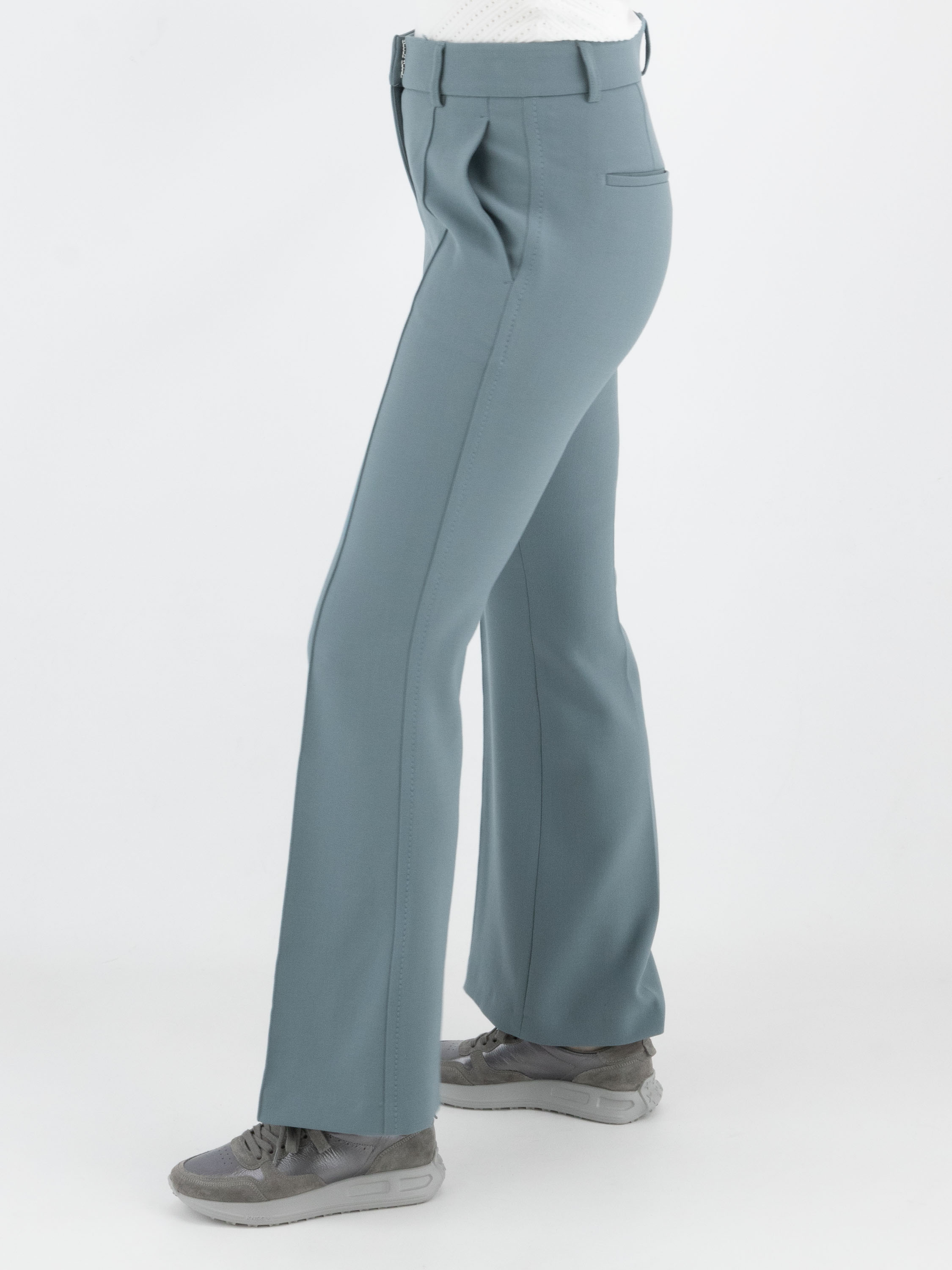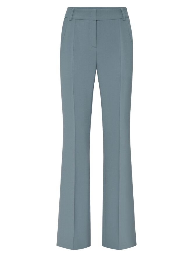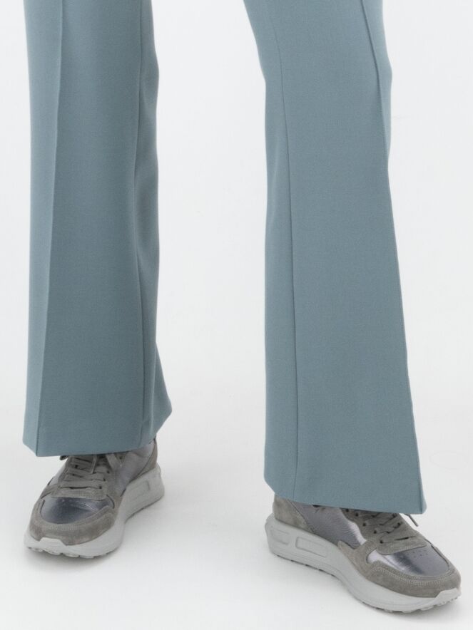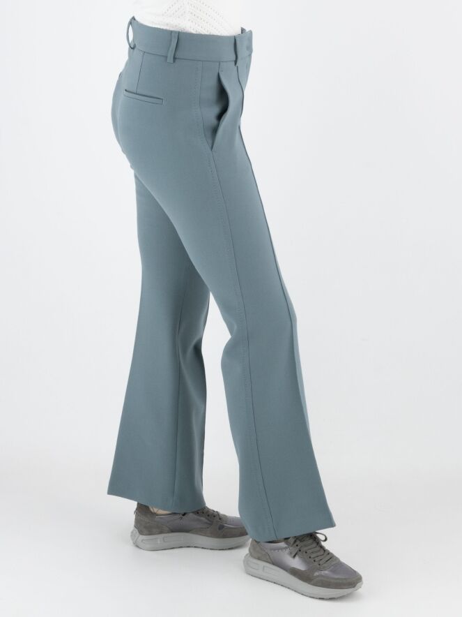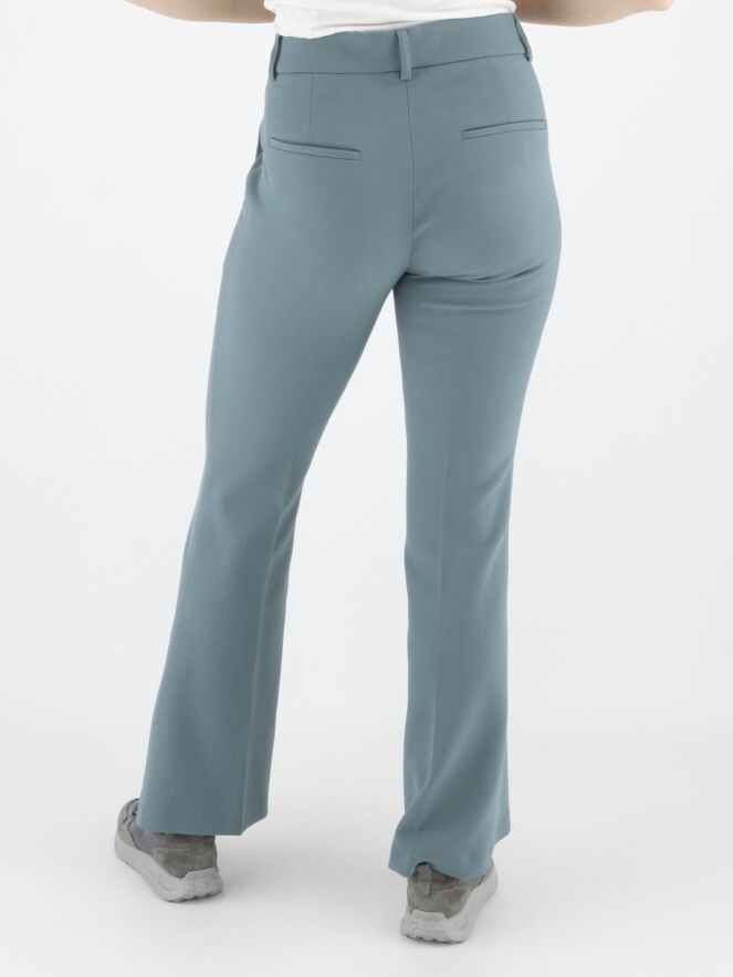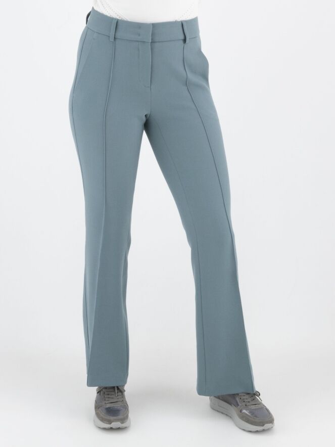 A flared pants by Cambio in a soft petrol blue color. The pants have slit pockets, and in the center of the legs is a seam. Along the sides is a decorative tonal seam. These pants can be washed at 30 degrees.