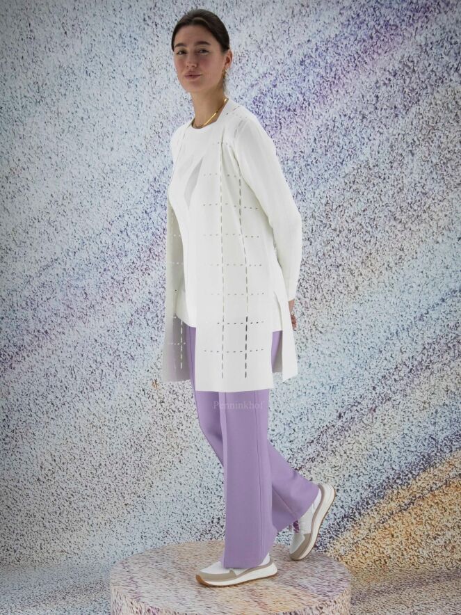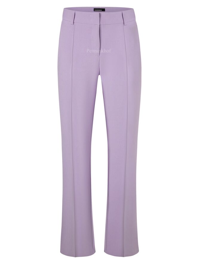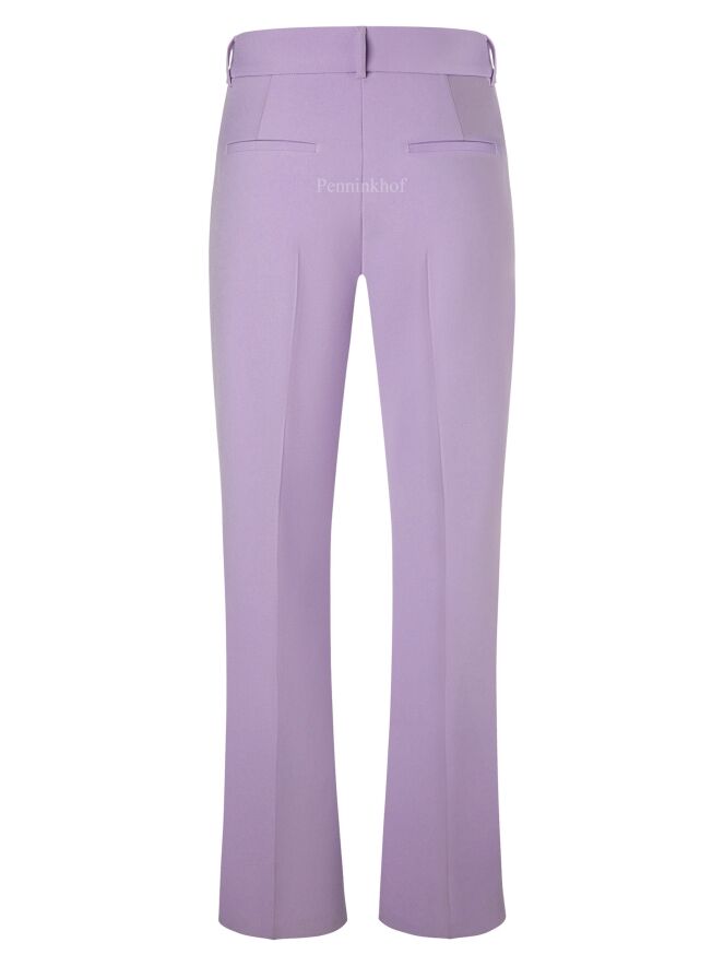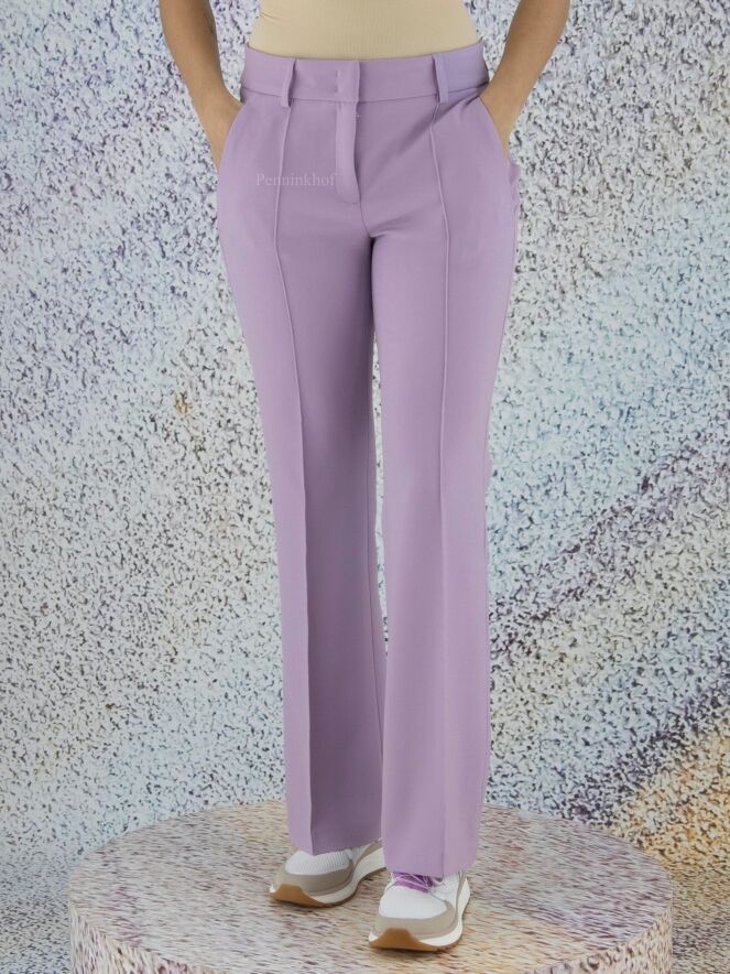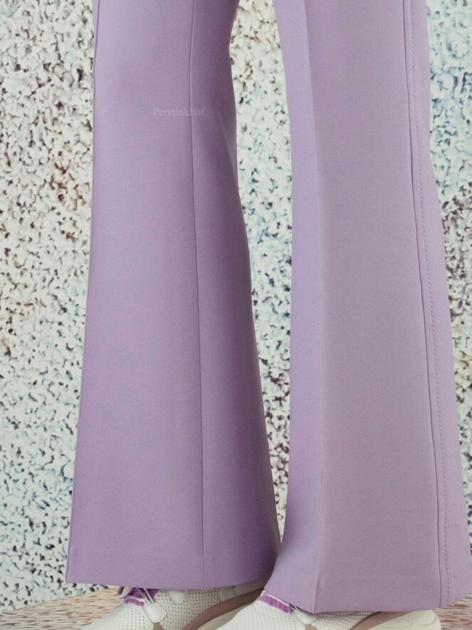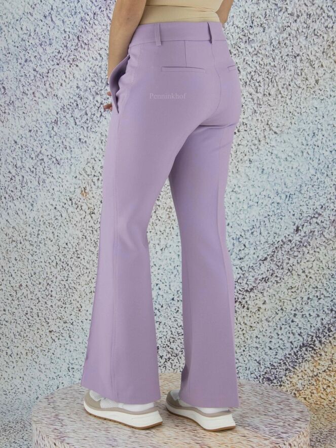 Flared pants in the color lilac. There is a decorative stitching along the sides. The pants have side pockets and can be washed by hand.