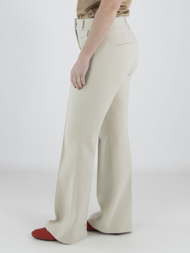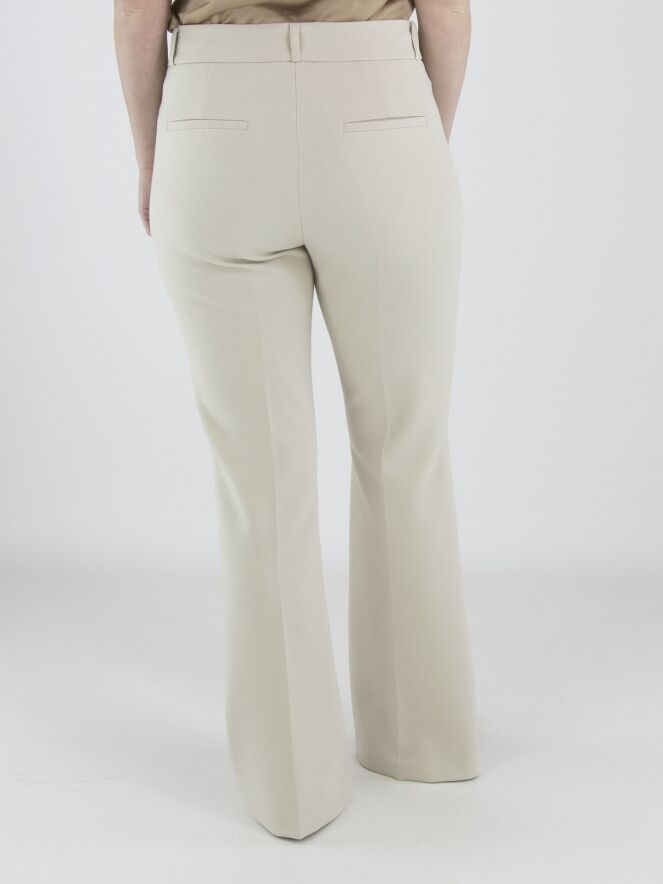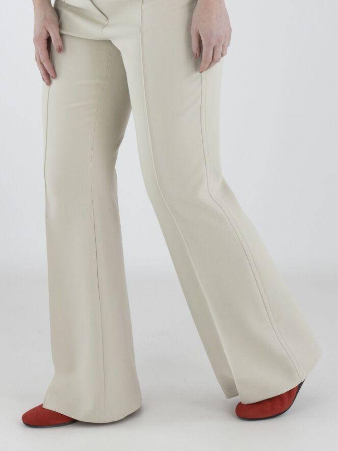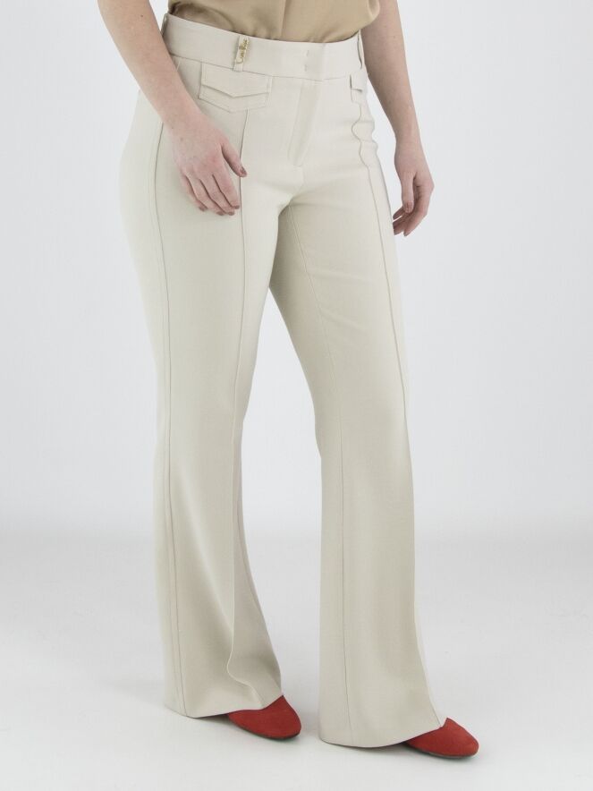 A flared pair of trousers in beige. Decorative stitching runs along the sides. A reversed seam runs down the centre of the legs. Below the elastic waistband are two small pockets with a flap. These trousers can be washed at 30 degrees.