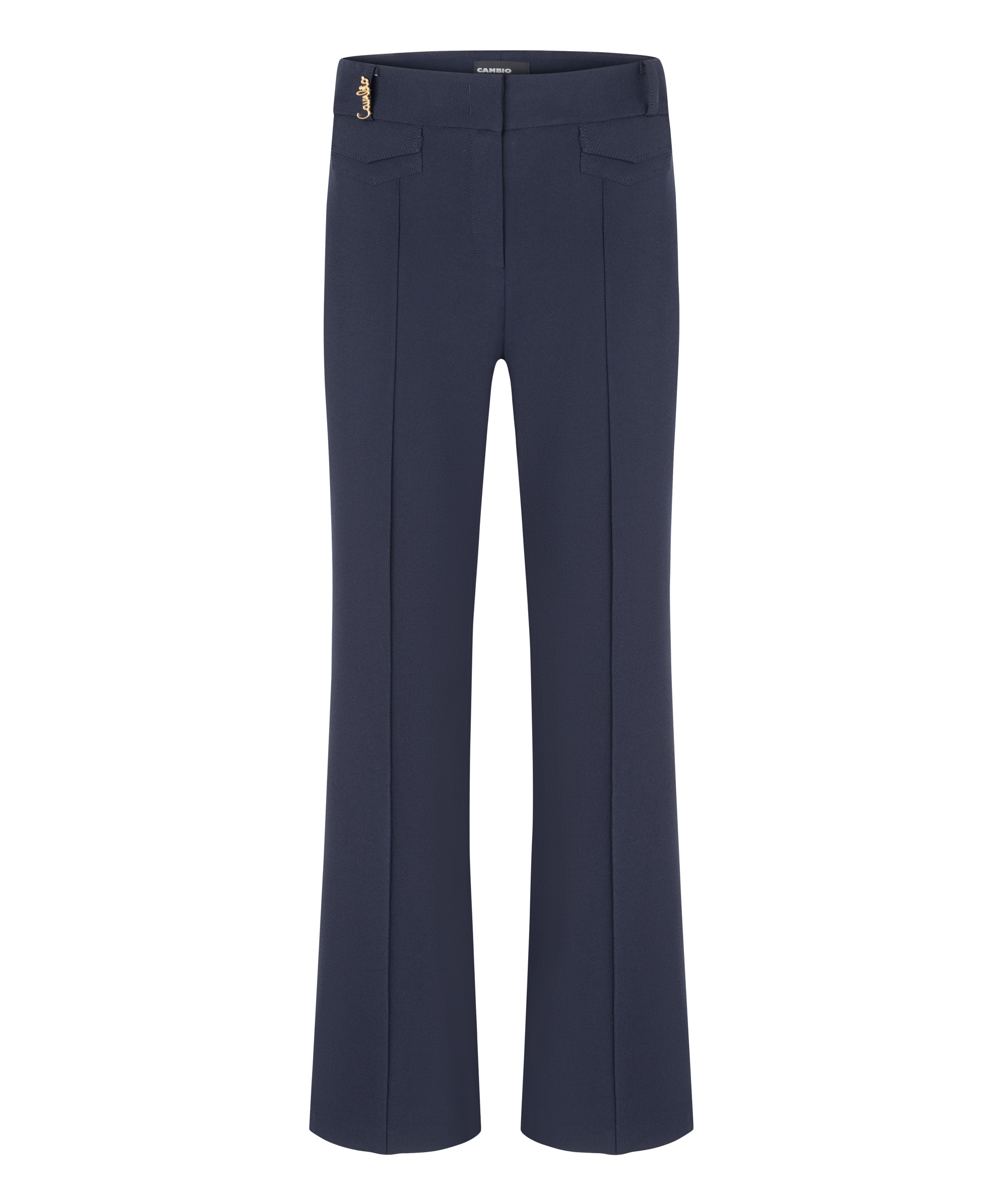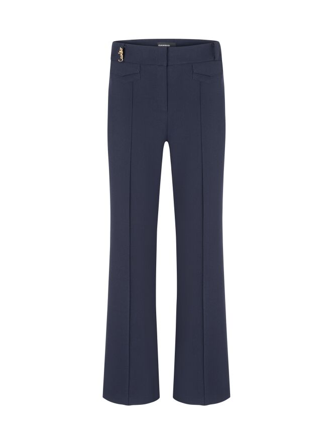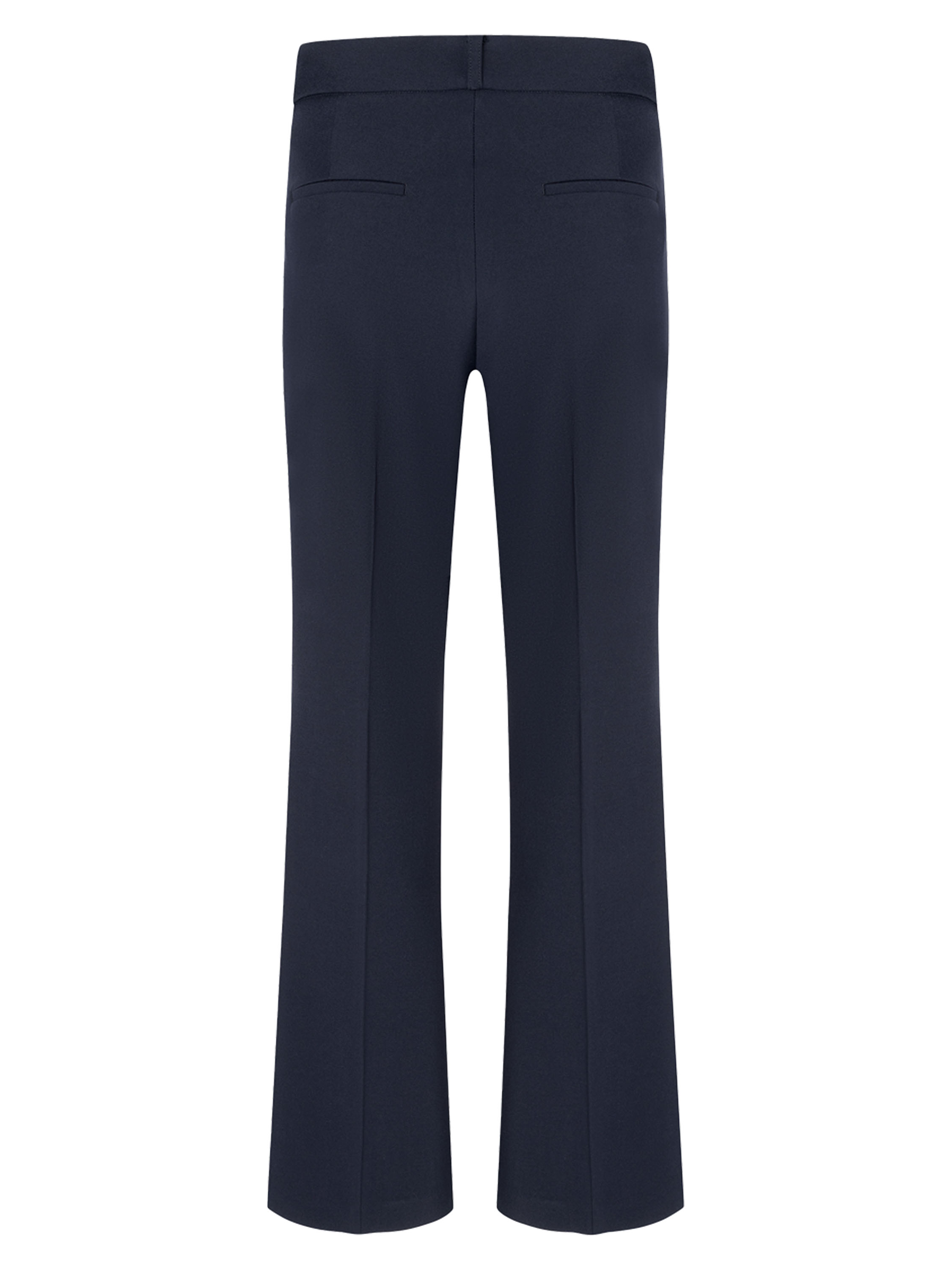 A flared pair of trousers in a navy blue colour. Along the sides runs a decorative seam. A reversed seam is positioned at the centre of the legs. Below the elastic waistband are two small pockets with a flap. These trousers can be washed at 30 degrees.