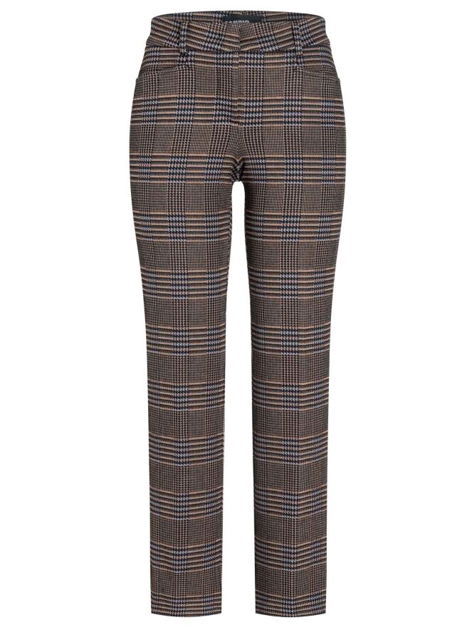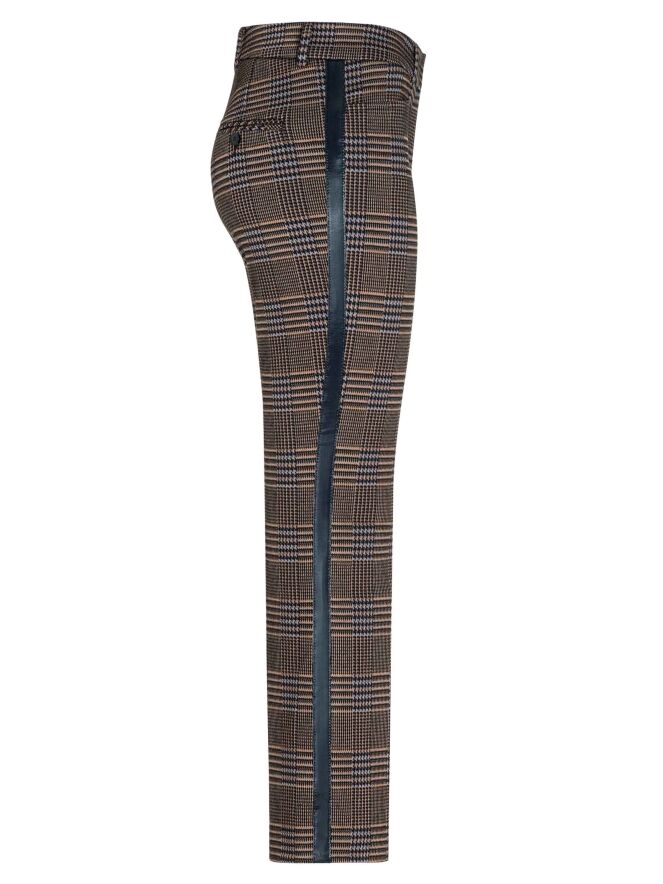 Cambio pants in a pied de coq print with the colors camel, blue and black. Along the sides is a black matte satin trim. These pants can be washed by hand.