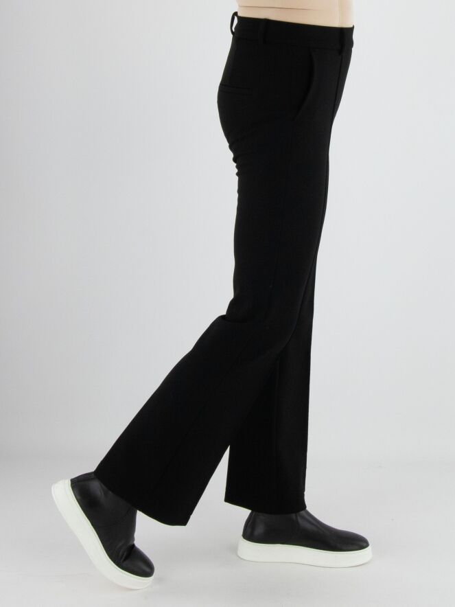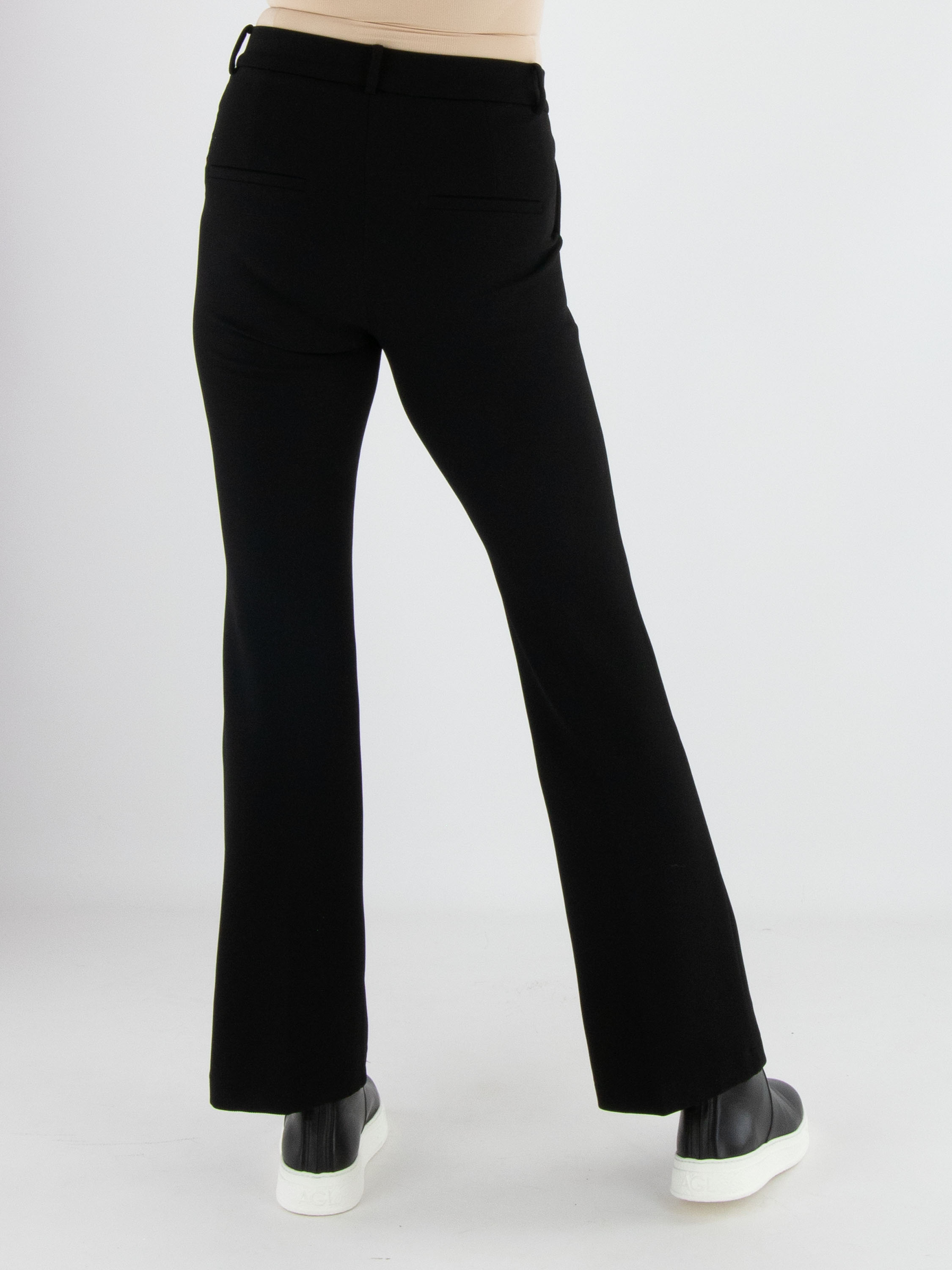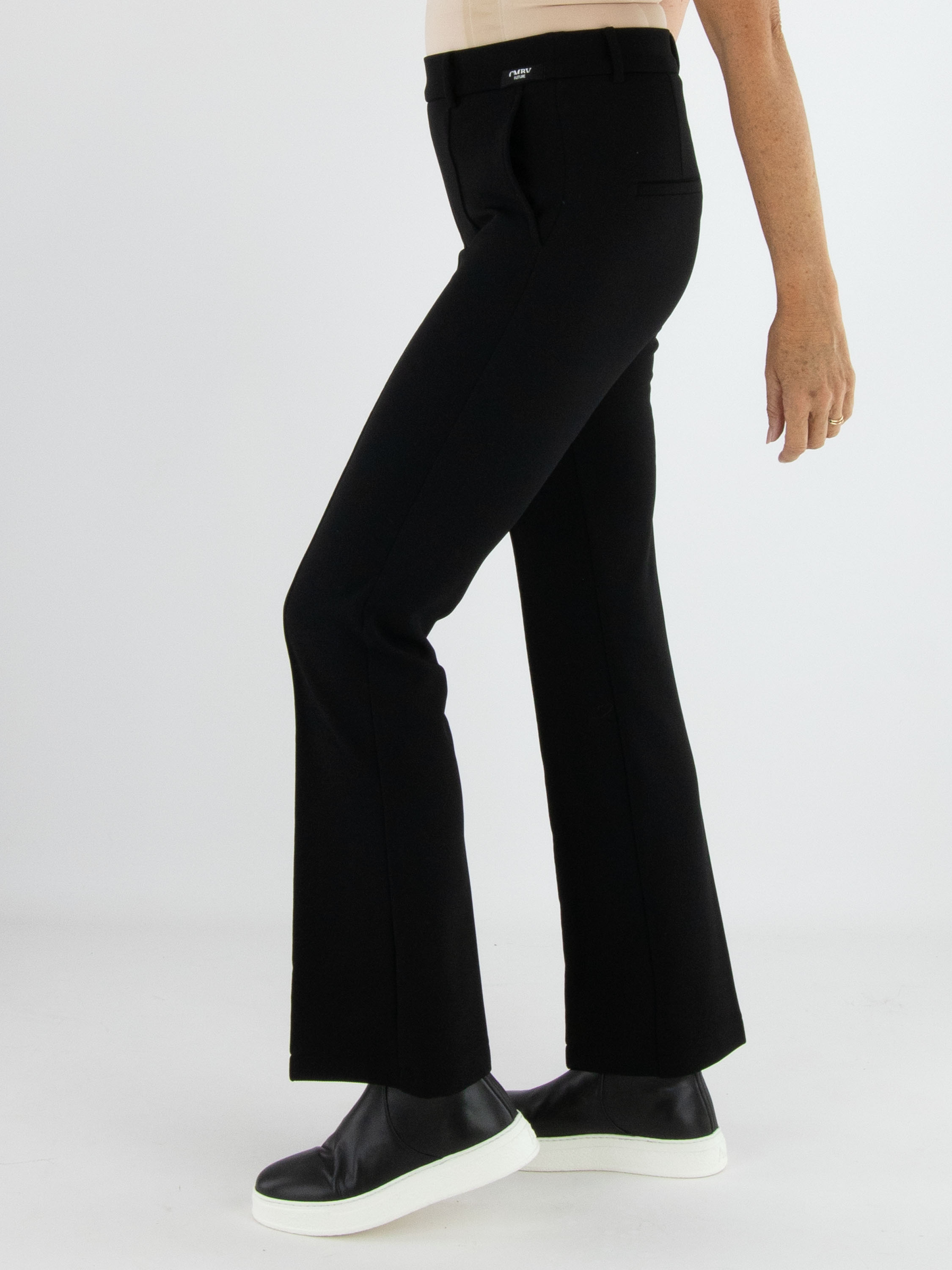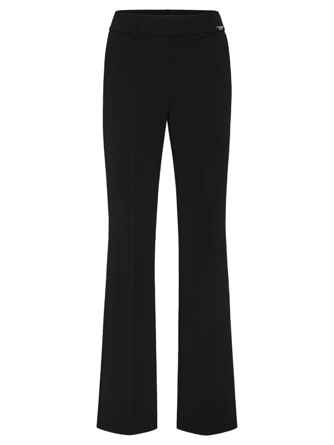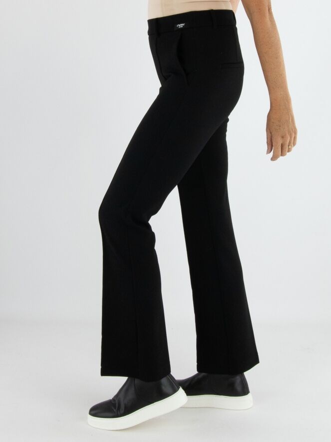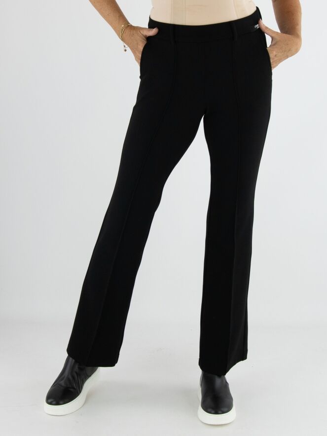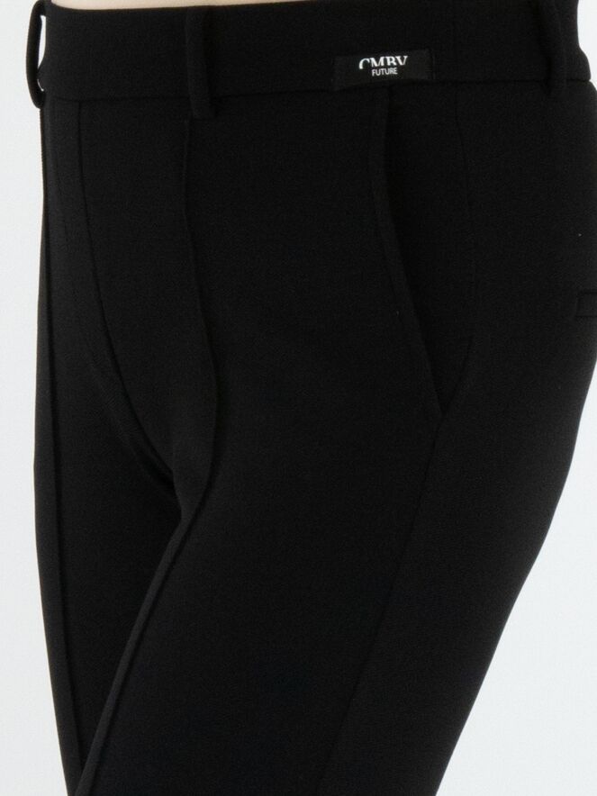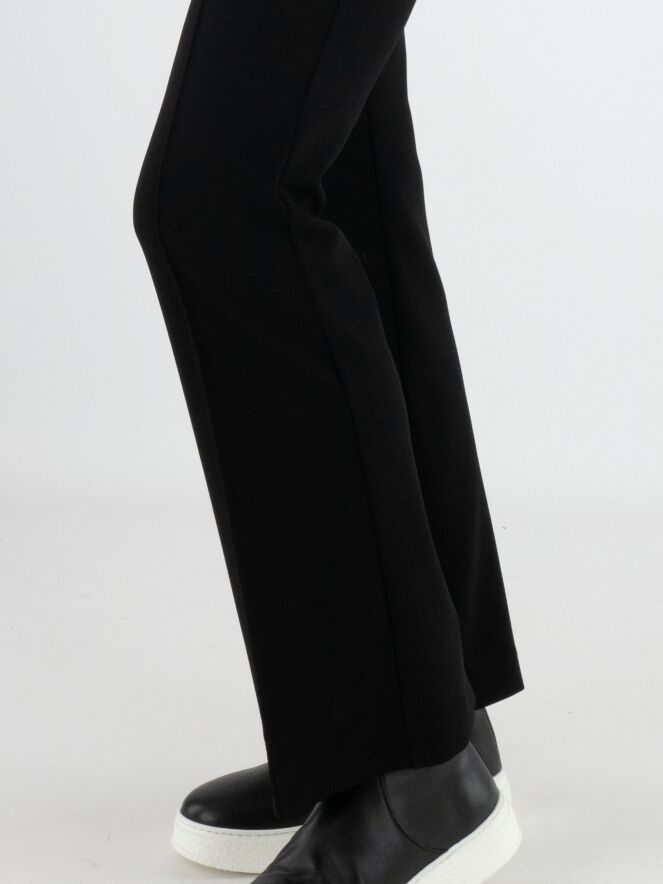 Trousers by Cambio in black. The waistband is elasticated. A reversed seam runs down the centre of each leg. The trousers feature side slit pockets and should be hand-washed.