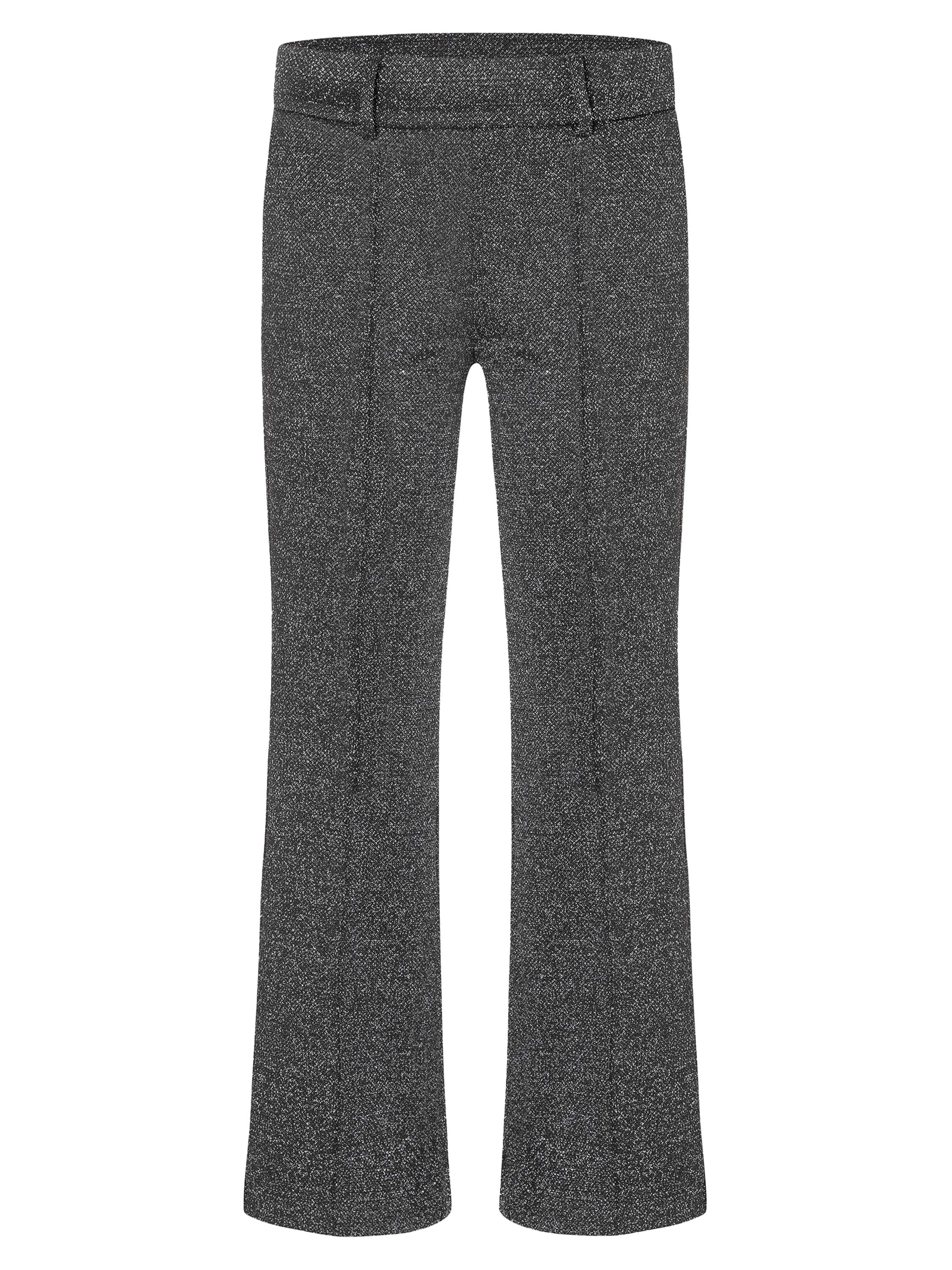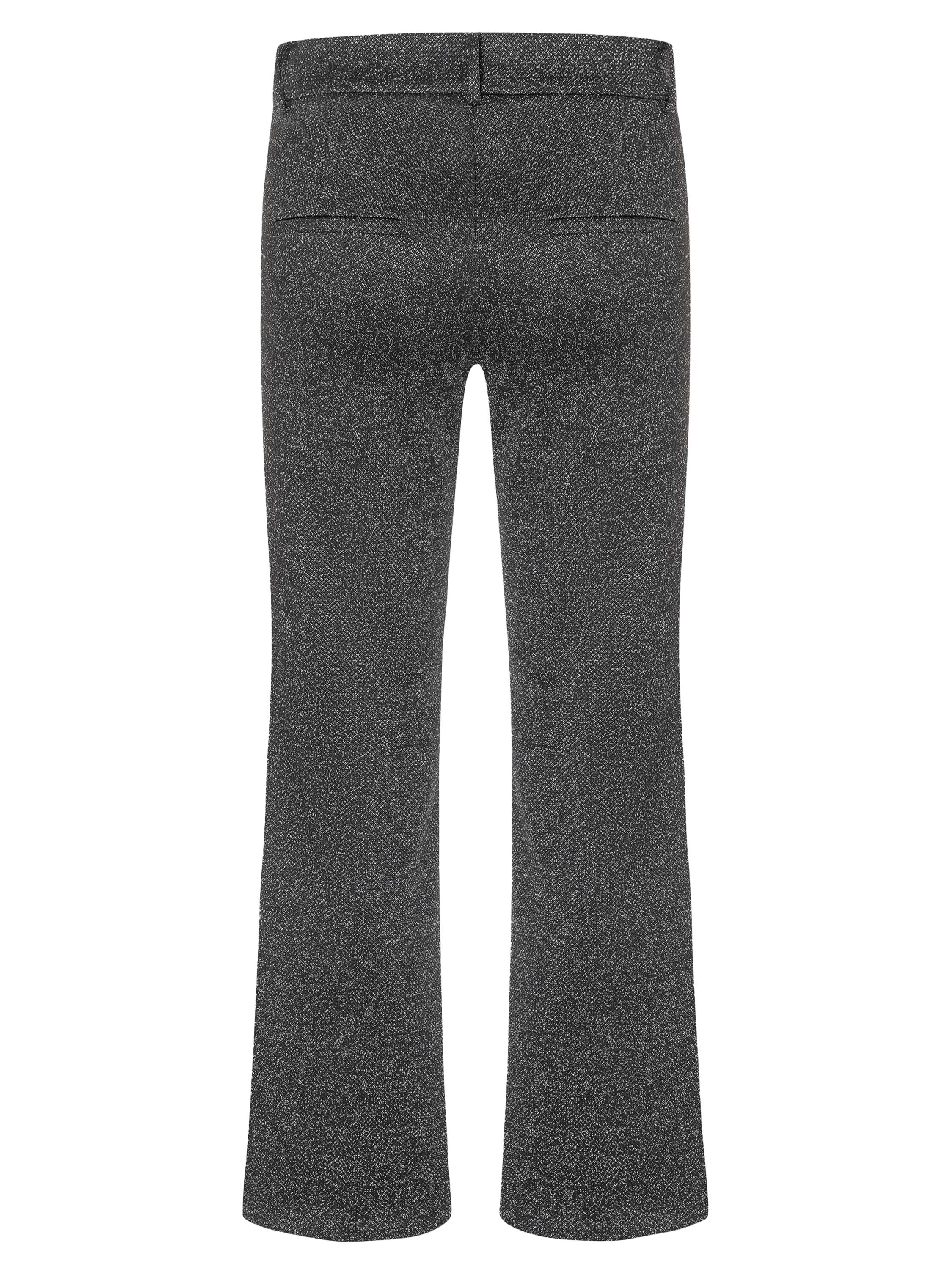 A flared trouser by Cambio in black, featuring a subtle silver thread woven through the fabric for a shimmering effect. A reversed seam runs down the centre of each leg. The trousers have side pockets and can be hand-washed.