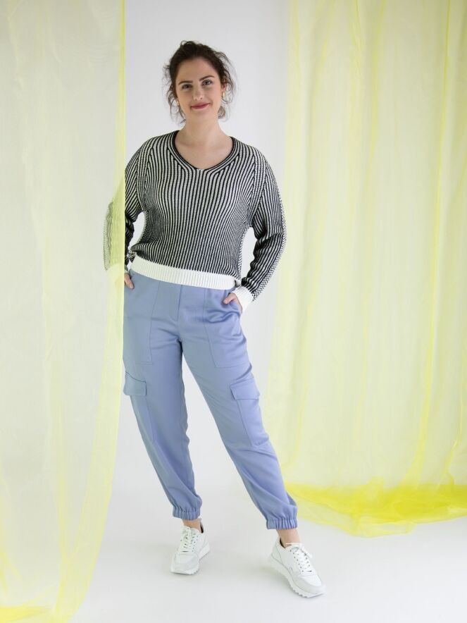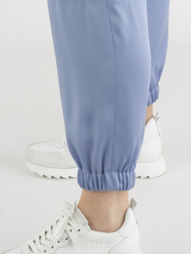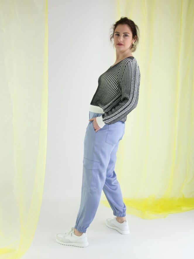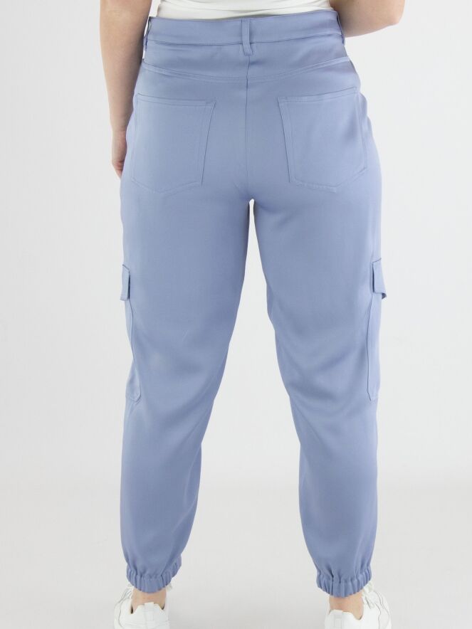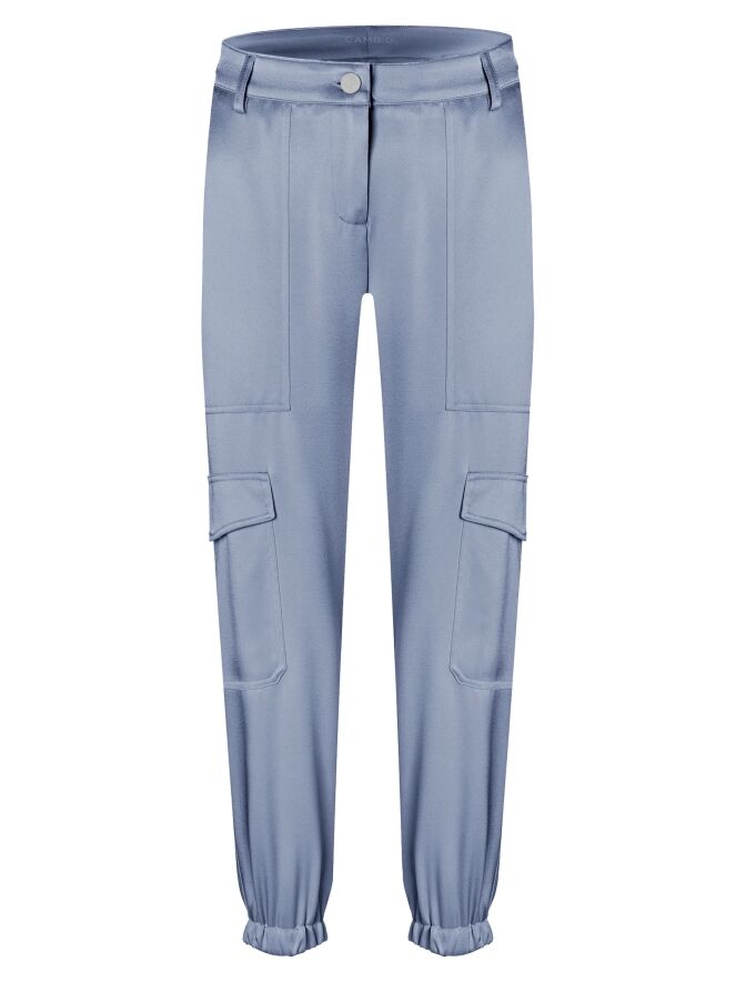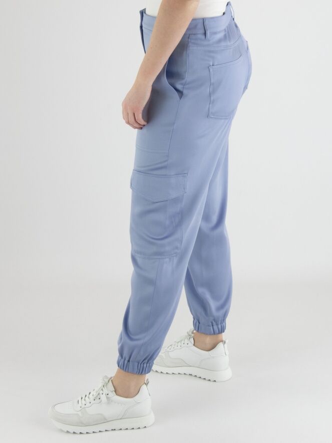 A matte satin cargo pants from Cambio in lavender blue. There is a finely pleated elastic cuff at the bottom. The pants feature side pockets and can be hand washed.