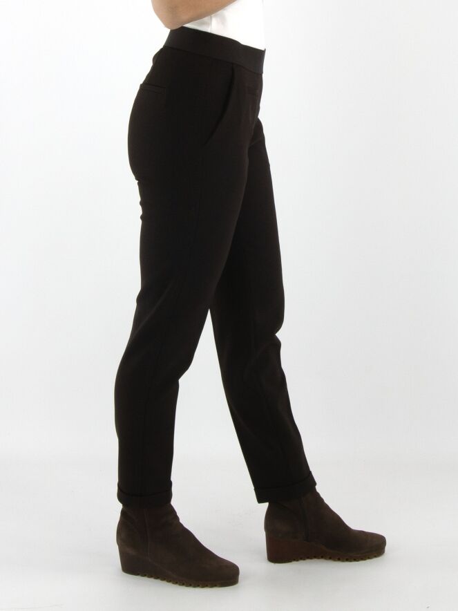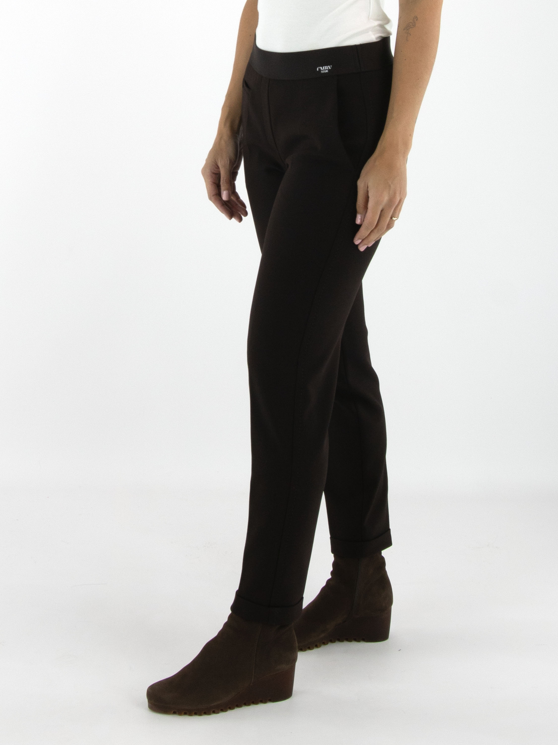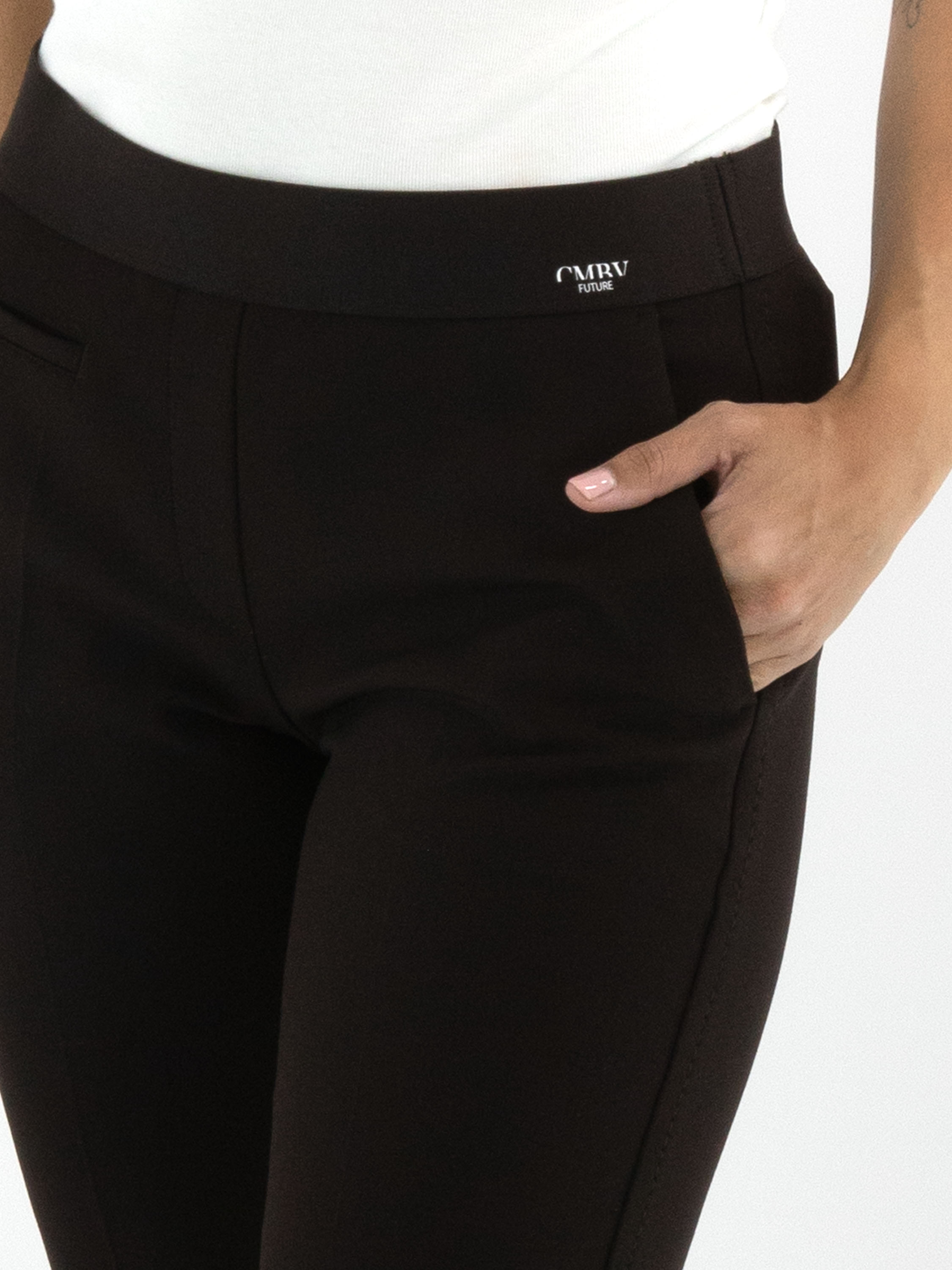 Trousers by Cambio in mocha brown. The waistband features an elastic band. A pressed crease runs down the centre of each leg. The trousers have side pockets, and along the sides a decorative seam is added as a piping detail. These trousers can be hand-washed.