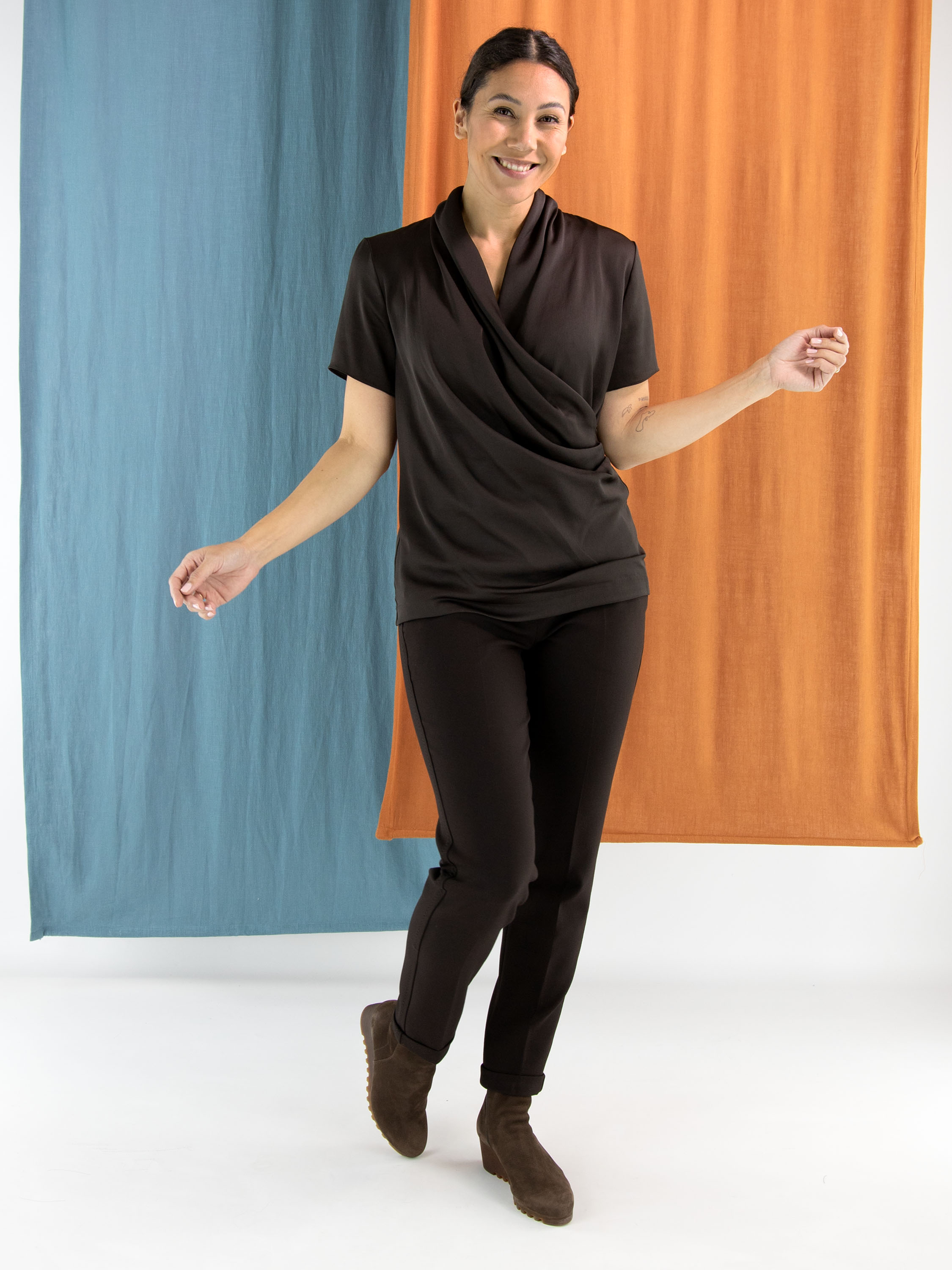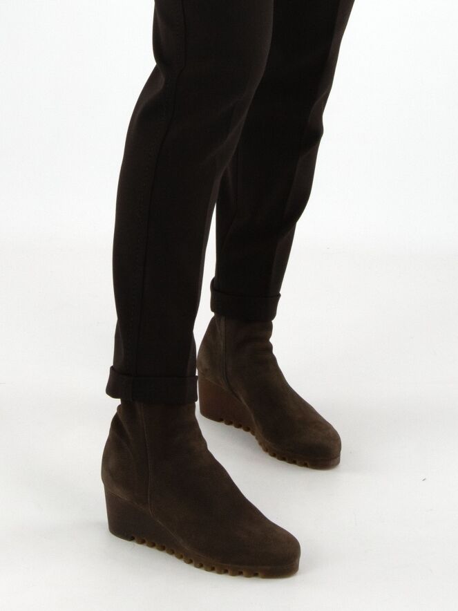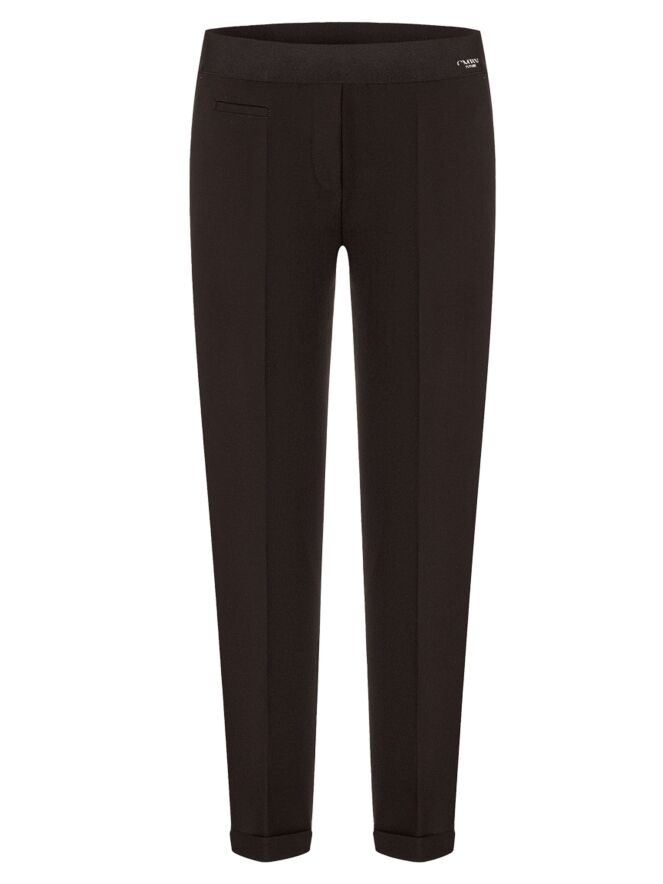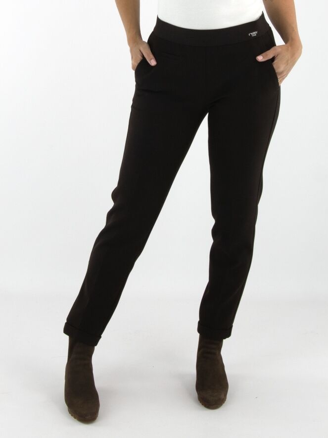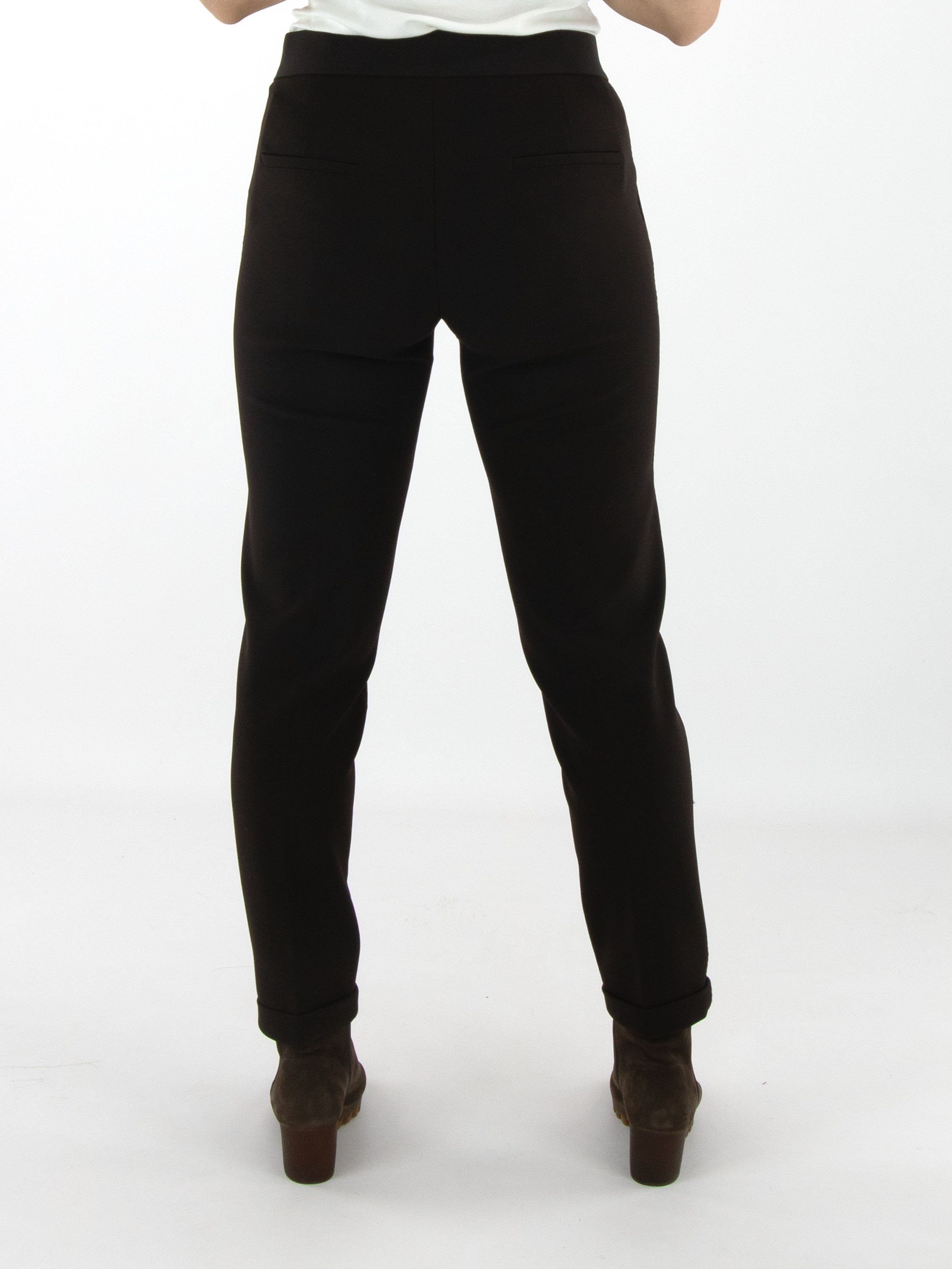 Trousers by Cambio in mocha brown. The waistband features an elastic band. A pressed crease runs down the centre of each leg. The trousers have side pockets, and along the sides a decorative seam is added as a piping detail. These trousers can be hand-washed.