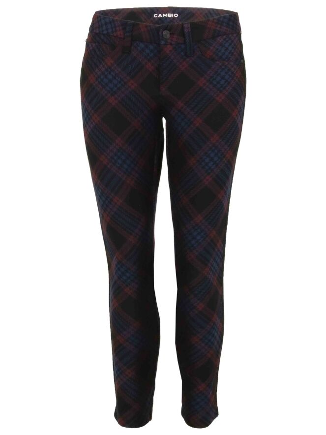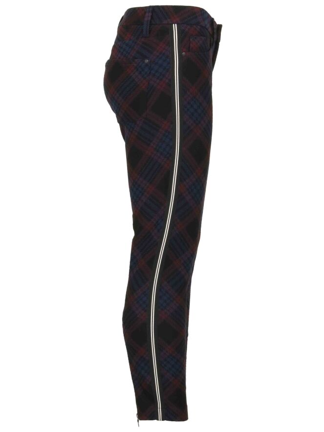 A Cambio trouser in a diagonal diamond print with the colors burgundy red and night blue on a black background. Along the sides vena the pants is a black band with white stripes. The pants are in a 5 pocket model and can be washed by hand.