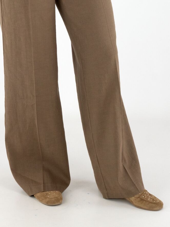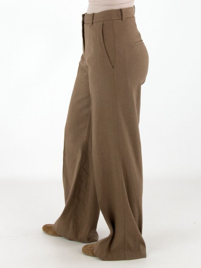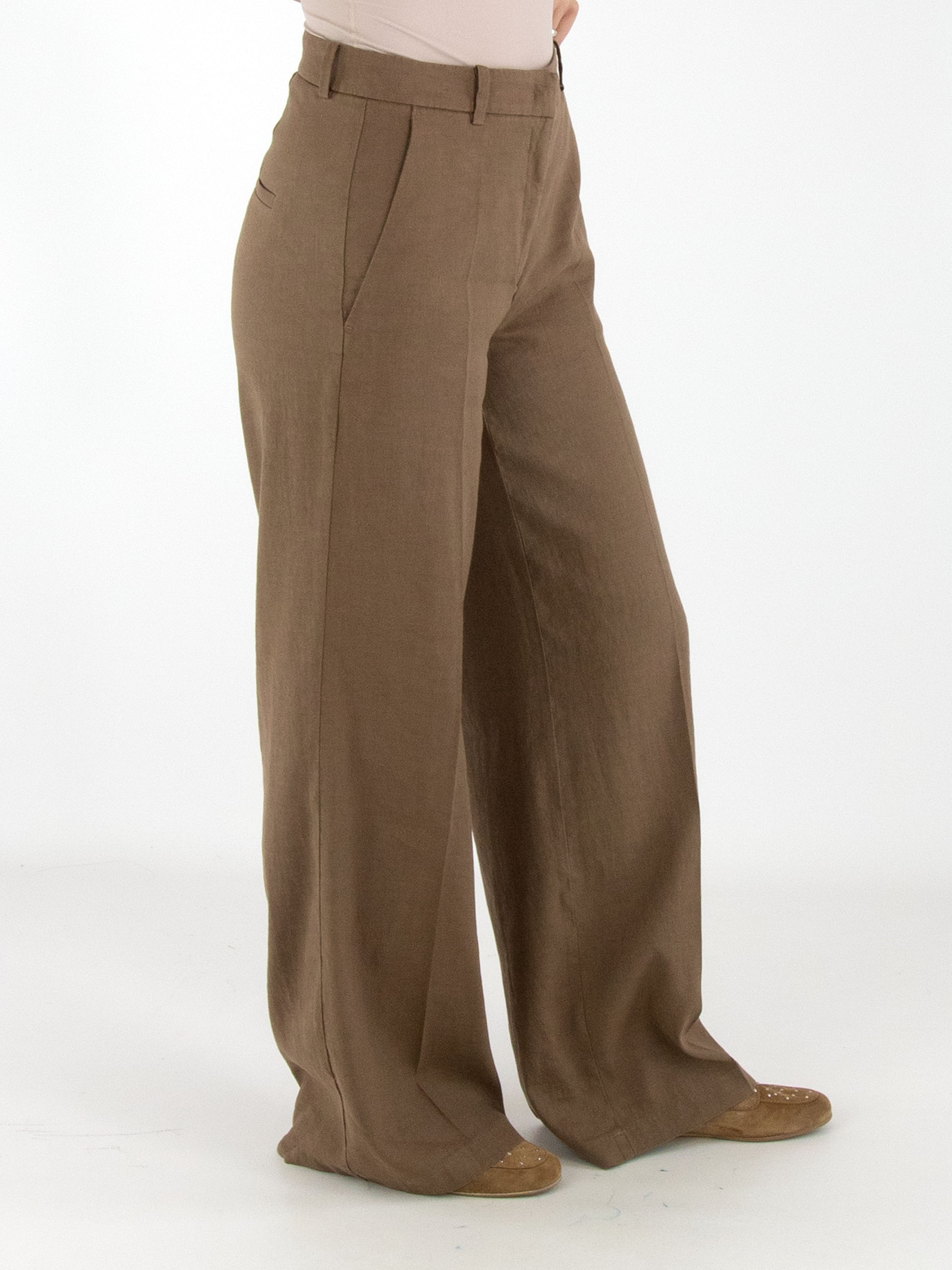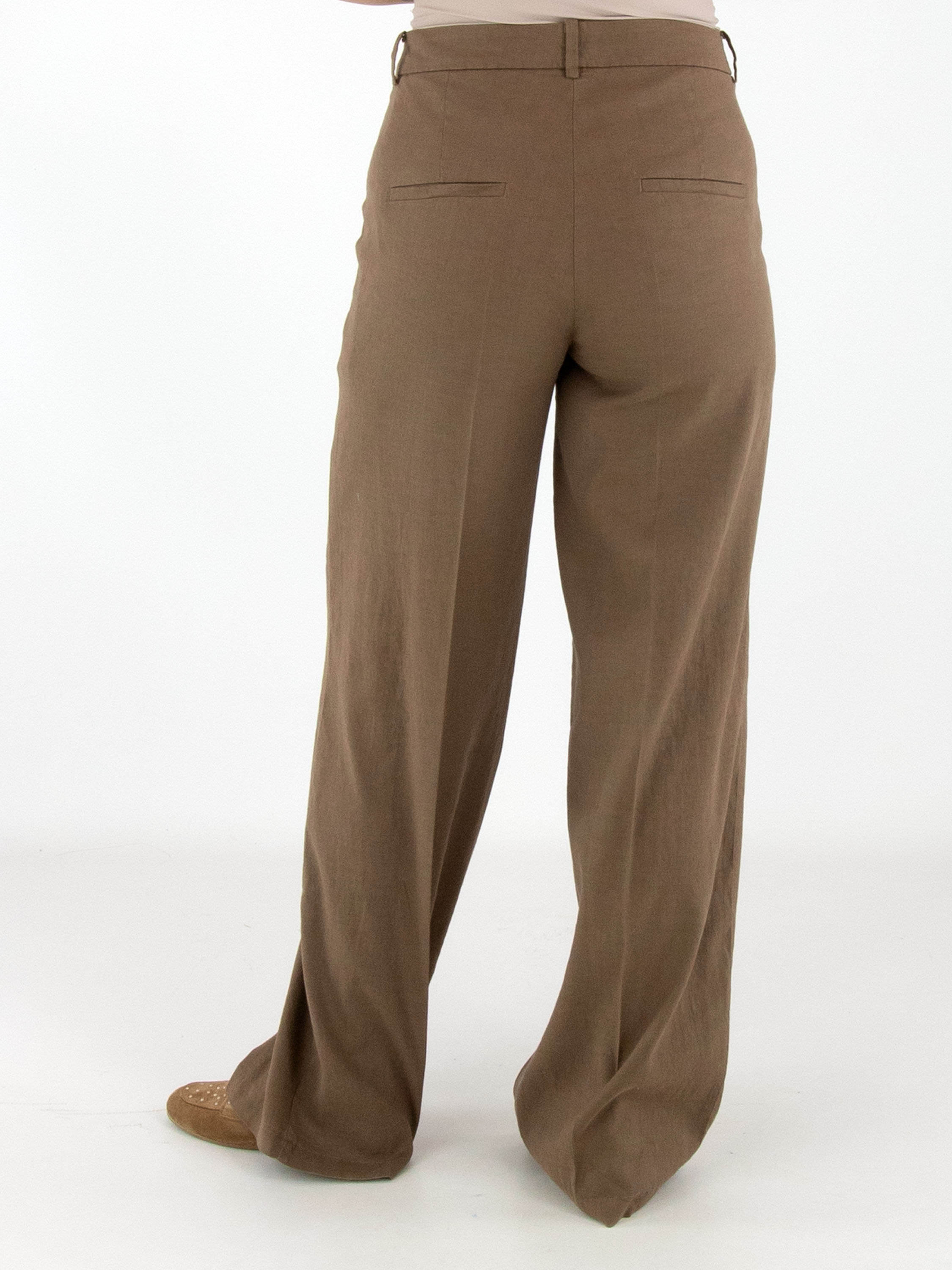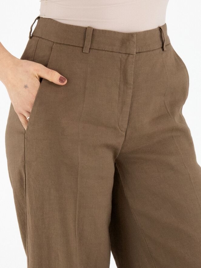 Trousers by Cambio in a chocolate brown shade. A pressed crease runs down the centre of the legs. The legs are straight cut. The trousers feature side pockets and can be hand-washed.