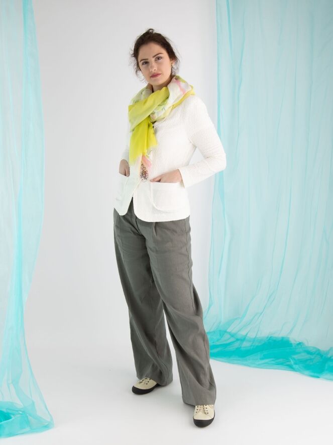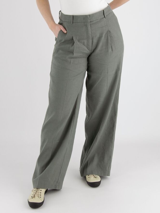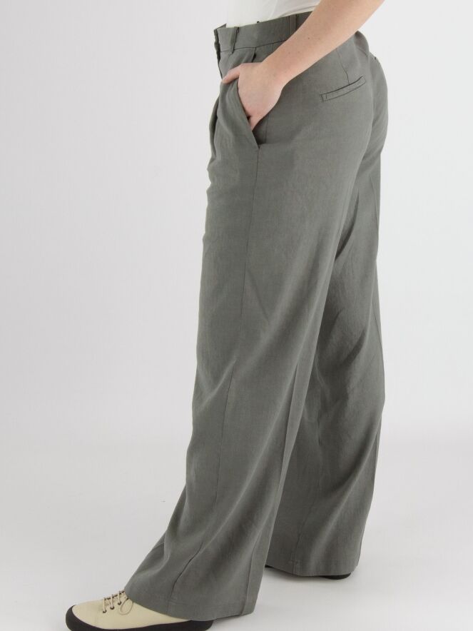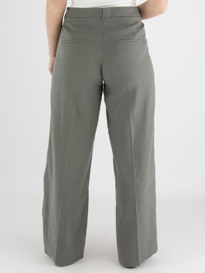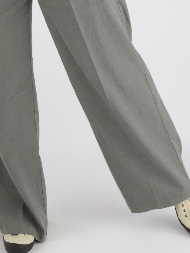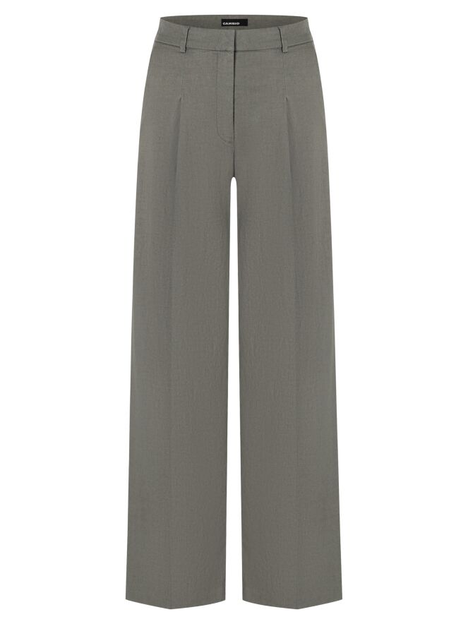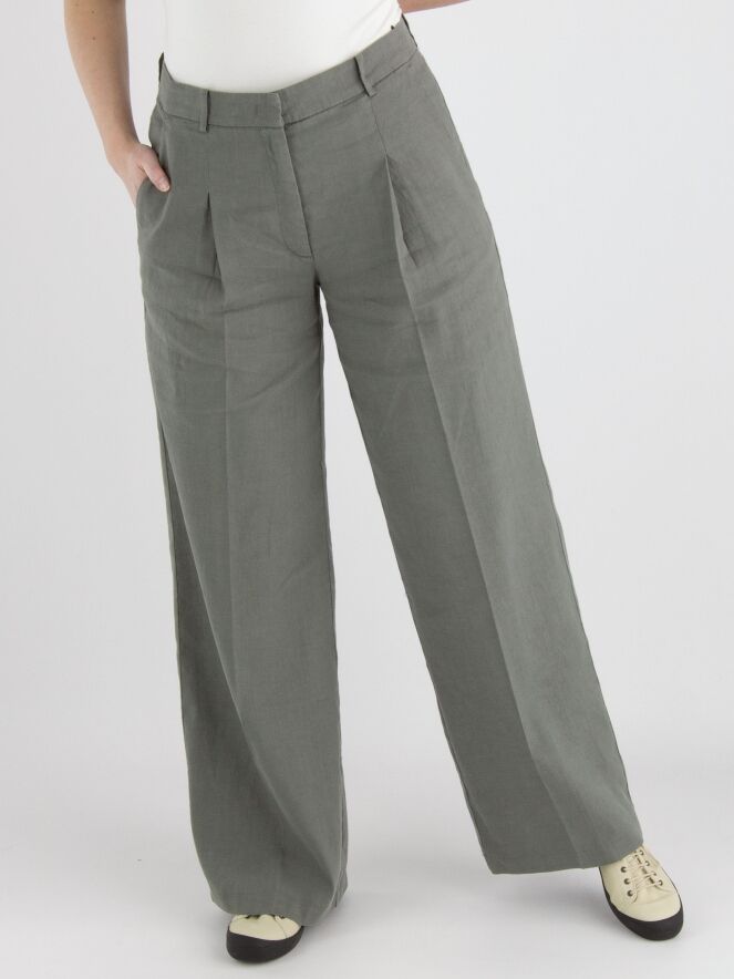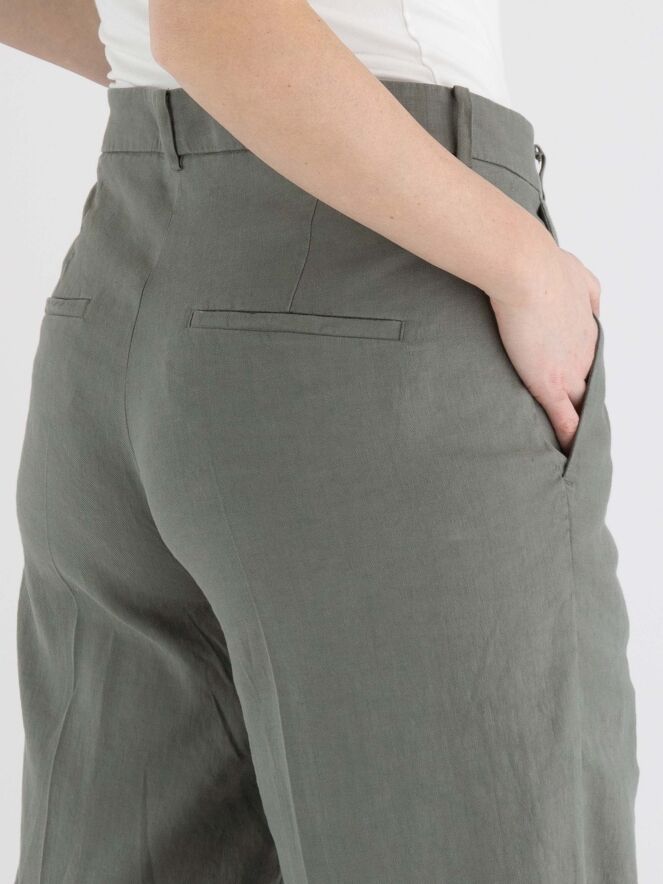 Wide linen trousers from Cambio in olive green. There are some pleats from the waist, and the trousers have pockets. These trousers should be hand washed.