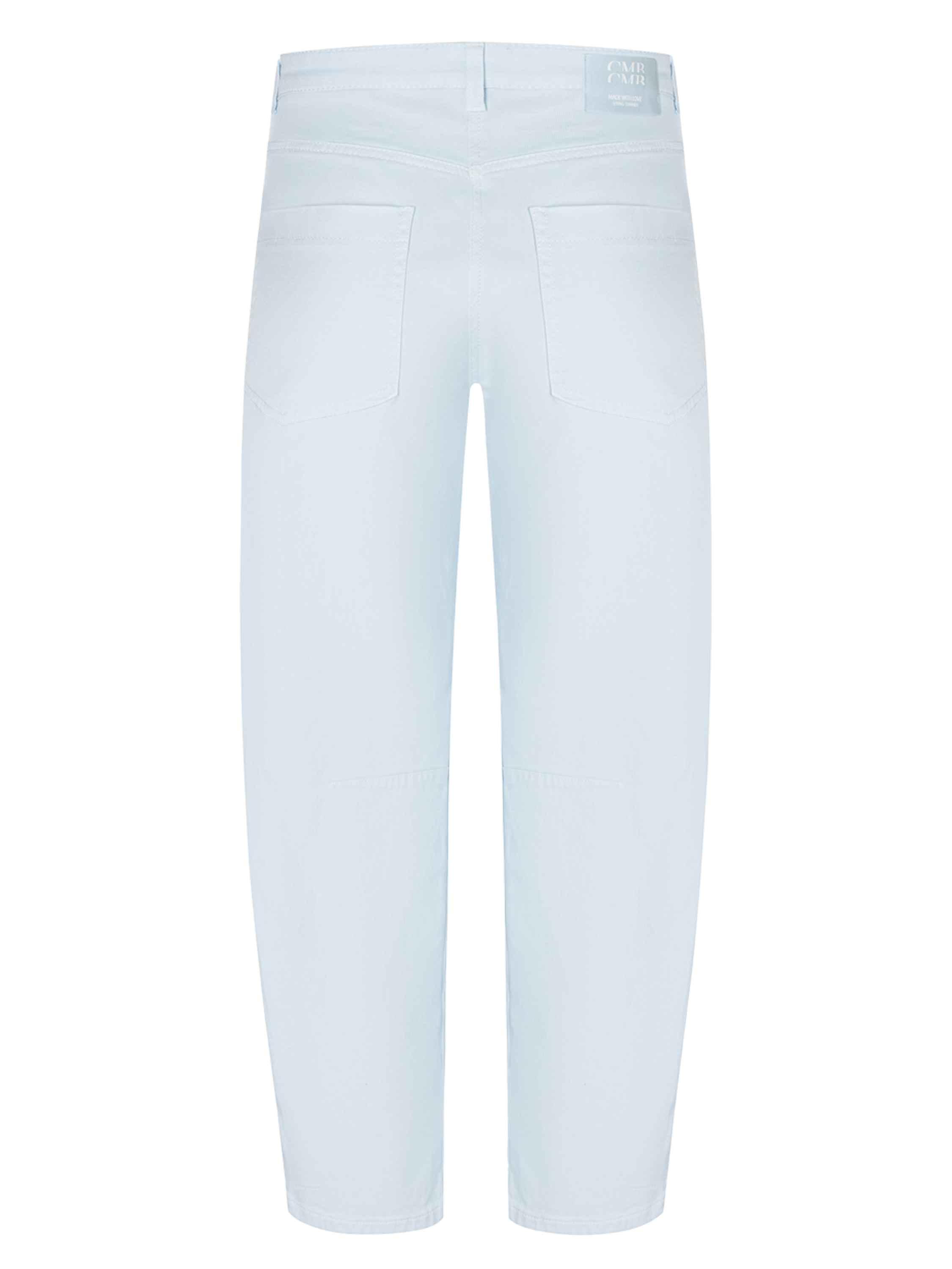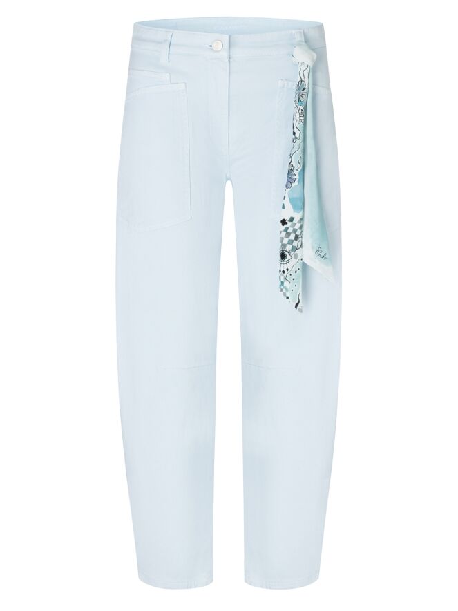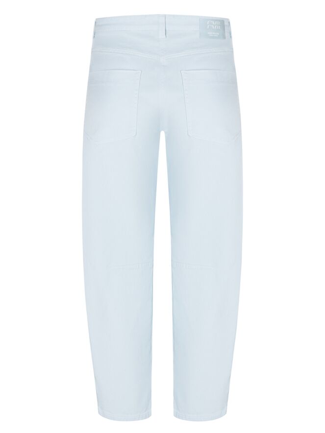 Trousers by Cambio in a light blue shade. The trousers are designed in a 5-pocket style, with straight-cut, deep front pockets. A seam detail is placed at knee level. These trousers can be washed at 30 degrees.
