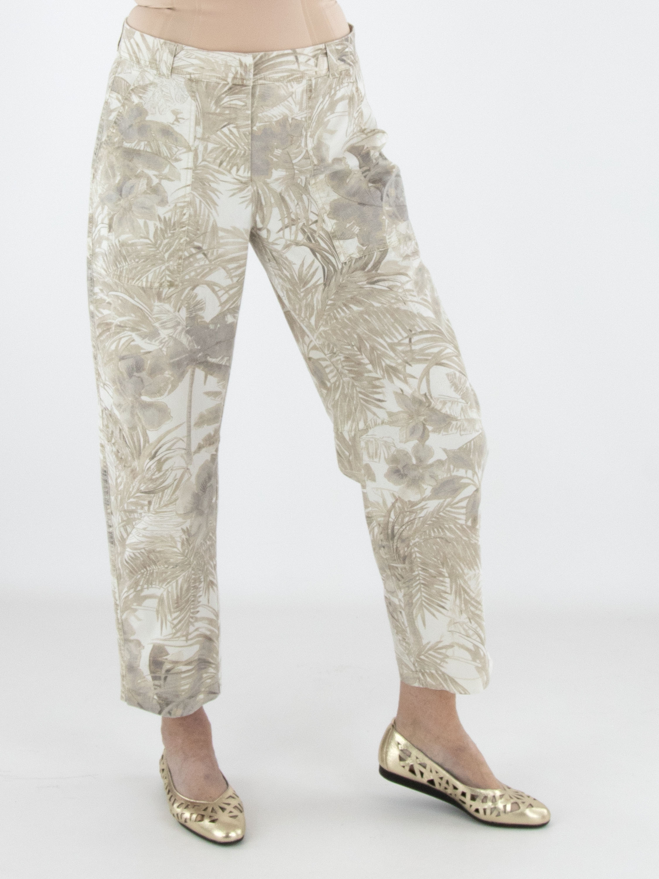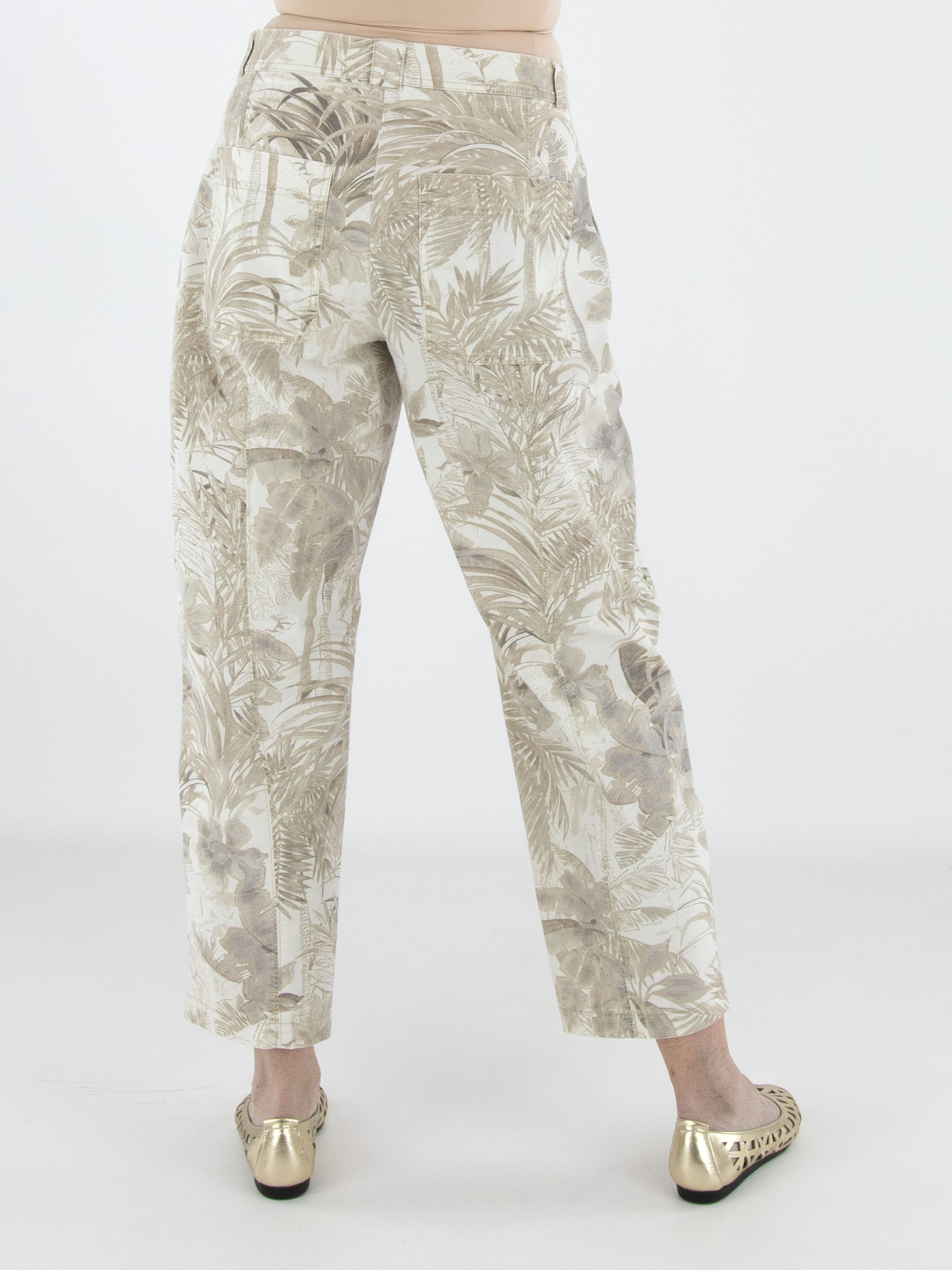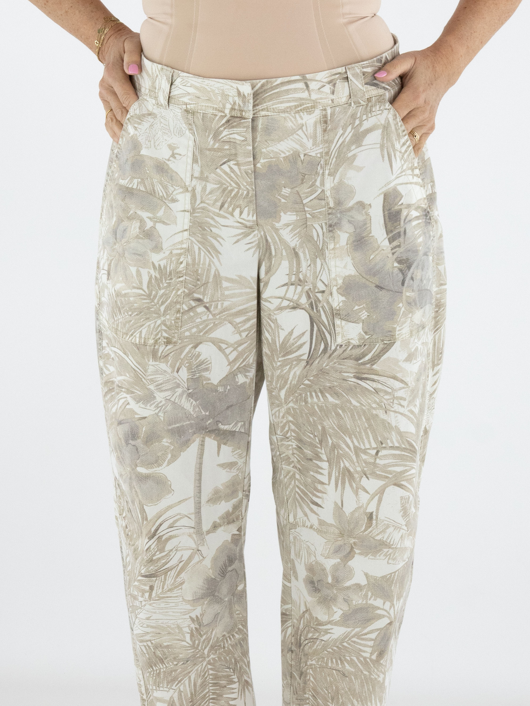 Trousers by Cambio featuring a jungle-inspired leaf print in multiple shades of brown on a beige background. Designed with side pockets, these trousers can be washed at 30 degrees.