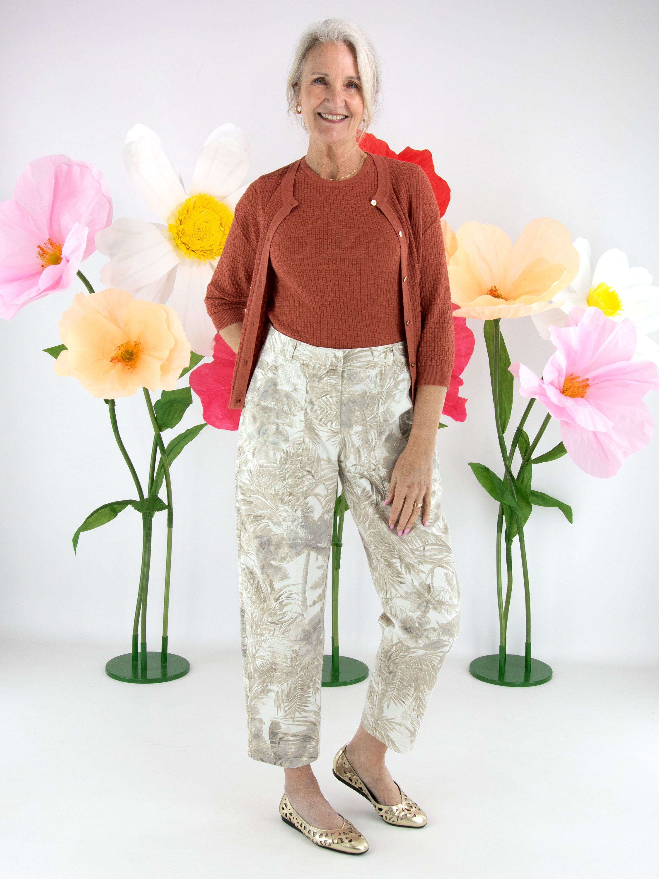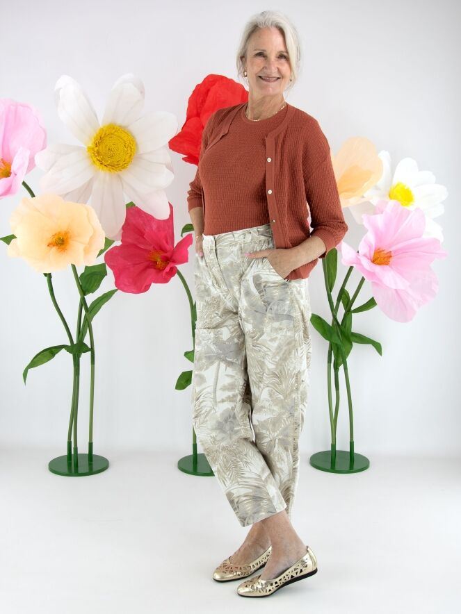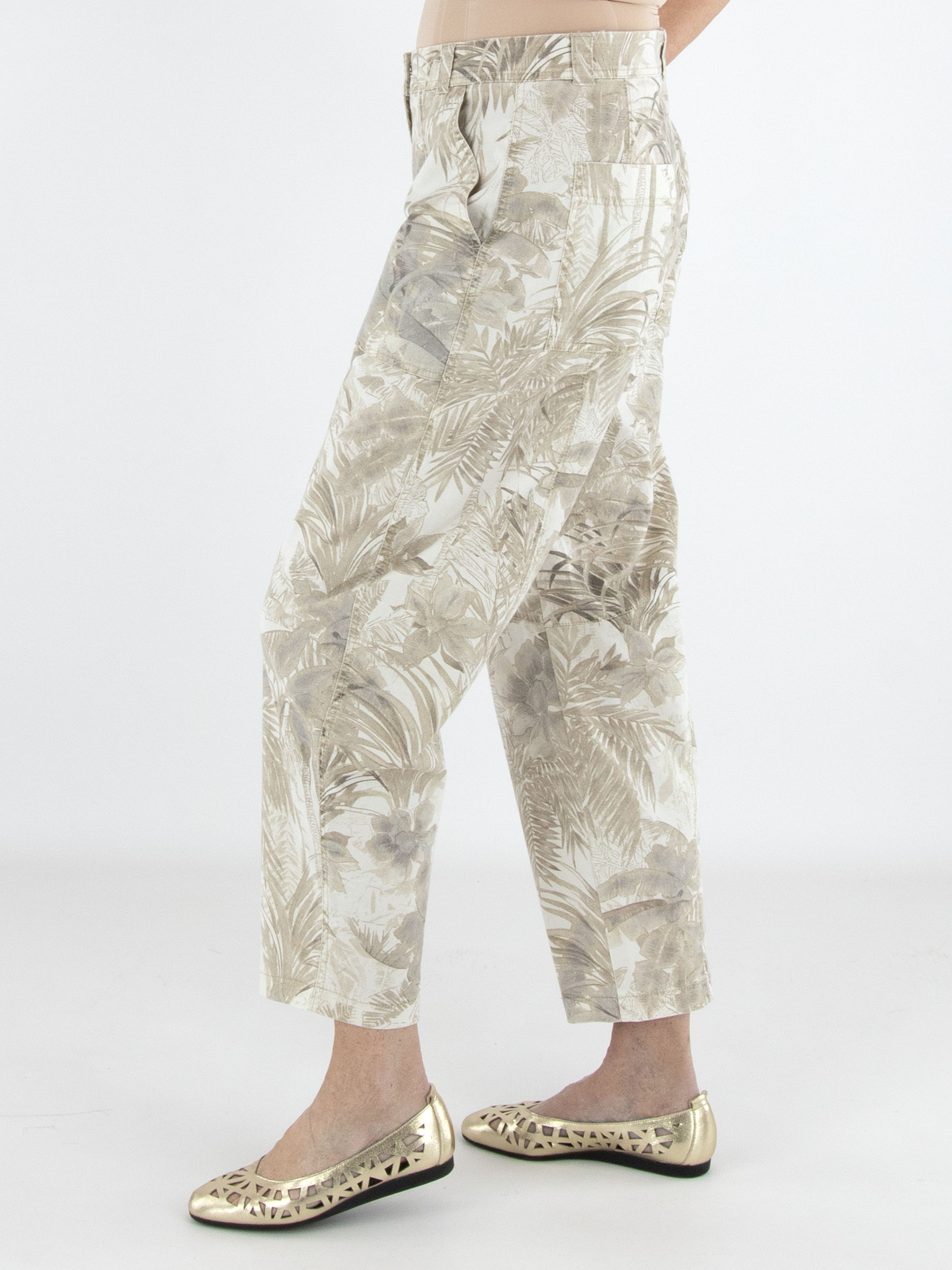 Trousers by Cambio featuring a jungle-inspired leaf print in multiple shades of brown on a beige background. Designed with side pockets, these trousers can be washed at 30 degrees.
