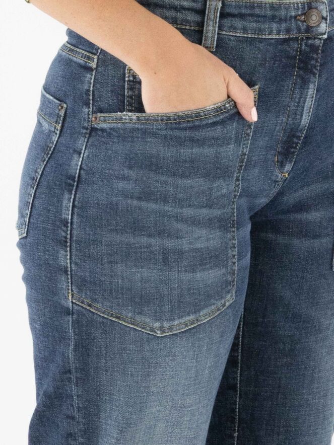Washed jeans by Cambio with a used look. Designed in a 5-pocket style, with slightly diagonal-cut front pocket edges. A seam runs across the knees. These jeans can be washed at 30 degrees.
