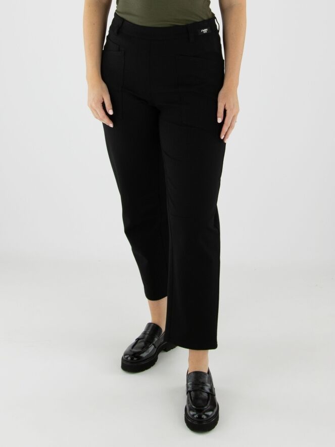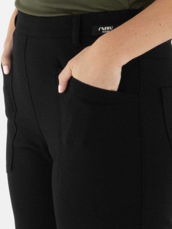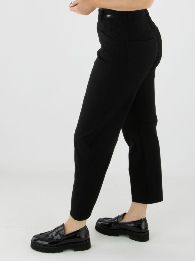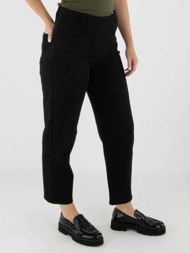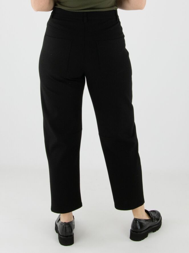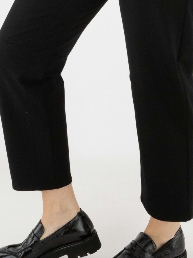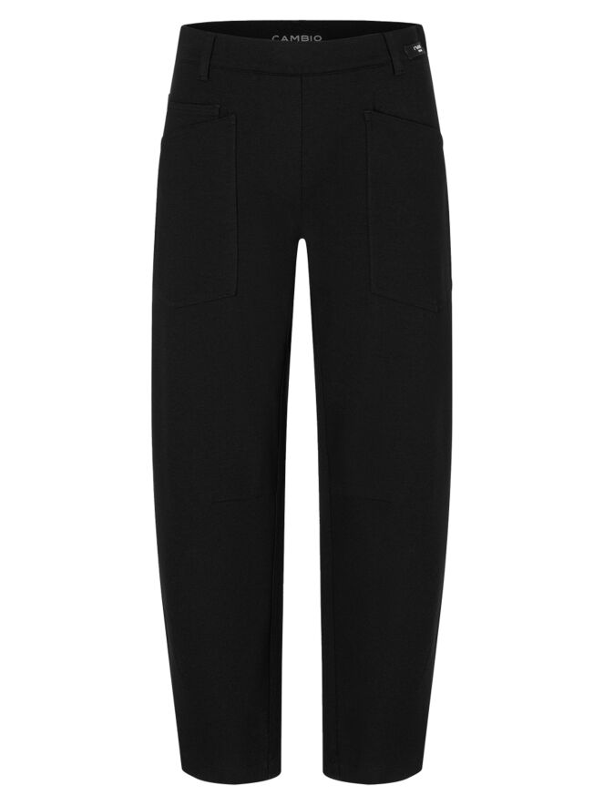 Black trousers by Cambio in a 5-pocket style. A shaping seam runs across the knees. These trousers should be hand-washed.