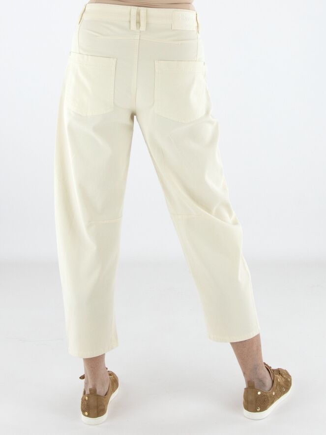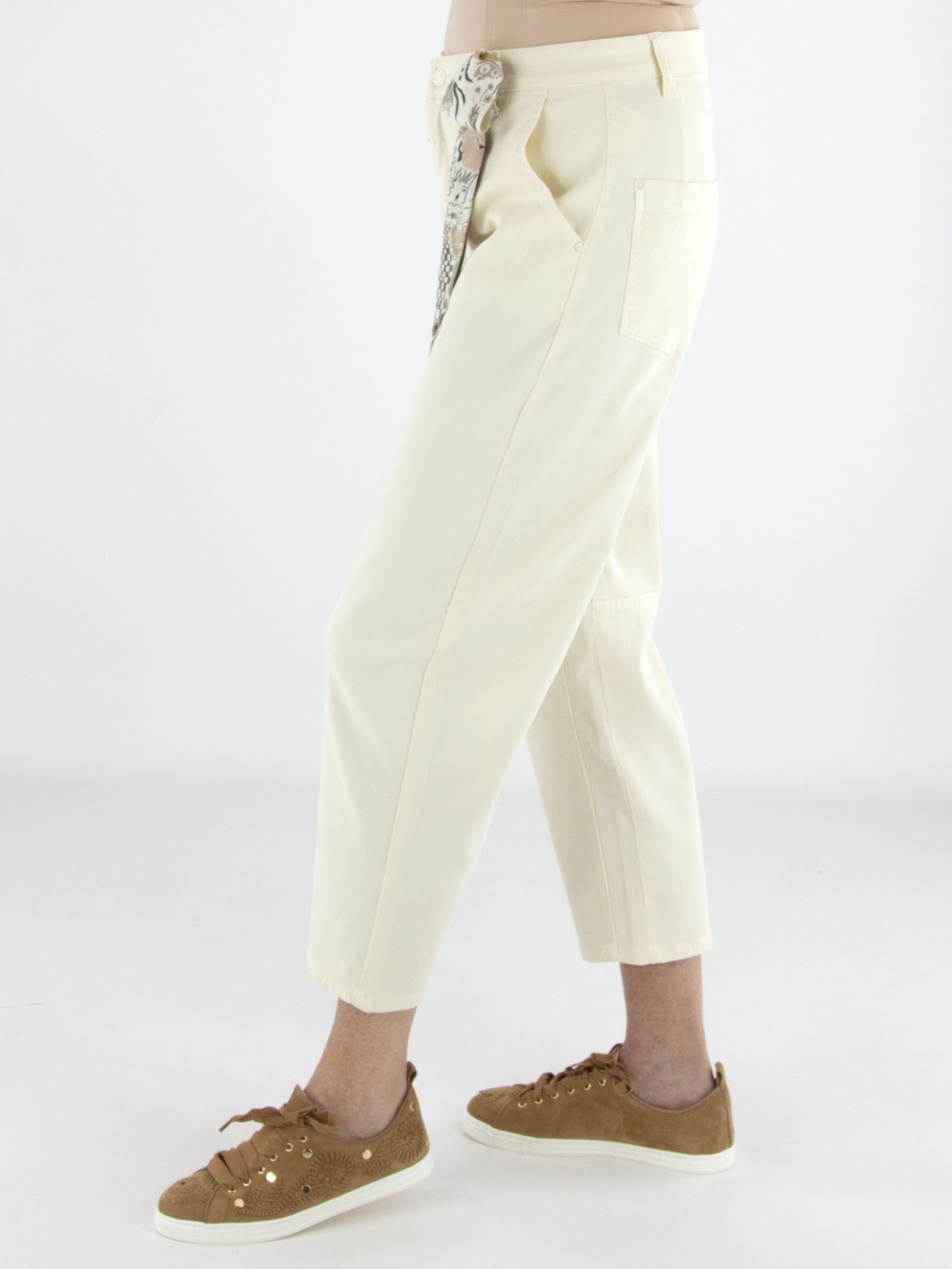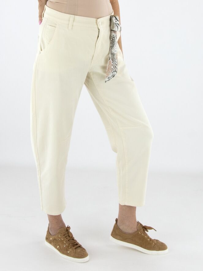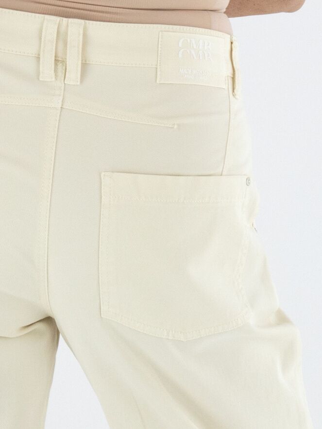 Jeans by Cambio in a light sand shade. Designed in a classic 5-pocket style with side pockets, it features a shaping seam along the inner leg at knee level, subtly defining the silhouette. A small scarf is attached to one of the belt loops, adding a playful and stylish detail. These jeans can be washed at 30 degrees.