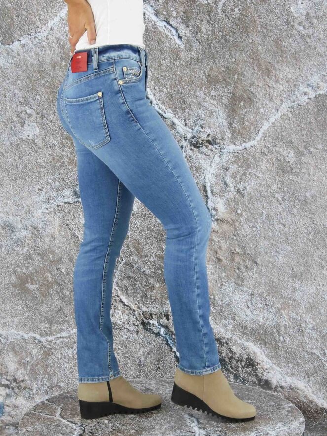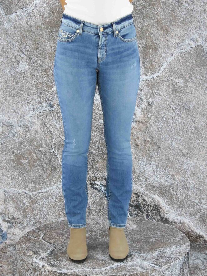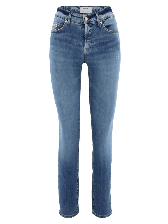 Cambio jeans in a basic jeans color. The jeans are in a 5 pocket model with mother-of-pearl studs on the 5th pocket. These jeans can be washed at 30 degrees.