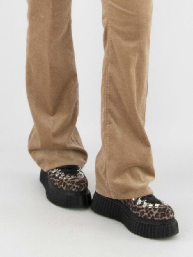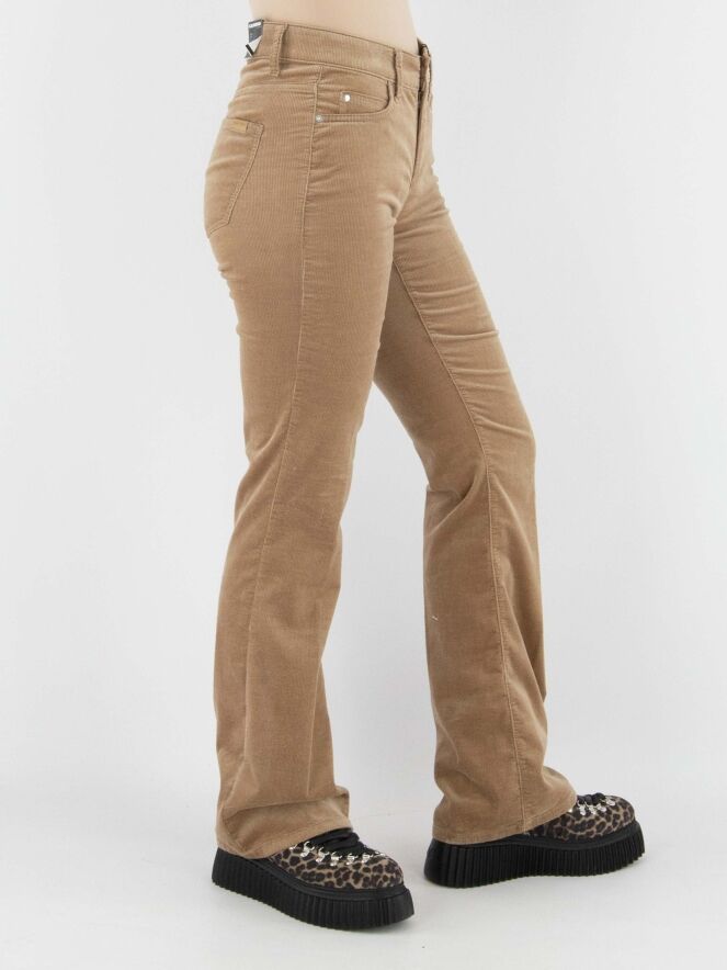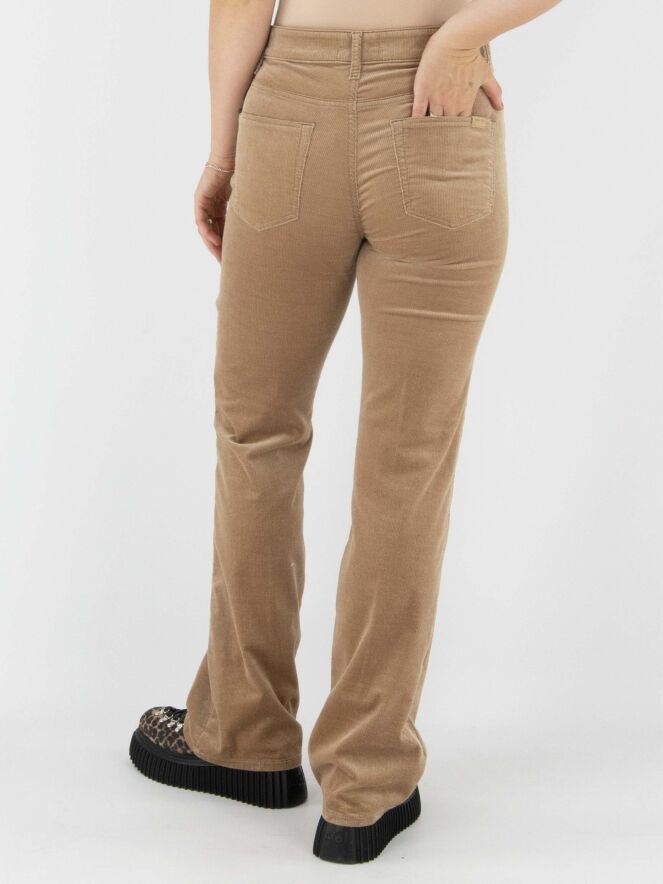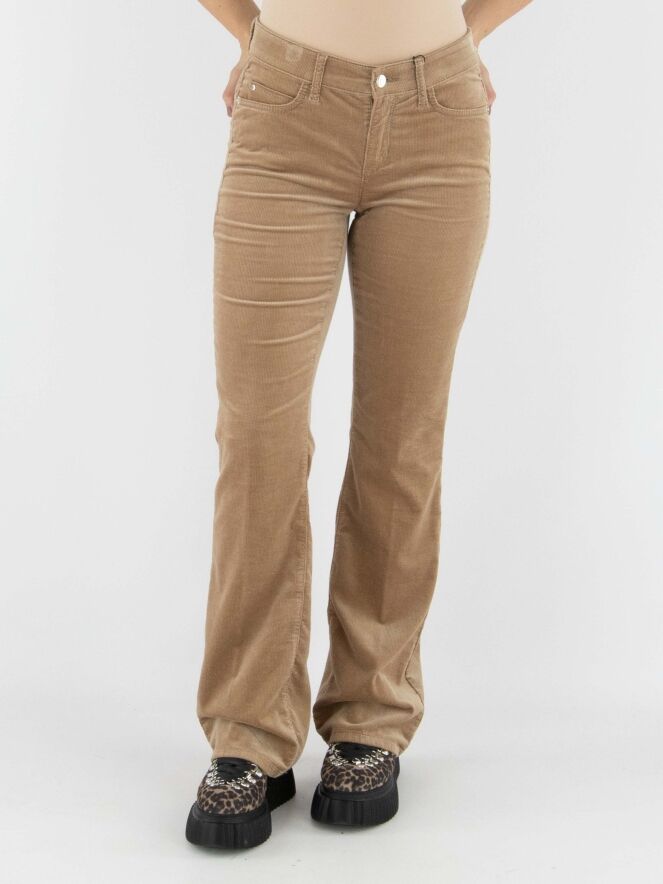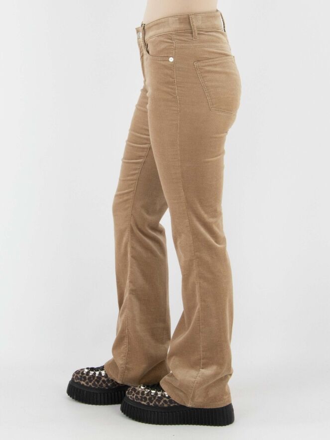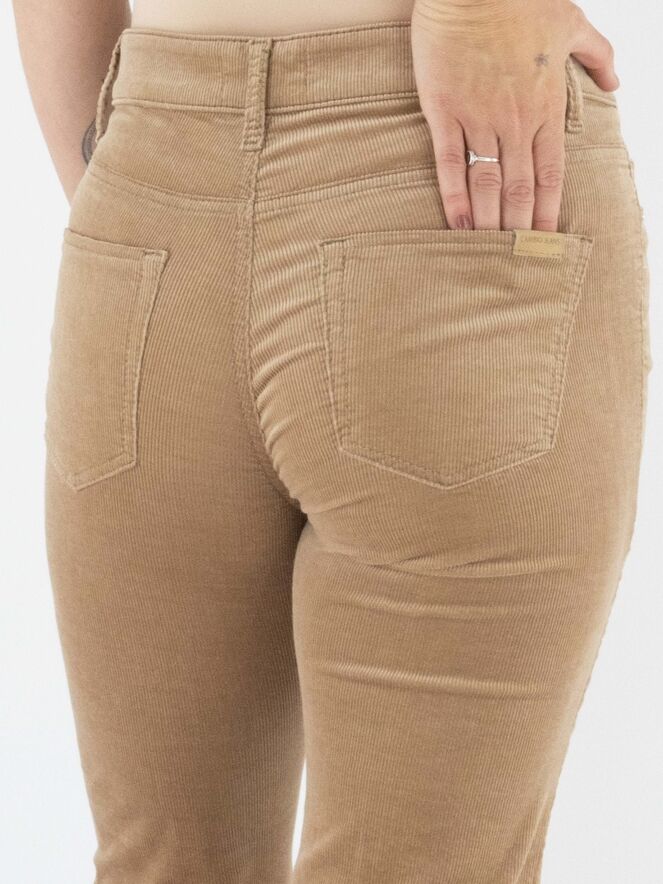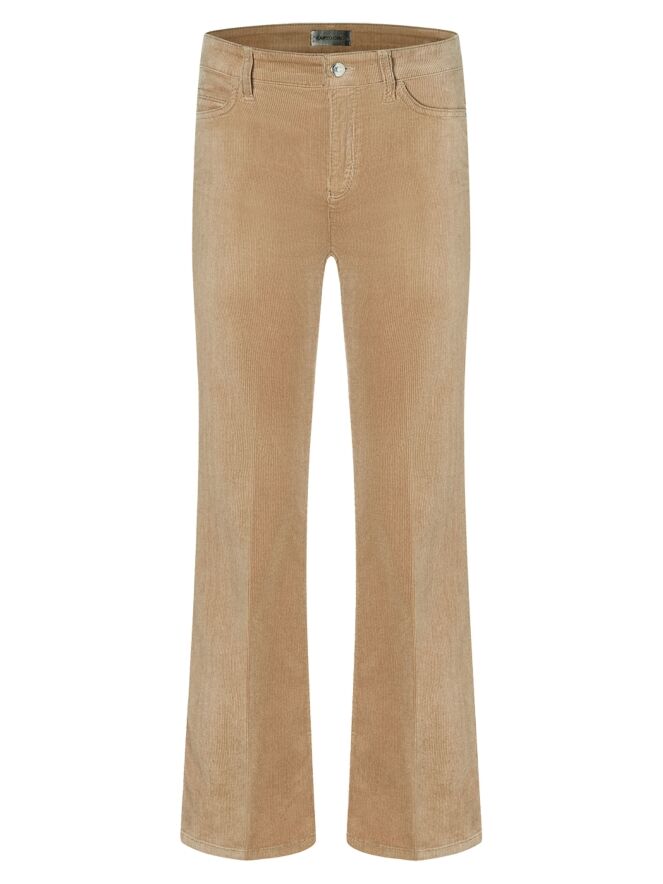Flared ribcord trousers by Cambio in a chic camel shade. This modern 5-pocket style combines a timeless fit with a subtle seventies flair, making it a versatile and elegant addition to any wardrobe. These exclusive designer trousers can be washed at 30 degrees.
