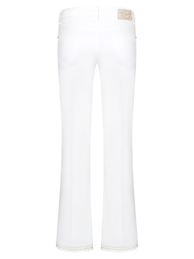 A flared jeans from Cambio in white. The jeans are designed in a 5-pocket model. The edge at the bottom of the legs features a double decorative trim with gold thread. These jeans can be washed at 30 degrees.