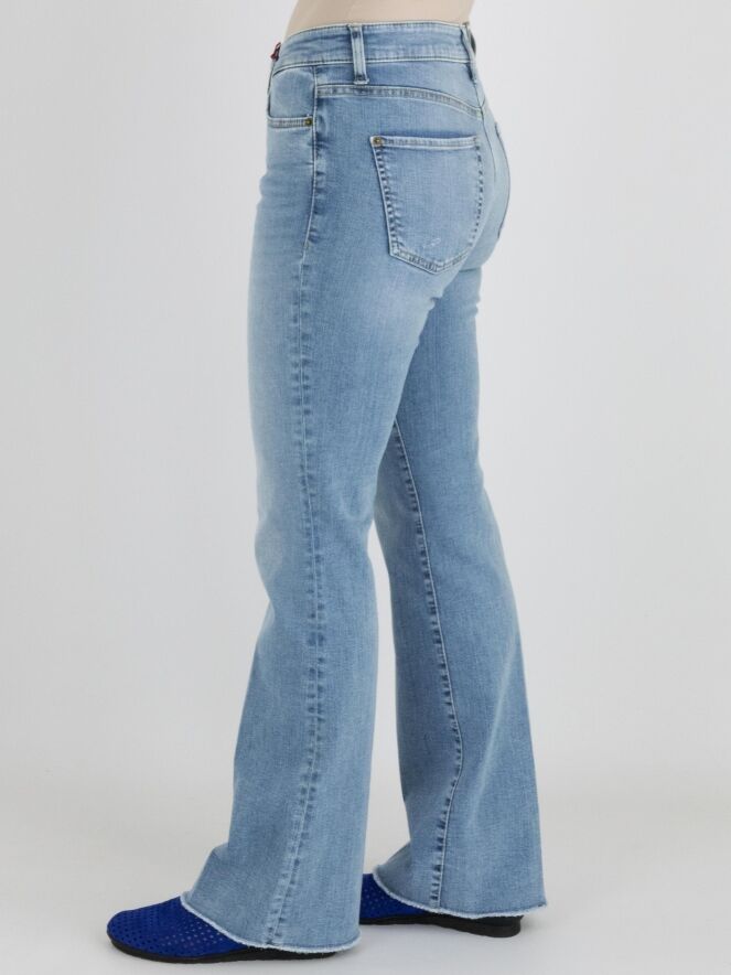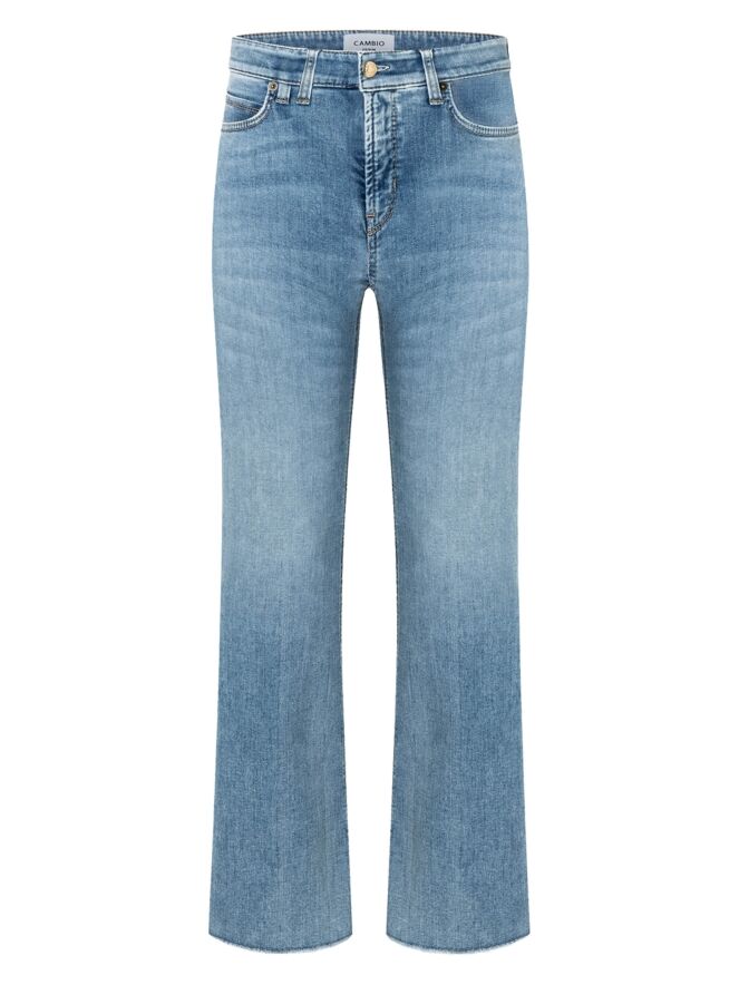 A flared jeans from Cambio in a light denim color. The jeans feature a 5-pocket design, and the bottom of the legs is frayed. This jeans can be washed at 30 degrees.