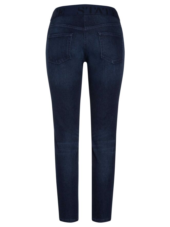 A pair of Cambio jeans in a dark jeans color. The jeans is in a 5 pocket model. In the waist is a wide elastic ribbon and is very elastic. These jeans can be washed at 30 degrees.