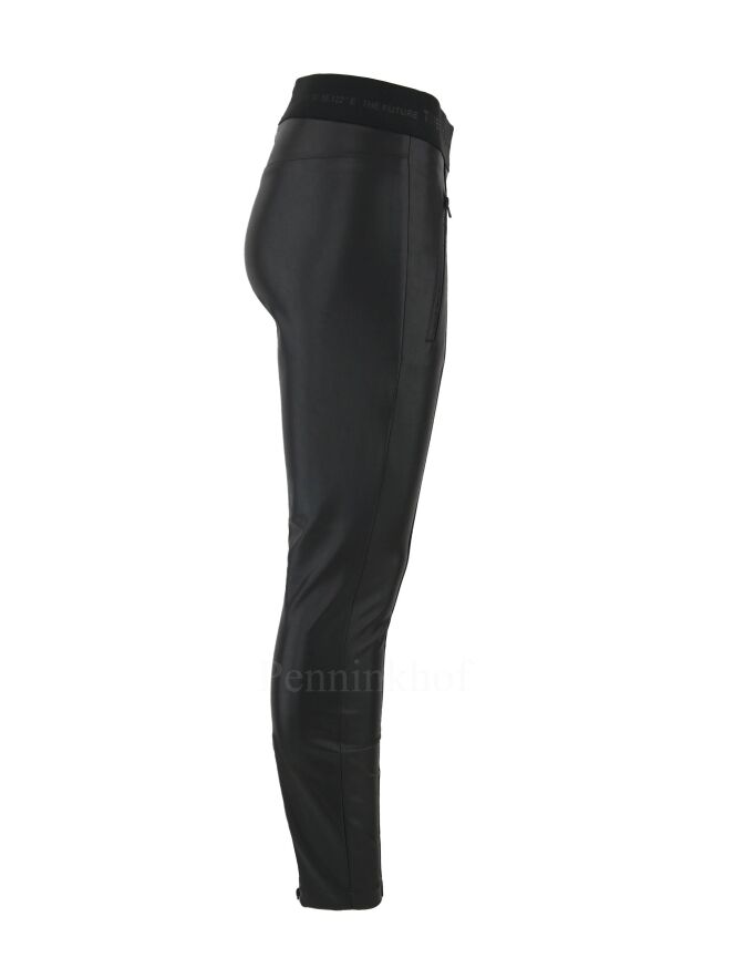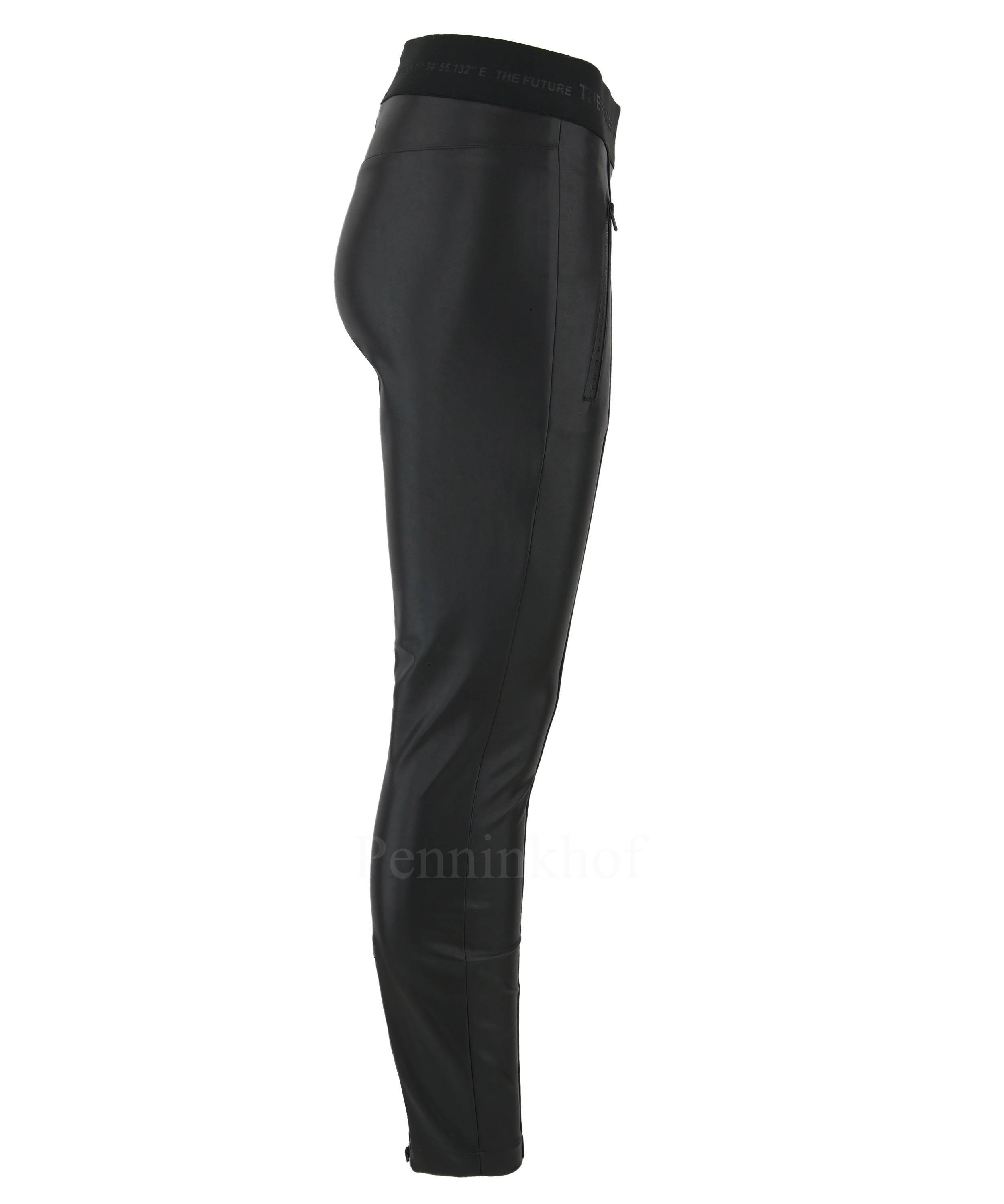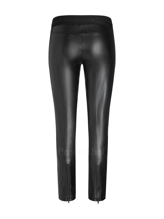 An imitation leather pants from Cambio in the color black. At the waist is a wide elastic band with a text. The front pockets have a zipper. At the bottom of the legs is the same zipper on the sides. These pants can be washed by hand.