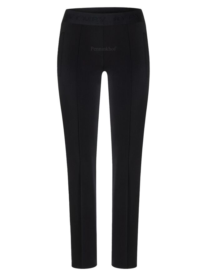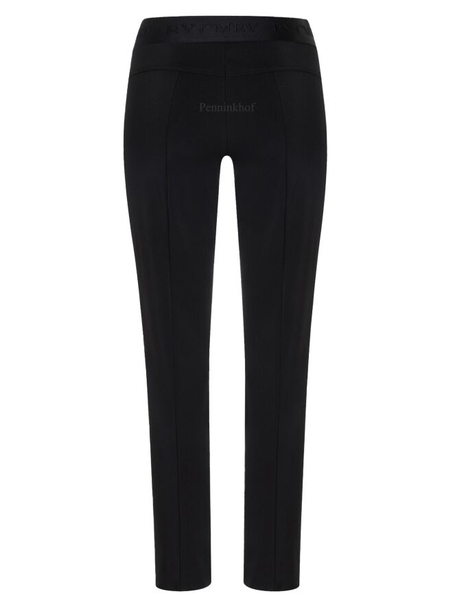 Trousers from Cambio in the colour black. At the waist is an elasticated band. In the middle of d epipes is a stitched seam. The front pockets have a zip fastening. These trousers may be washed at 30 degrees.
