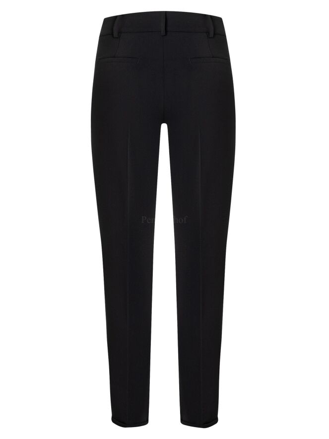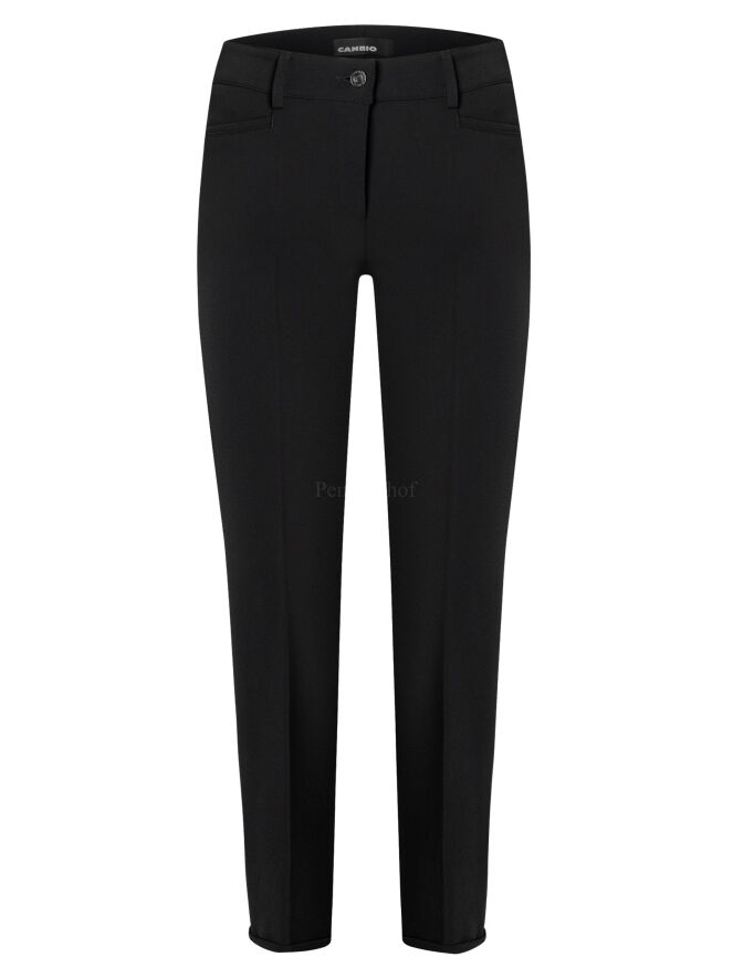 A black pants from the brand Cambio. The pants have a hidden zipper with one button. Along the edge of the pockets on the front is a fine dark brown piping. On the underside is a narrow cover of 1 cm wide. These pants can be washed by hand.