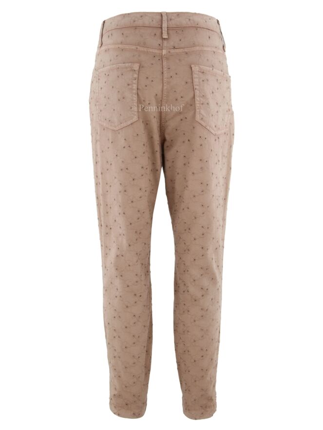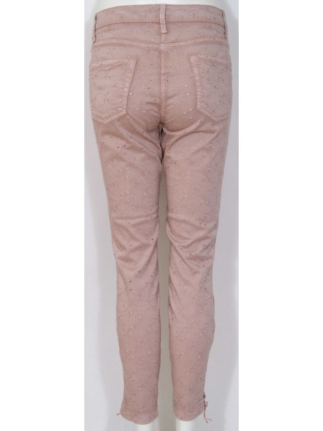 A trouser by the brand cambio in the color old pink. The trouser has a woven design with flowers and is slightly perforated. At the bottom of the pipeis a split of 15 cm high with a lace there in processed. These trouser can be washed at 30 degrees