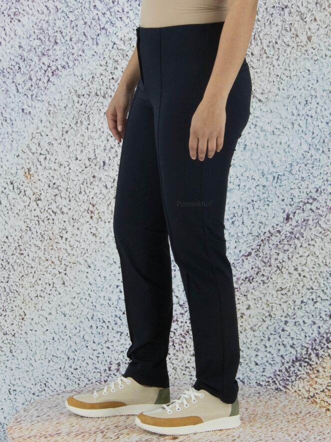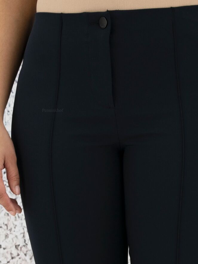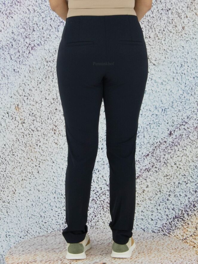 Cambio pants in a navy blue color. At the waist is an elastic band. There is a stitching seam across the middle of the legs. These pants can be hand washed.