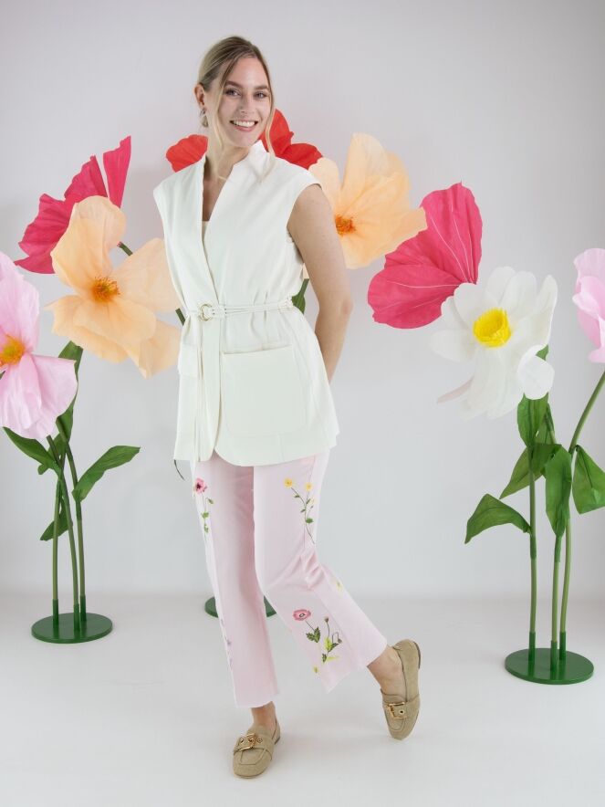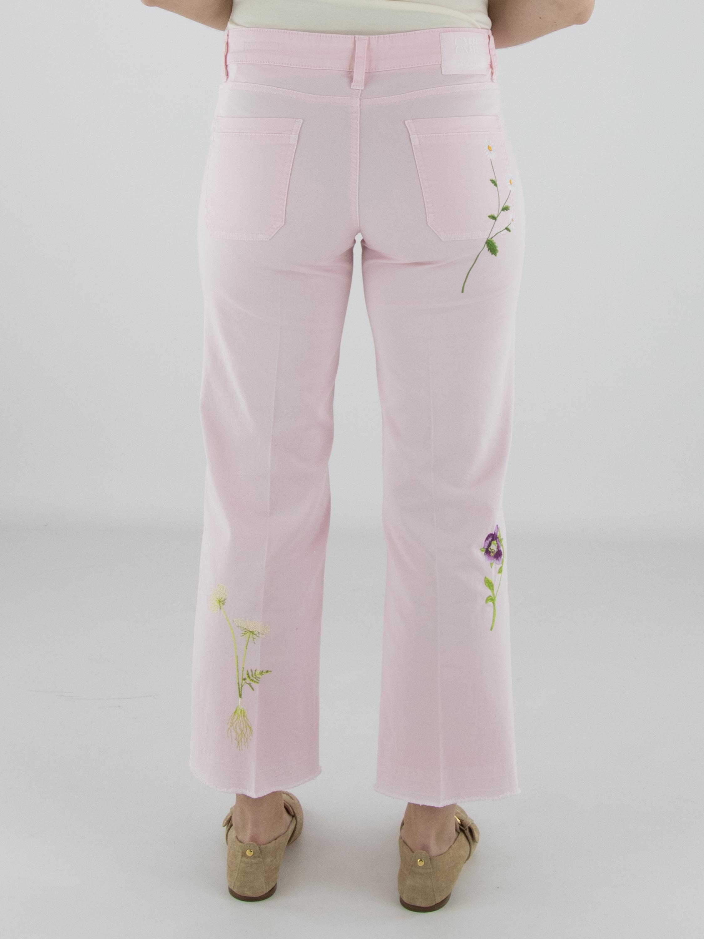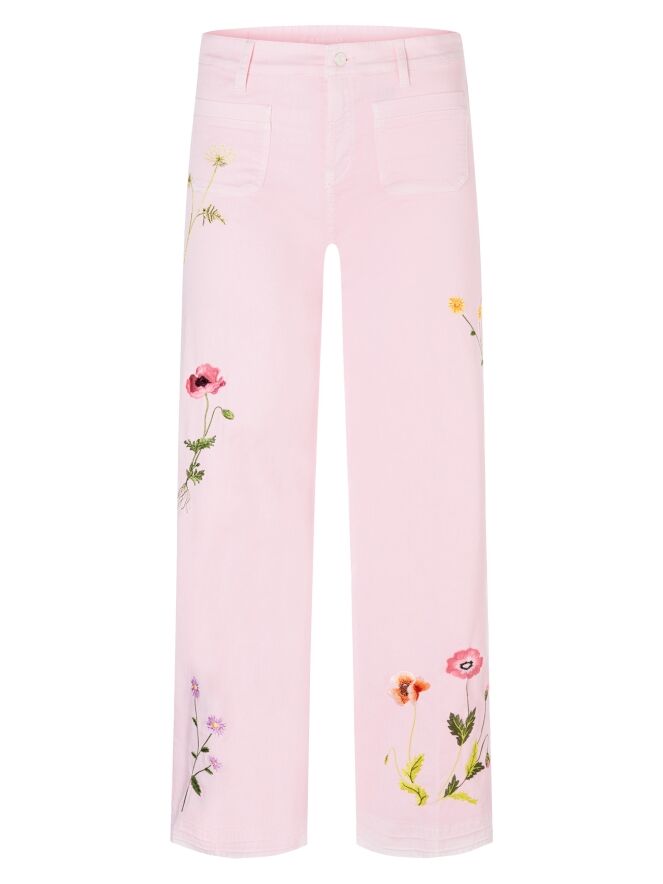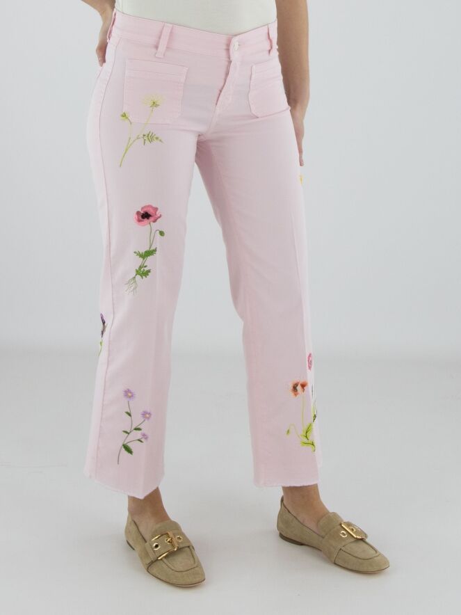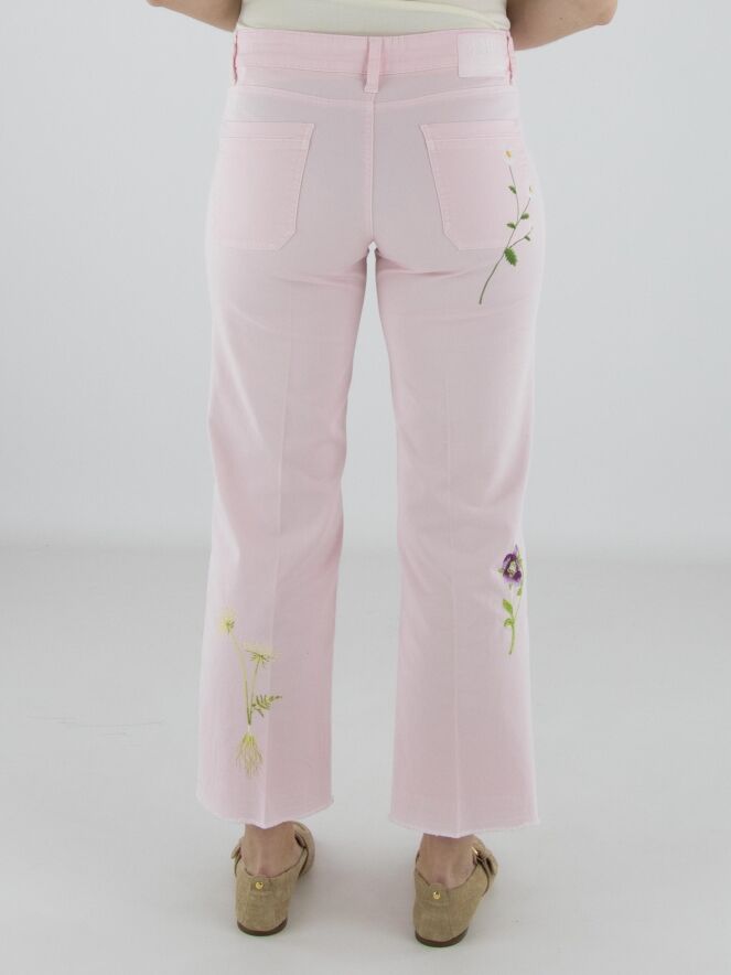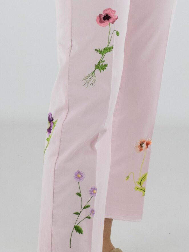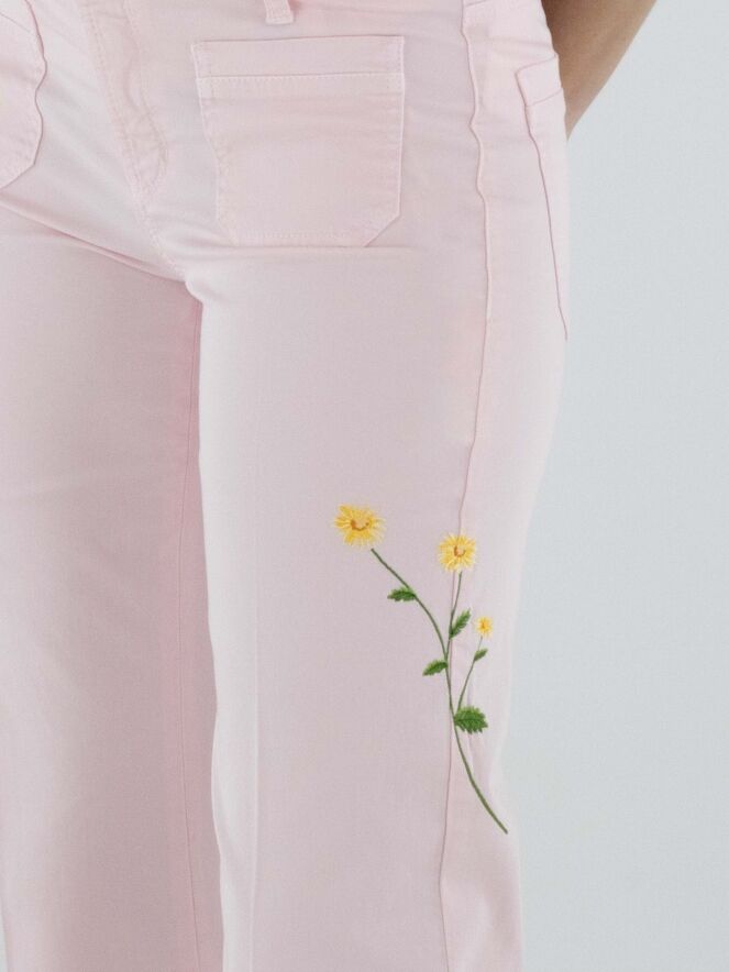 Jeans by Cambio in a soft pastel pink shade. Just below the waistband, two decorative pockets at the front add a playful touch. The legs are adorned with delicate floral embroidery, enhancing the feminine character of the design. A pressed crease along the center of the legs lends an elegant finish. These trousers can be washed at 30 degrees.