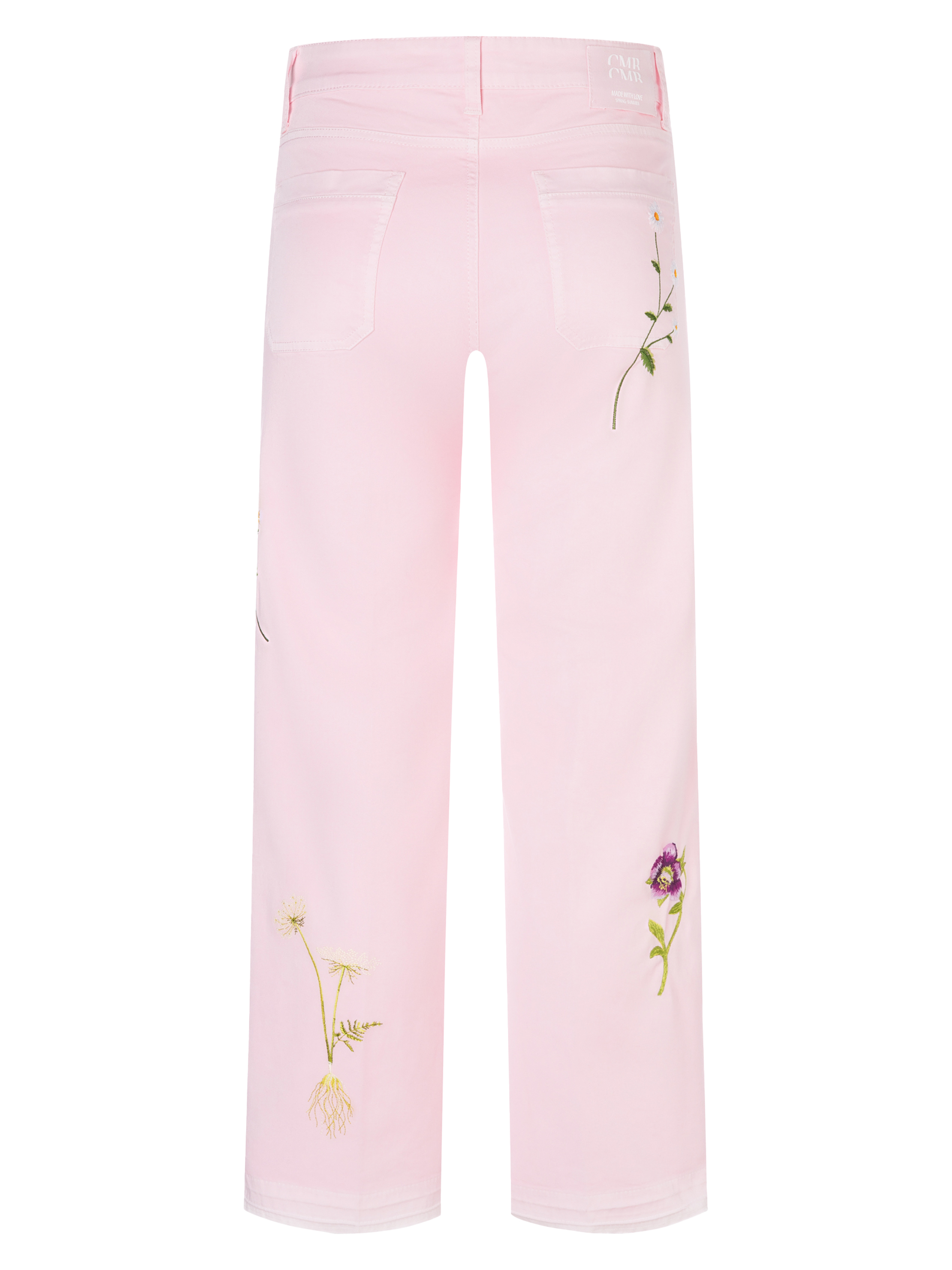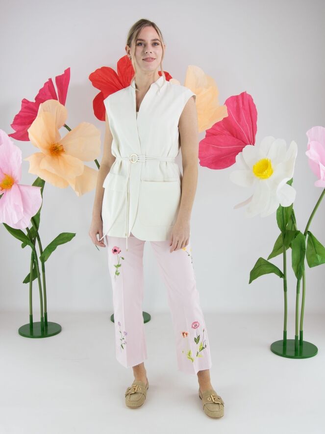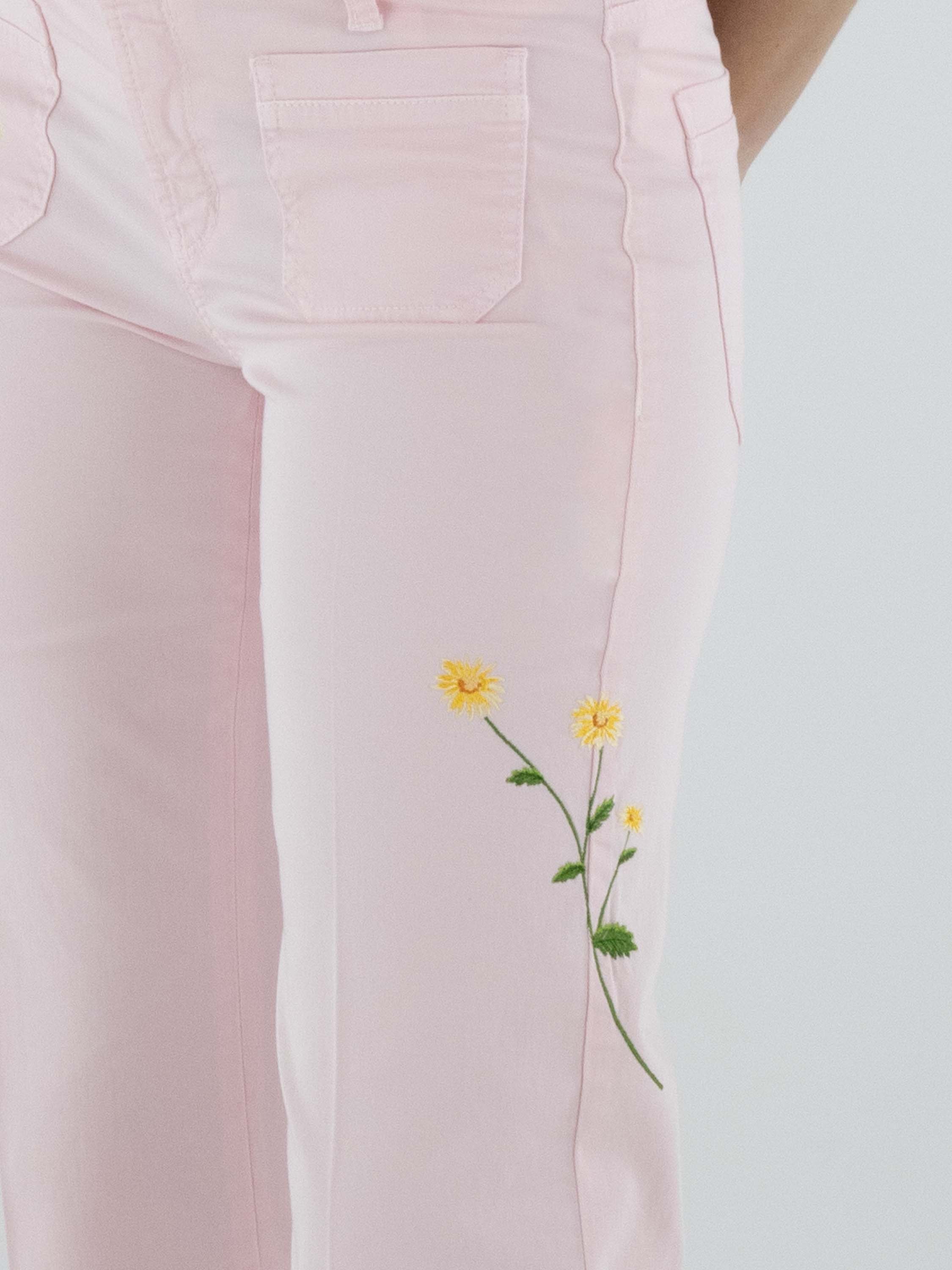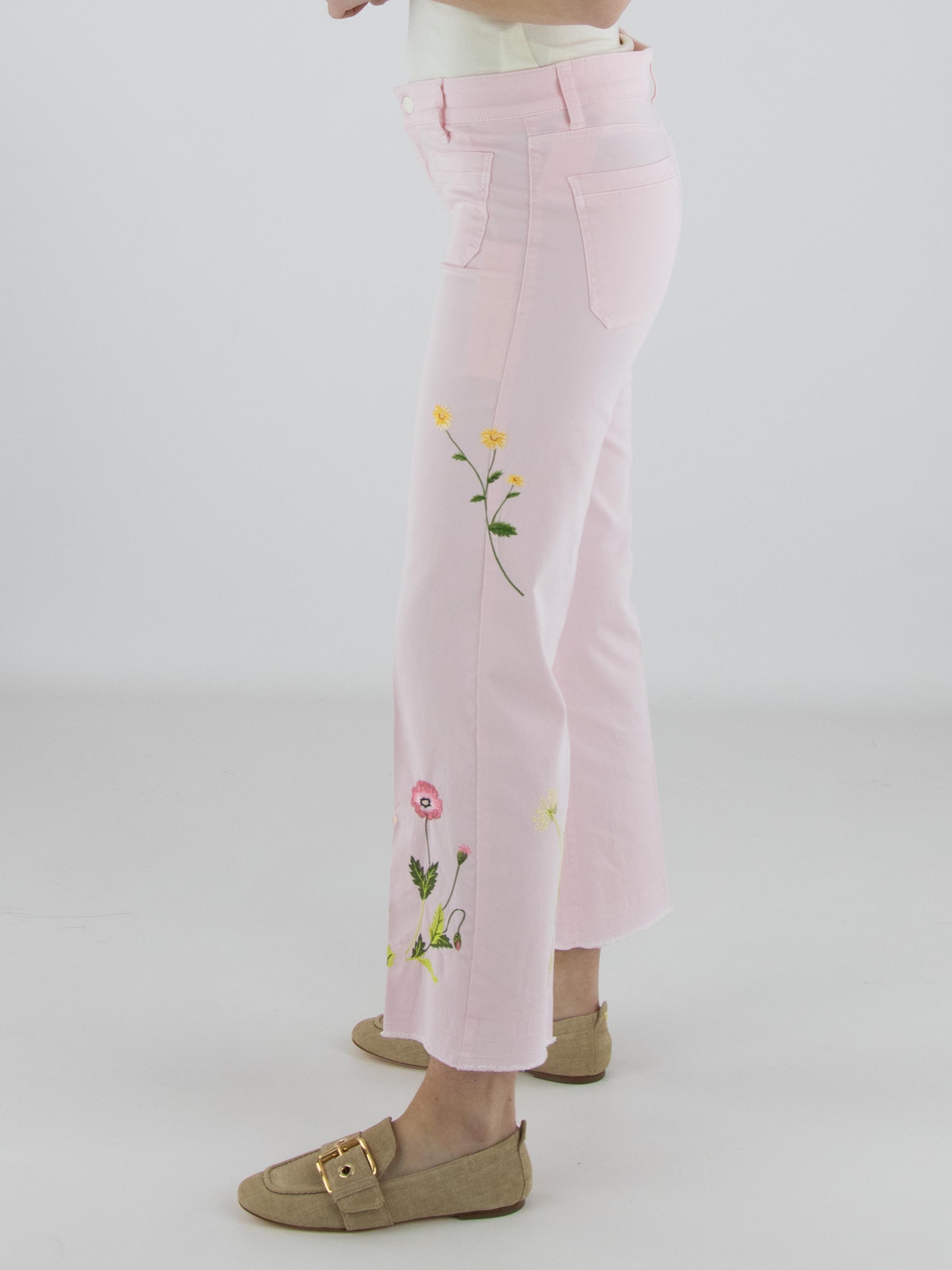 Jeans by Cambio in a soft pastel pink shade. Just below the waistband, two decorative pockets at the front add a playful touch. The legs are adorned with delicate floral embroidery, enhancing the feminine character of the design. A pressed crease along the center of the legs lends an elegant finish. These trousers can be washed at 30 degrees.