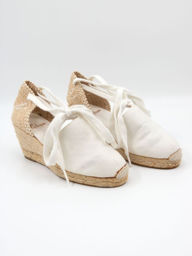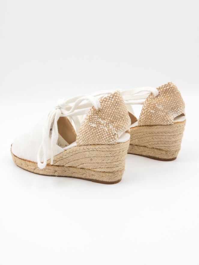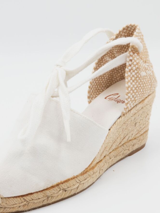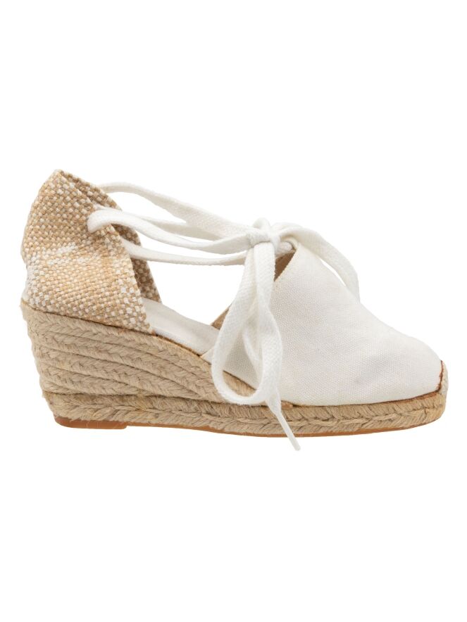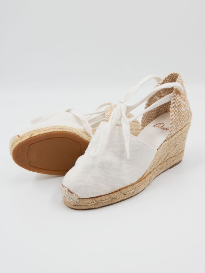 An espadrille by Castagner with a medium-height wedge heel in off-white. The heel strap is braided in white and beige.