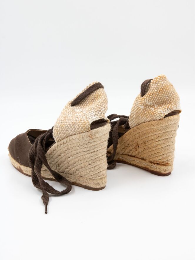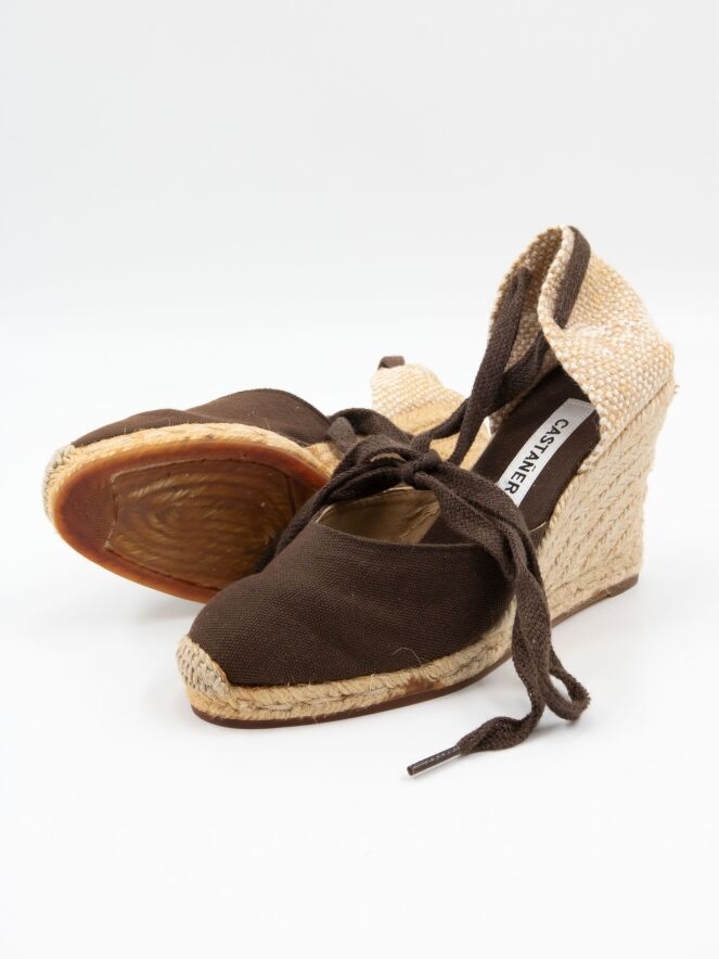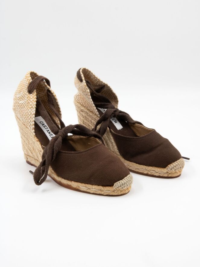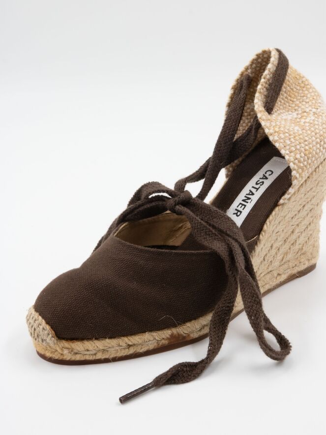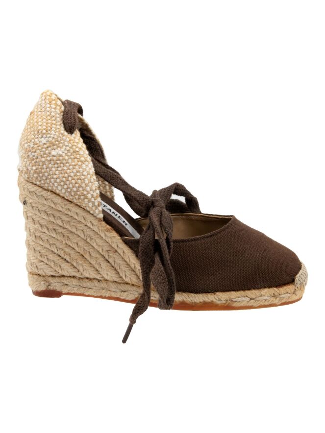 An espadrille from Castagner with a high wedge heel in mocha brown. The heel strap is braided in white and beige.