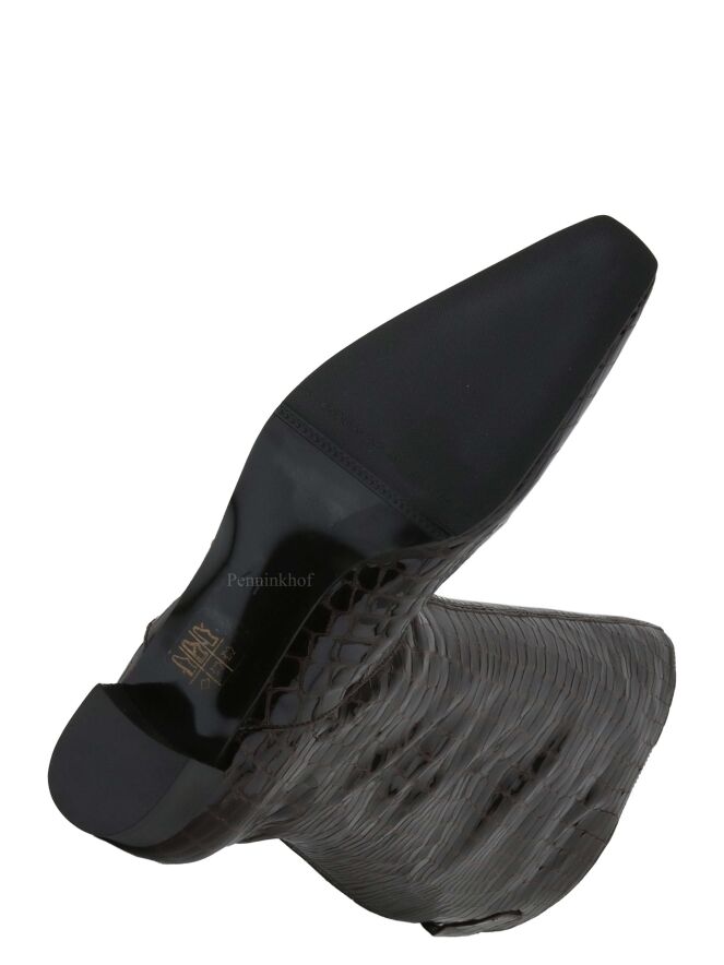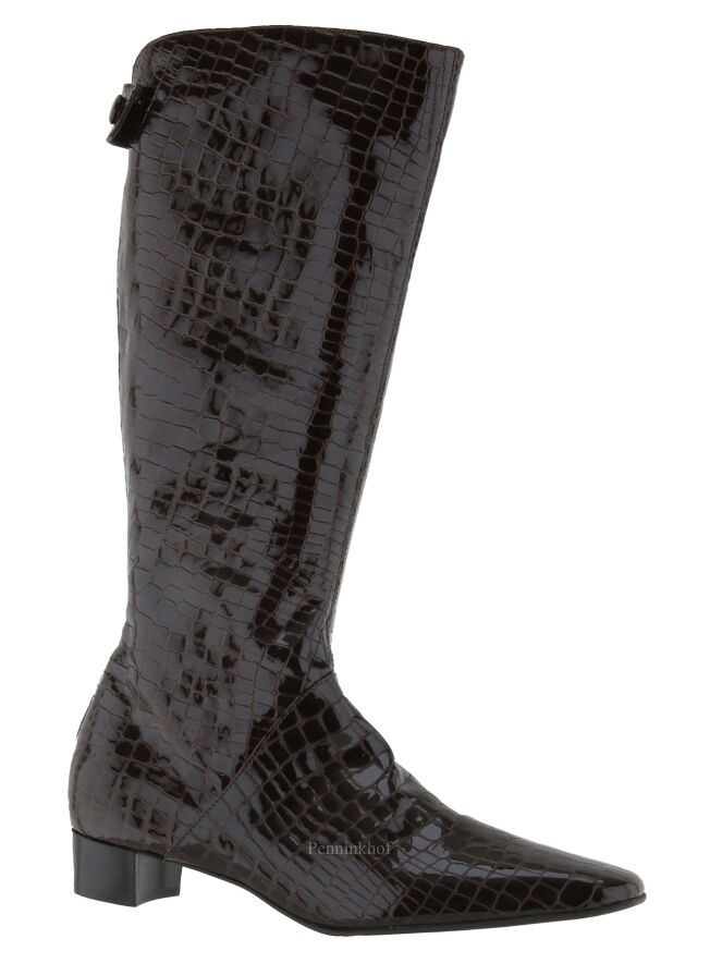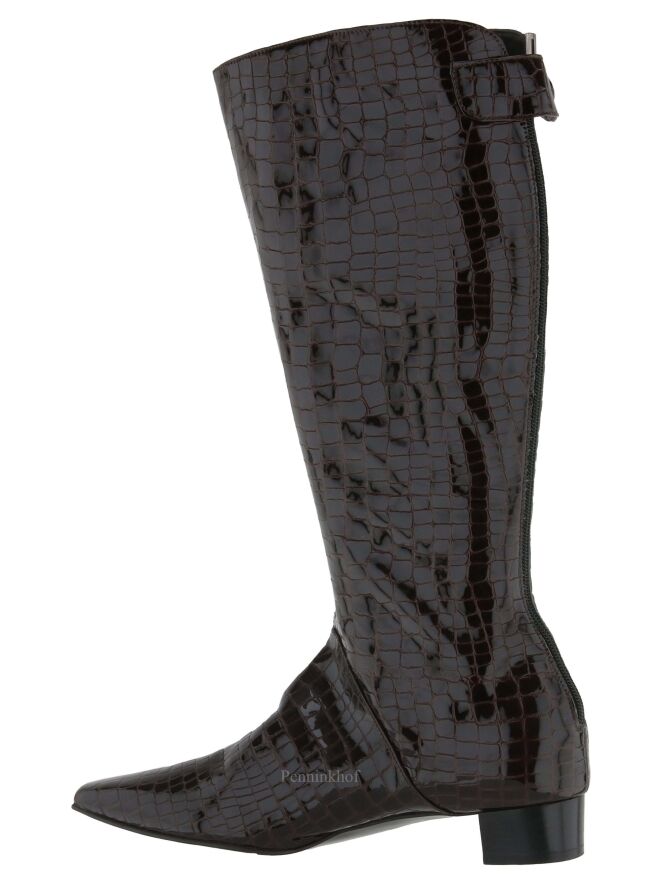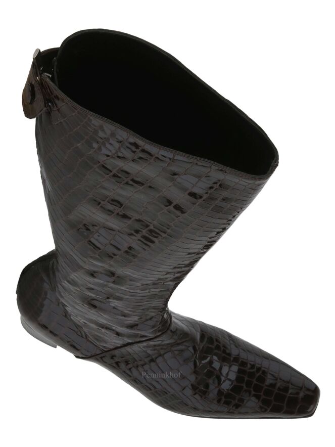 A boot from Celestino´s in a croco print in a mocha brown color. At the back of the shaft is the zipper. The inside of the shaft is lined with leather.