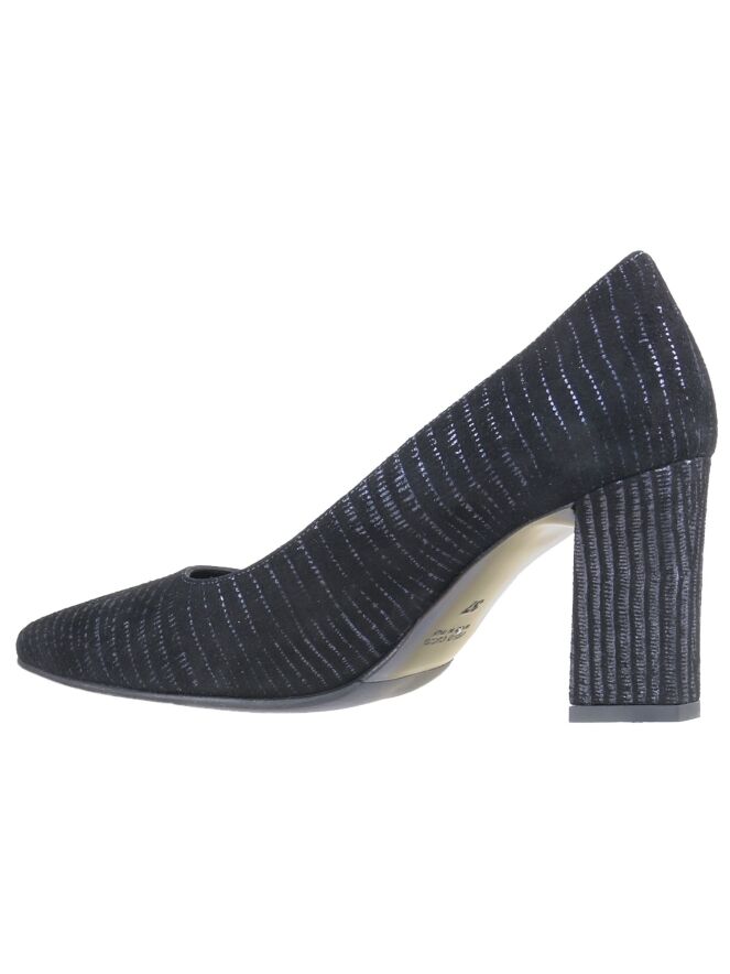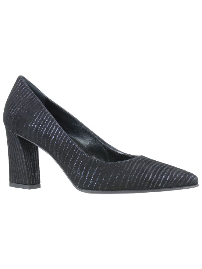 A pump of the brand Cervone in a graphic stripes print in Navy Blue with Midnight blue. The pump has a pointed toe and an elegant block heel. The inside is lined with leather.