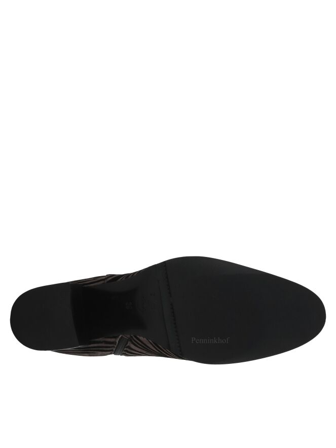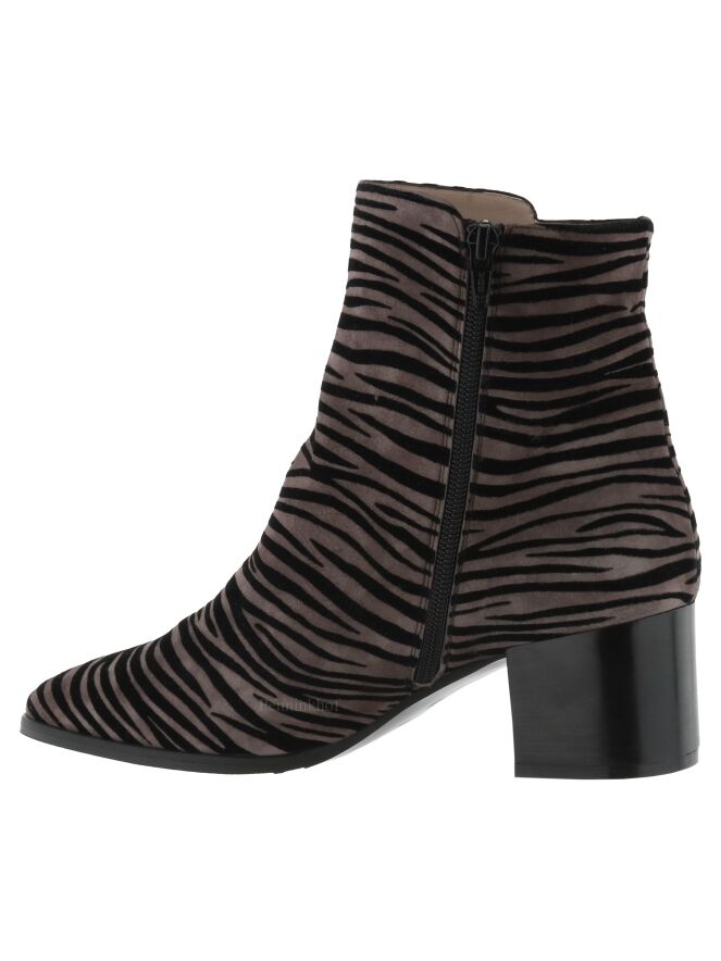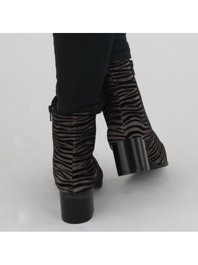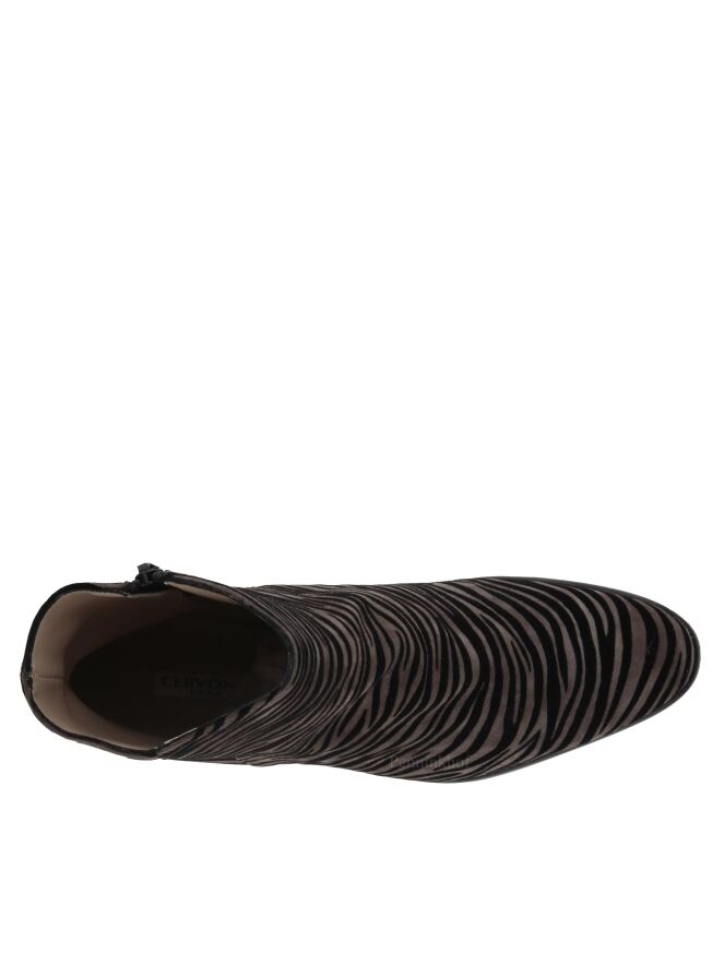 A short boot from Cervone in a zebra print with the colors brown and black. On the inside is a black zipper in the shaft. The boot has a slightly pointed toe and the inside is lined with leather.