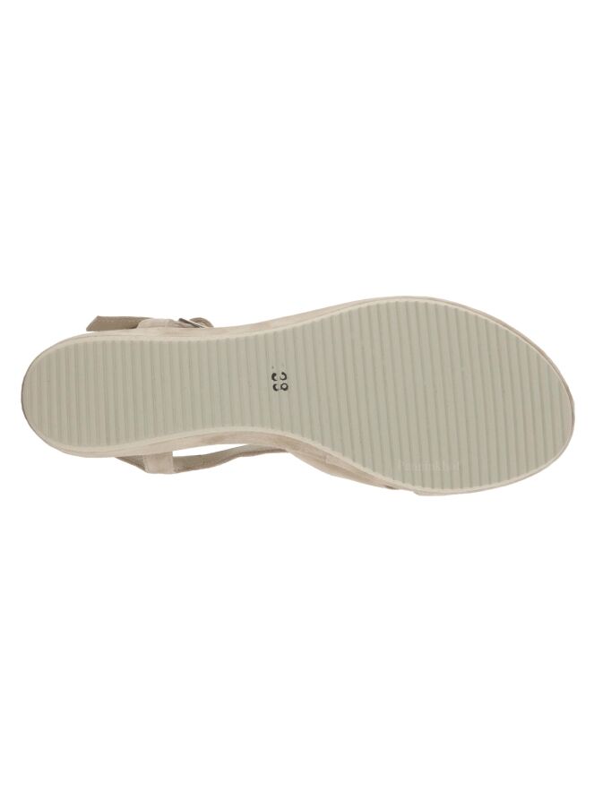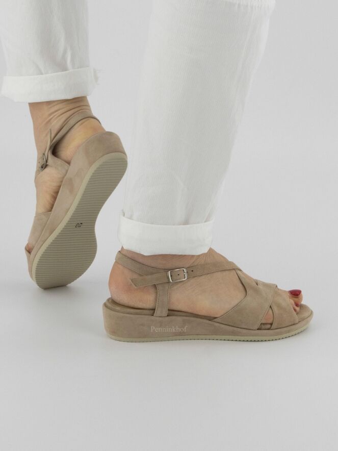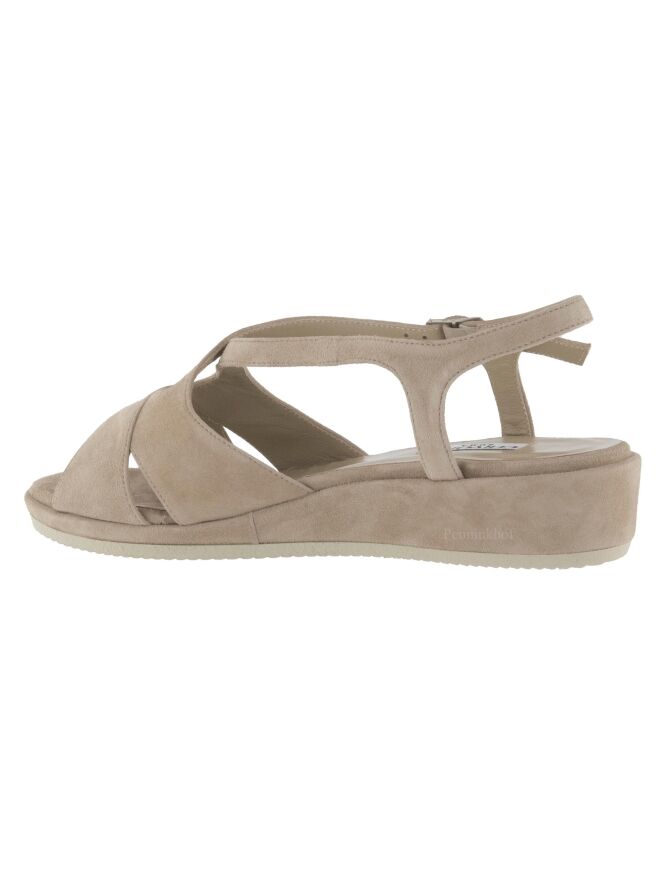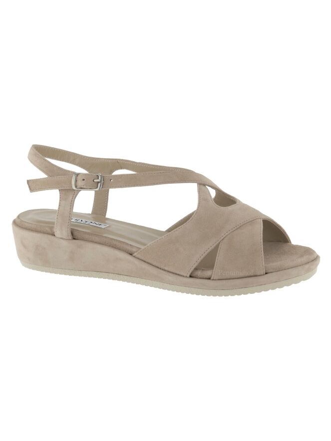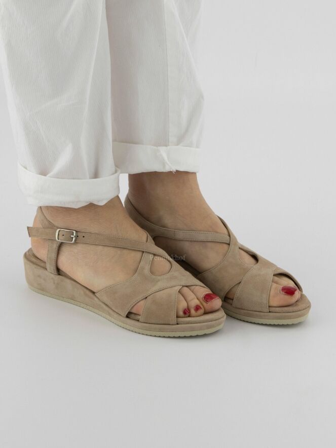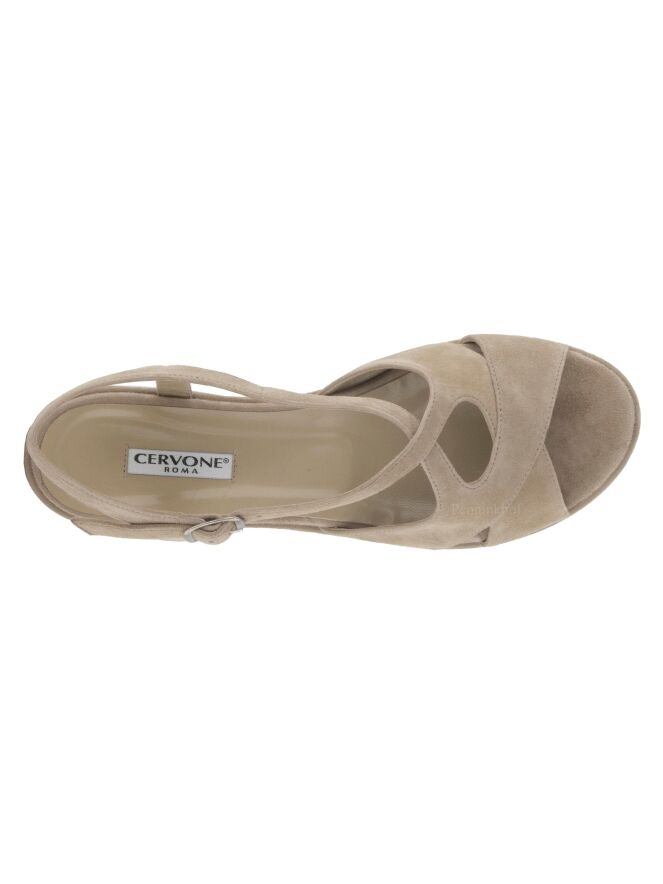 An open sandal from Cervone in the color sand. From the forefoot is an adjustable strap along the sides of the foot to the heel. The wedge heel is covered in the same material as the sandal.
