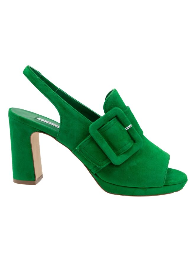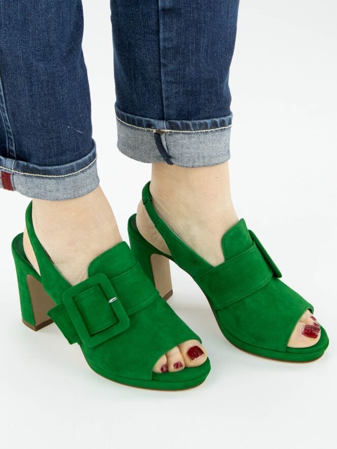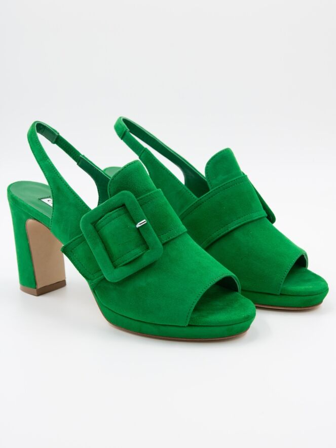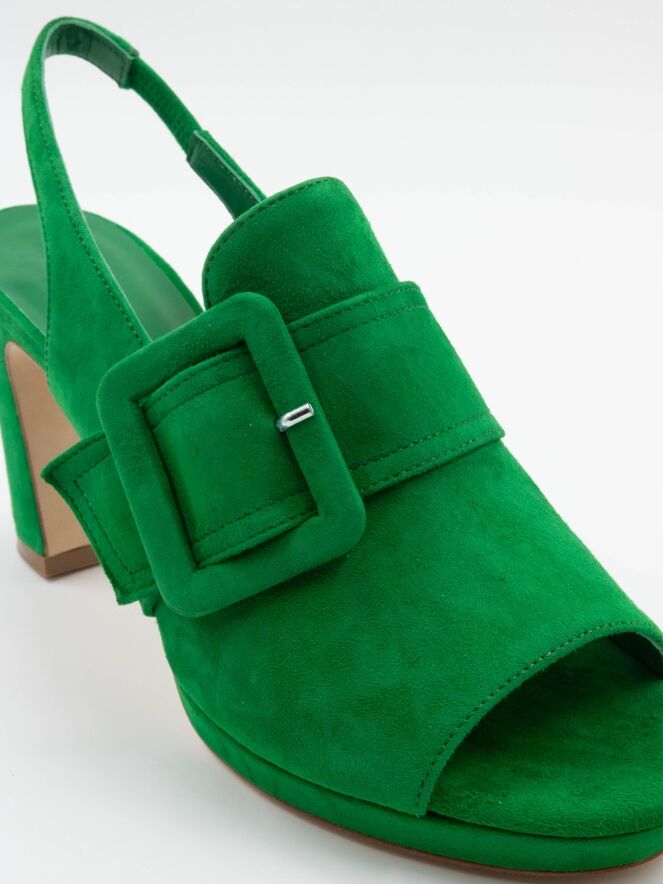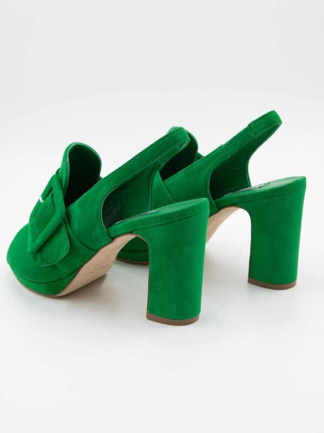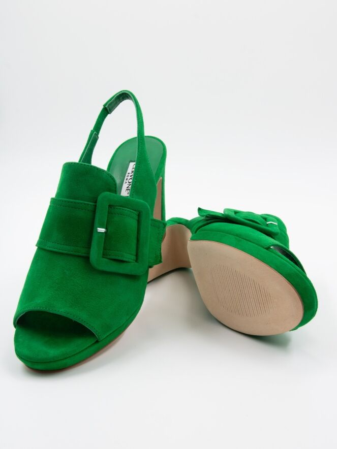 An open-toe pump from Cervone in a green color. There is a large rectangular buckle over the forefoot in the same color as the shoe. The pump has an open toe, and the heel strap has an elastic part.